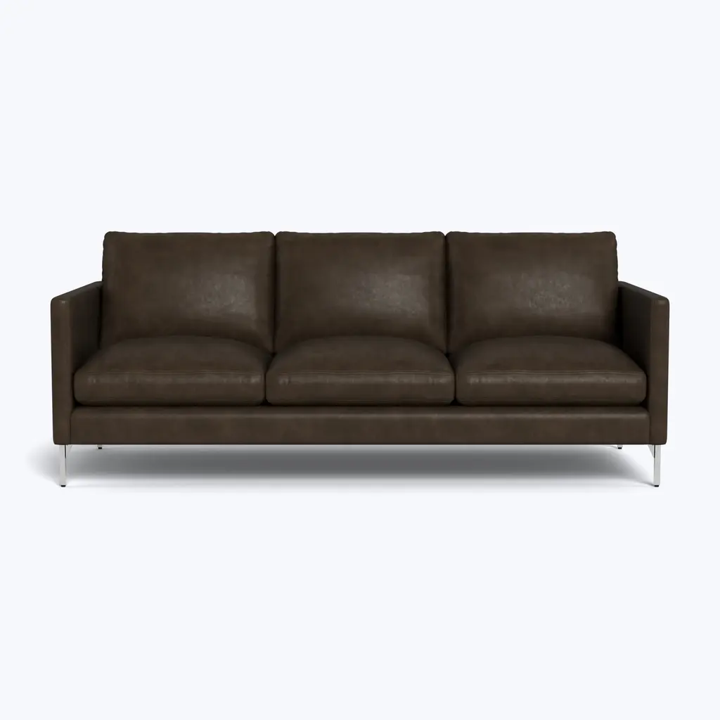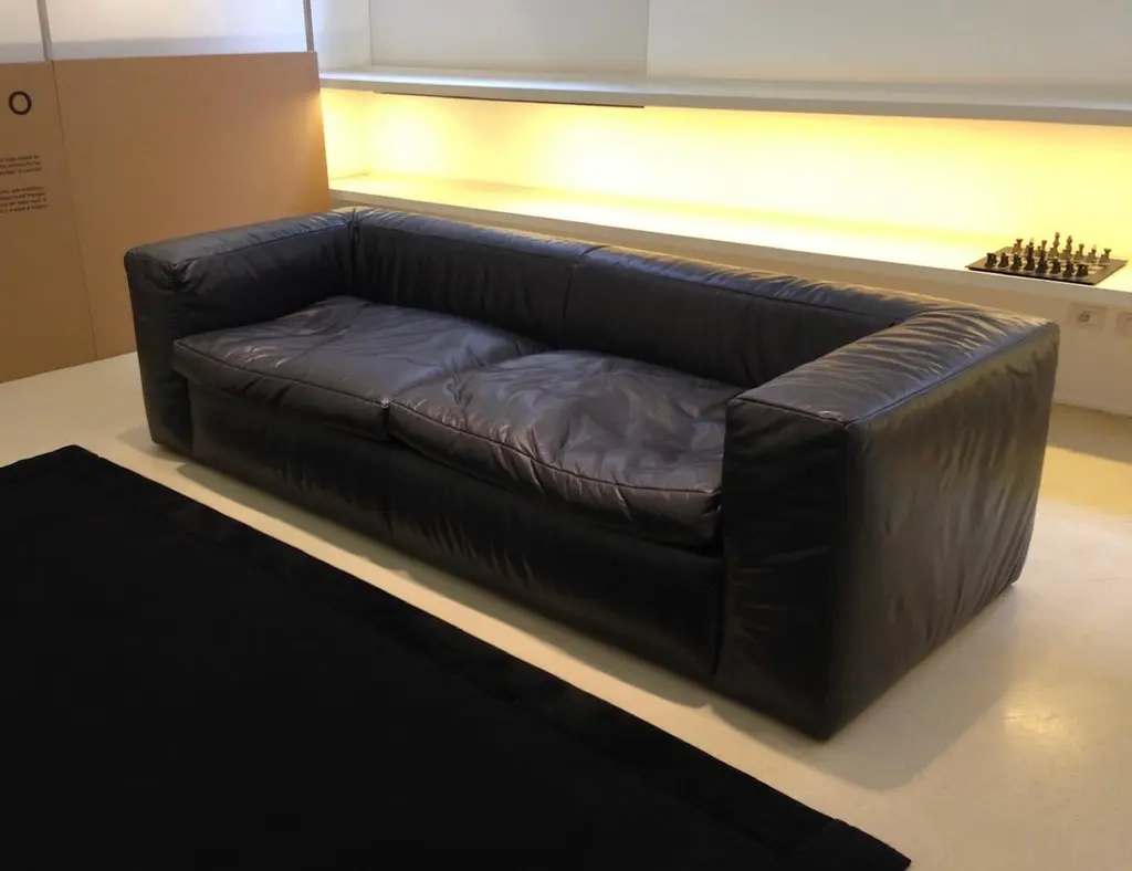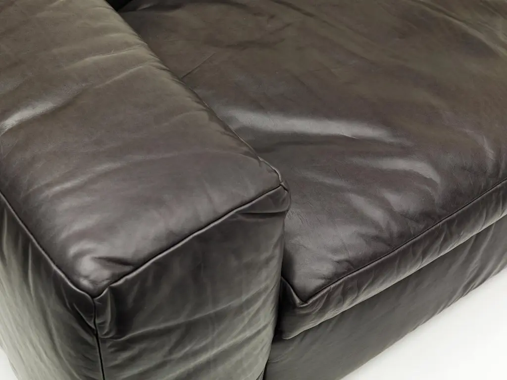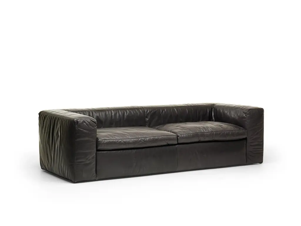 A simple and essential sofa that integrates a sophisticated comfort and a refined image through the careful study of proportions, filling materials and surface treatment. It is a mint product that combines the flair of something lived-in with the appeal of modern performance. The soft surfaces and extra flesh of a sofa that has lost its shameless turgidity are the sign of a lasting and mature elegance.Solid poplar, poplar plywood and birch plywood internal frame. Elastic support straps, polyurethane core, dacron lining, leather cover, down-filled seat cushions. Fabrics and customer fabric covers available. Other sizes available.