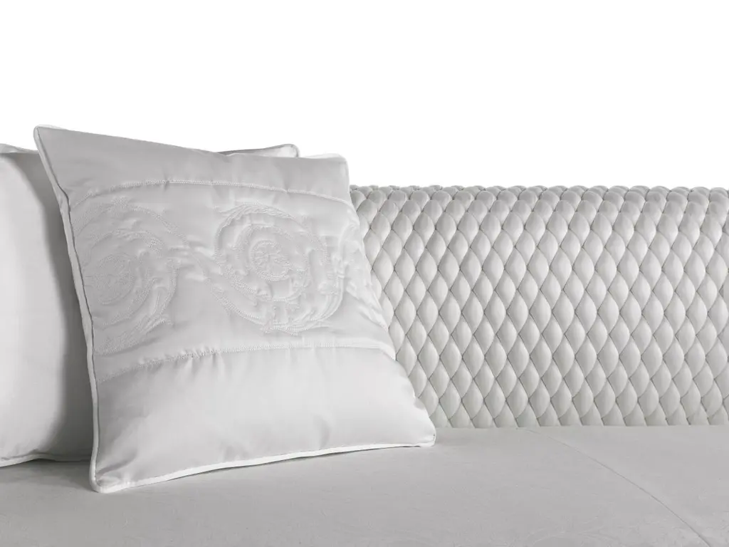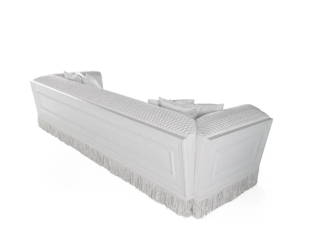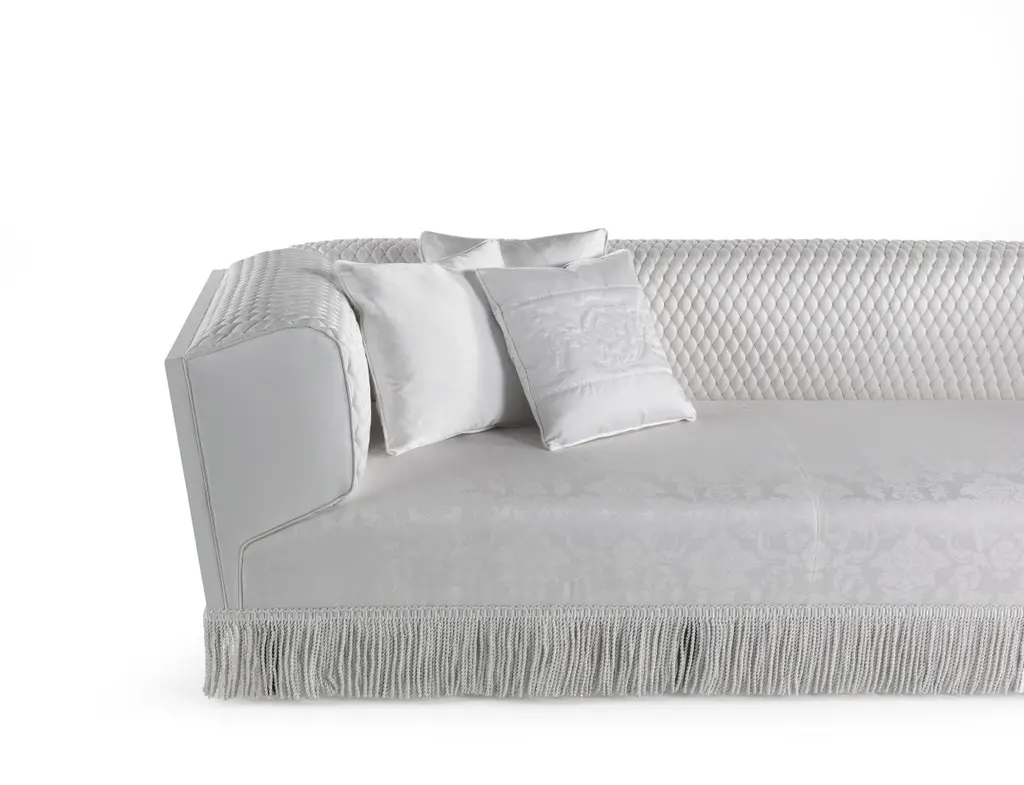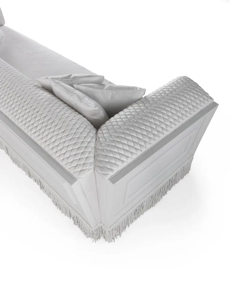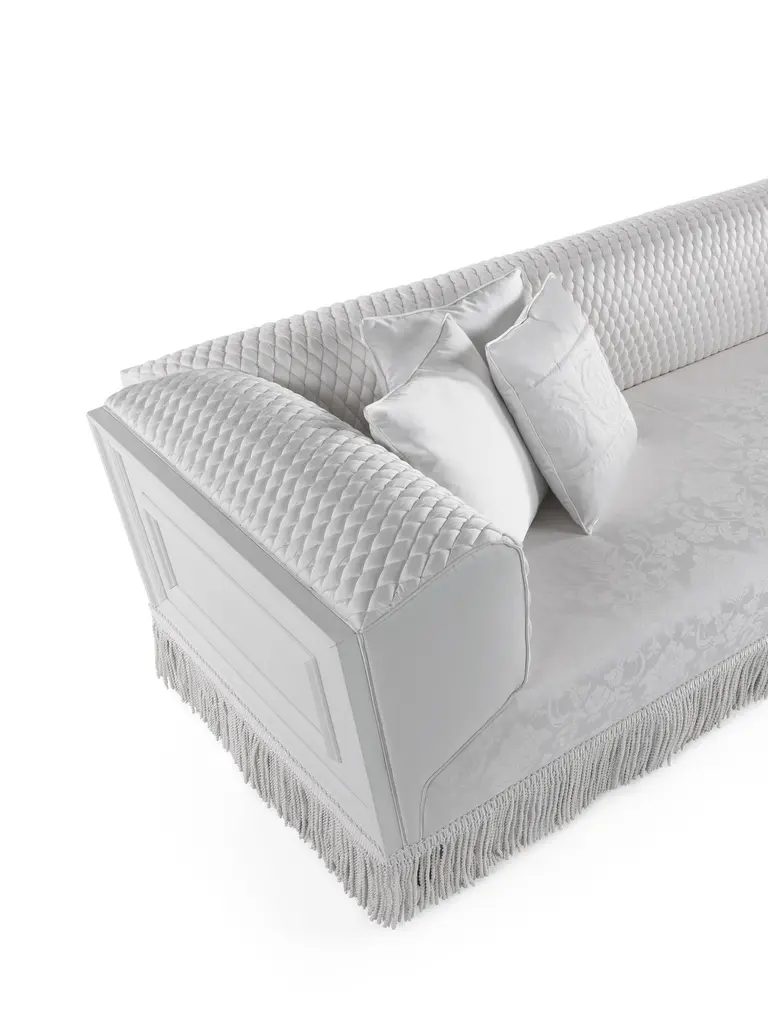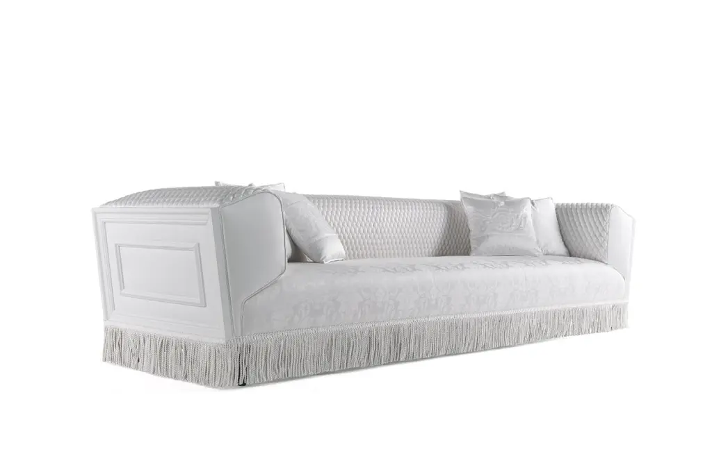 Clean and elegant elements define Saturno. a refined line of furniture whose soft shapes are enhanced by the precious workmanship of the backrest and by classic details such as the fringes: precious elements that tell the sartorial skill that characterizes the entire collection.Saturno 3-seater sofa with structure in beechwood and multilayer wood. Padding in foam. Upholstery in fabric MIL.19.03 and MIL.19.04 with quilted backrest. Decorative frames on the external structure, upholstered in white leather 19.18. Decorative fringe.N° 6 pillows included:N° 4 pillows 50x50 cm in fabric MIL.19.04. N° 2 pillows 50x50 cm with embroidery in fabric MIL.19.04.