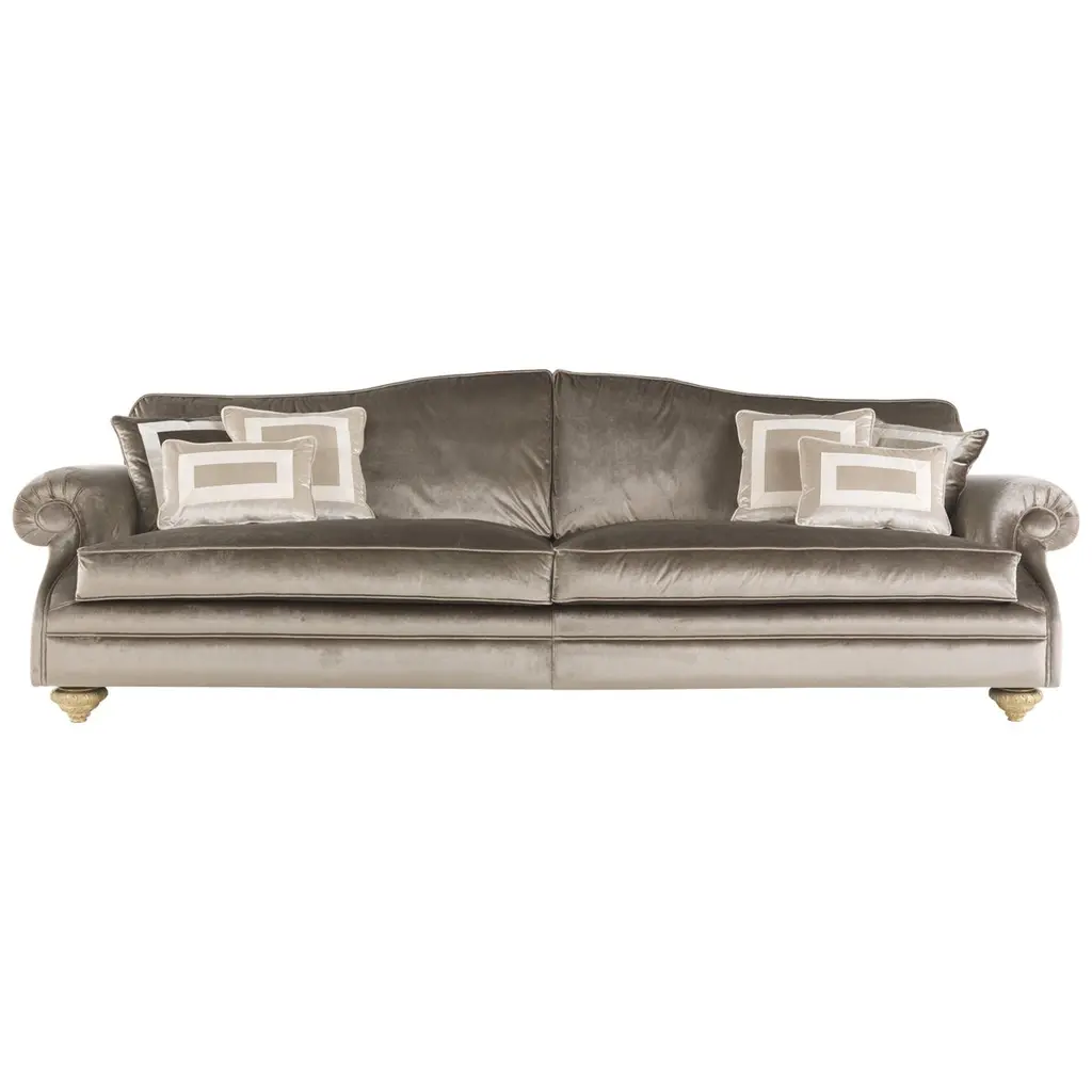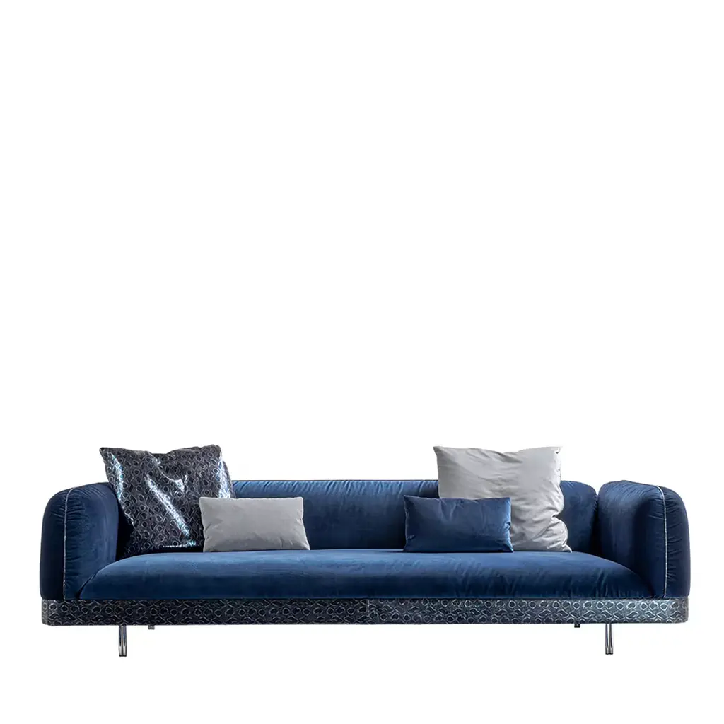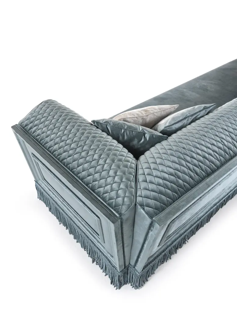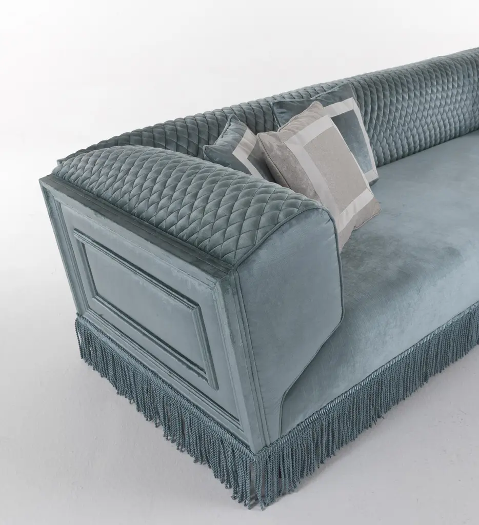 Clean and elegant elements define Saturno. a refined line of furniture whose soft shapes are enhanced by the precious workmanship of the backrest and by classic details such as the fringes: precious elements that tell the sartorial skill that characterizes the entire collection.Saturno 3-seater sofa with structure in beechwood. Padding in foam. Upholstery in fabric 17.002 with quilted backrest. Decorative frames on the external structure. N° 6 pillows 50x50 cm included.