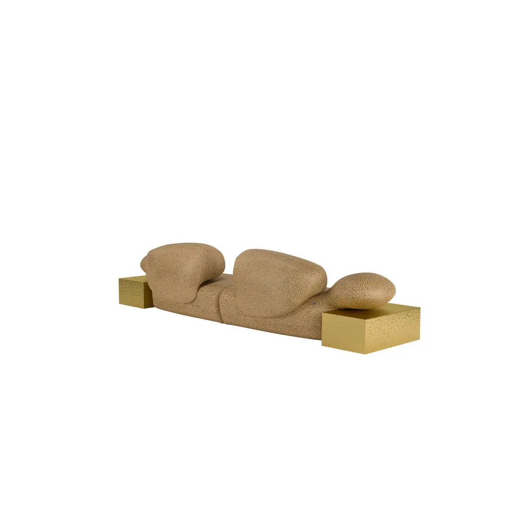 Against the minimalist design concept and characterized by a free use of color and shapes, the modernism movement sparks the impulse for Malabar designers to conceive this future classic sofa.Within this artistic-flavored space, the Viv Id sofa becomes a canvas for artistic expression, transforming your living space into a curated gallery of breathtaking masterpieces. Dressed in bouclé, its melted gold brass structure gives the split-level aesthetic sense of deluxe while it can provide a functionality of a side table. This meticulously crafted piece exudes a distinct aura of creativity, showcasing the harmonious marriage of form, function, and artistic ingenuity.