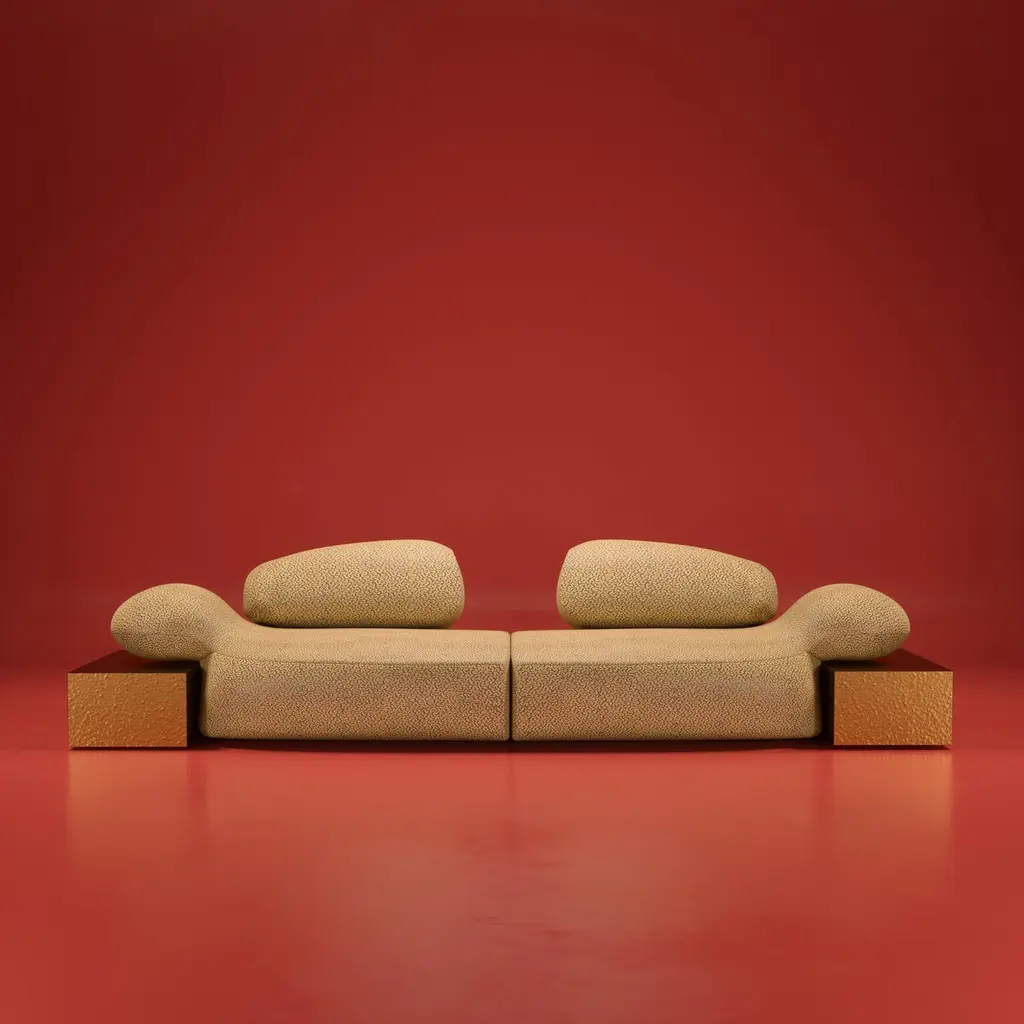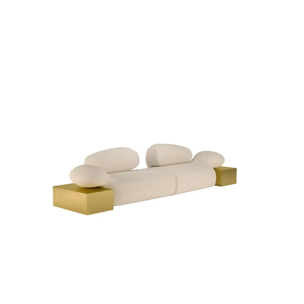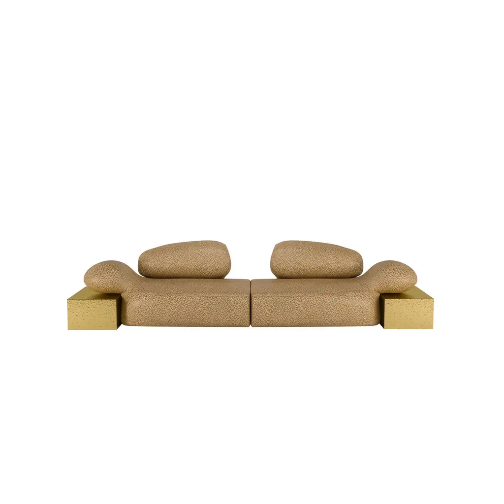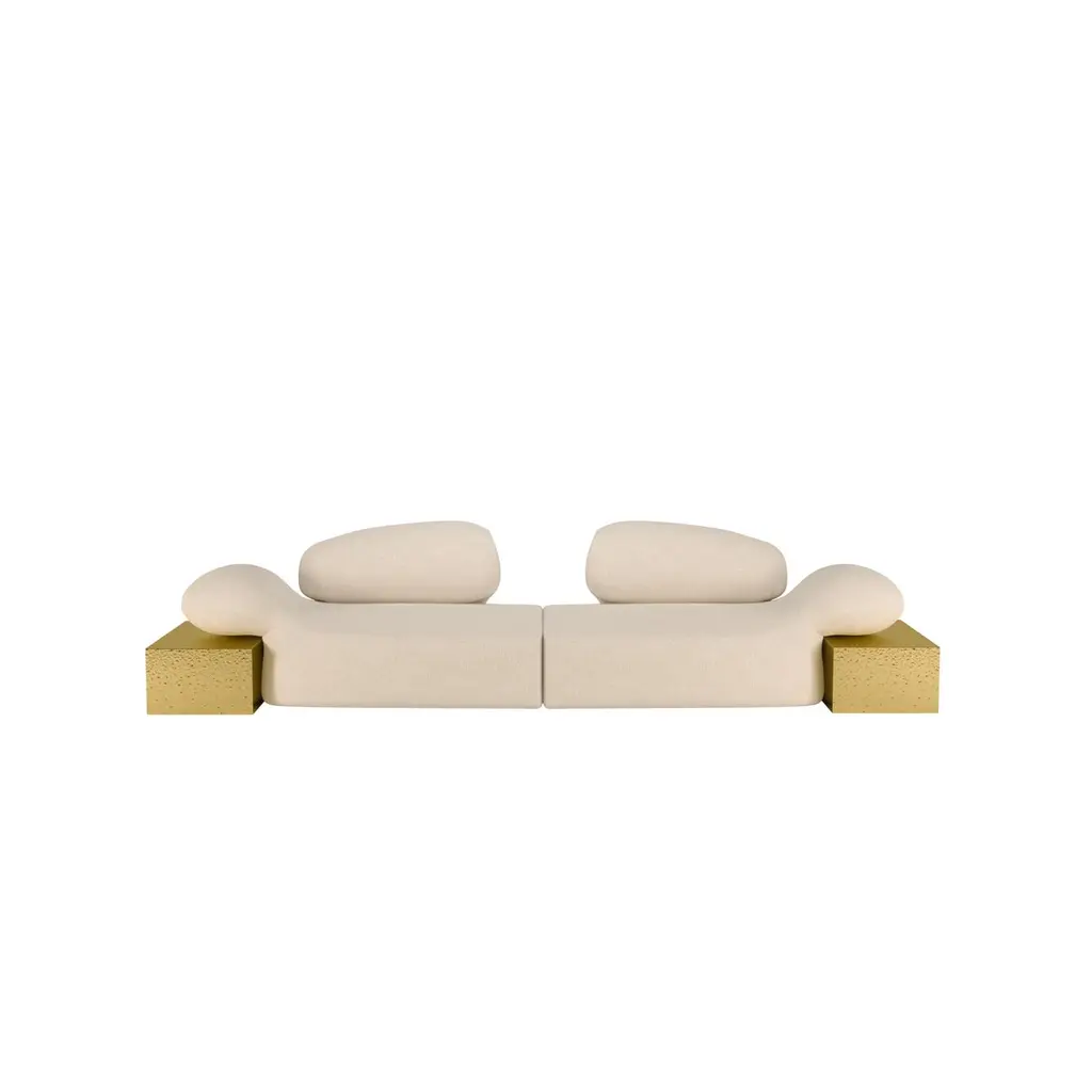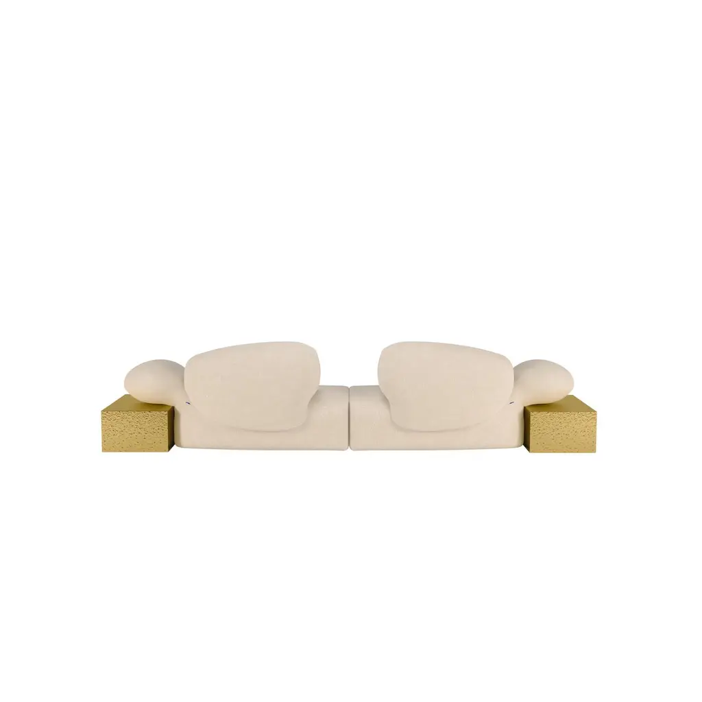 Against the minimalist design concept and characterized by a free use of color and shapes, the modernism movement sparks the impulse for Malabar designers to conceive this future classic sofa.Within this artistic-flavored space, the Viv Id sofa becomes a canvas for artistic expression, transforming your living space into a curated gallery of breathtaking masterpieces. Dressed in bouclé, its melted gold brass structure gives the split-level aesthetic sense of deluxe while it can provide a functionality of a side table. This meticulously crafted piece exudes a distinct aura of creativity, showcasing the harmonious marriage of form, function, and artistic ingenuity.