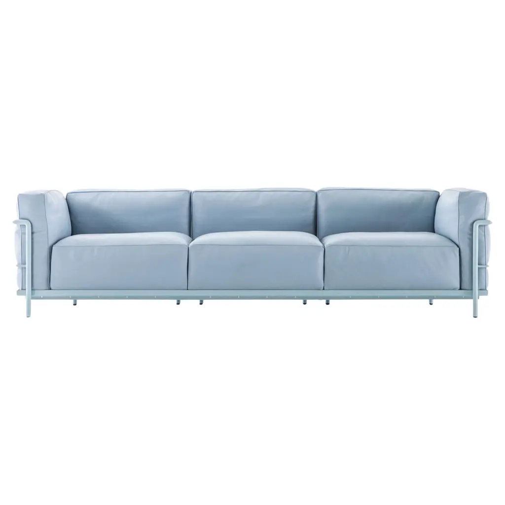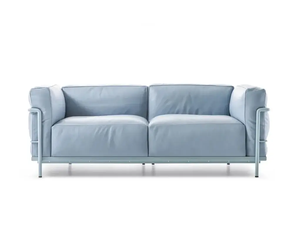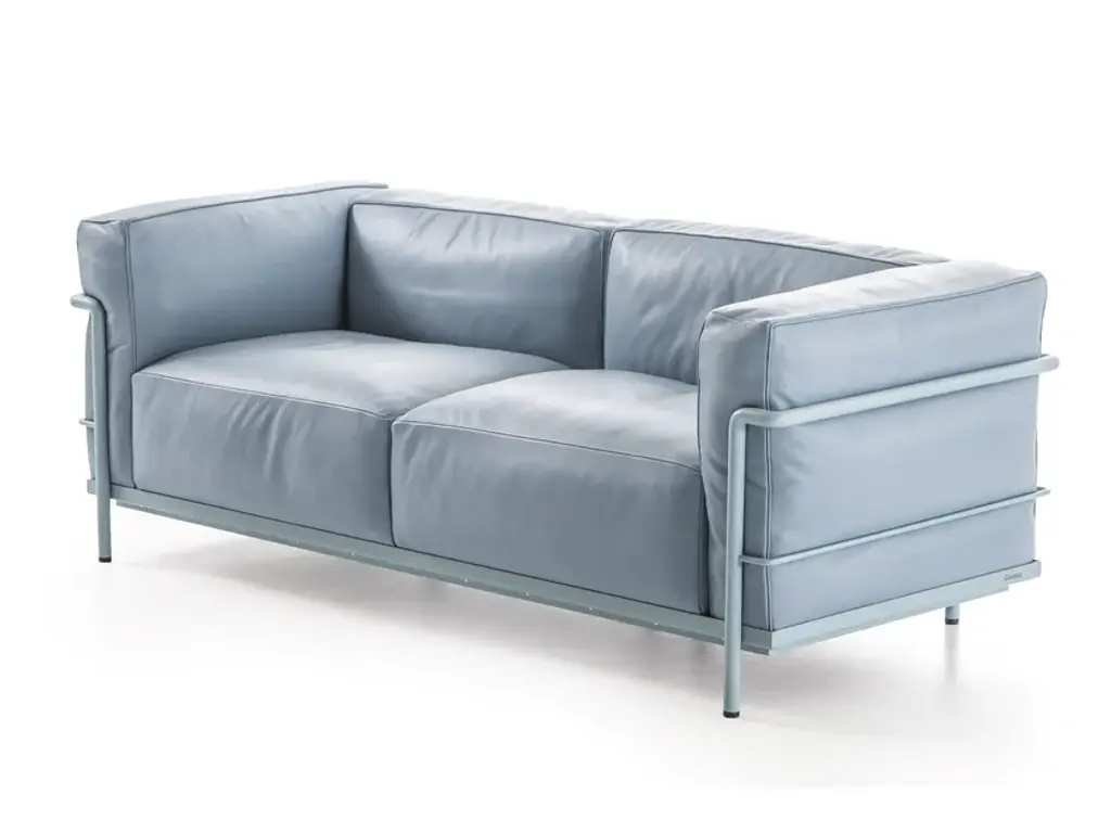 In the various models of Fauteuil Grand Confort, grand modèle, the concept of modernity is expressed through the separation between the metal support frame and the upholstered elements. The loose cushions are set inside a painted or chrome-plated tubular steel cage that forms the primary support for the piece in all its variations ‒ from the armchair with armrest on one or both sides, to the two- and three-seat sofas. Over the years, Cassina has worked very closely with Charlotte Perriand, her daughter Pernette and the Fondation Le Corbusier to introduce new versions and finishes that, while reinterpreting the original design, remain entirely faithful to its authenticity. These models are also available in version with a conscious soul. Thanks to the work carried out by Cassina LAB (the project born from the collaboration with POLI.design at the Milan Polytechnic), the cushions are made with padding in blown polyester fibre.Sofa with feather padded cushions, frame:Frame in tubular steel: Polished chrome, or painted finish in the colours shown on the price list.Cushion padding: Polyurethane foam fill with polyurethane foam insert. Goose down in the feather version.Upholstery: Fabric or leather.Seat frame: In steel angle bar with elastic webbing, chrome-plated or painted in the colours shown on the price list.Feet: In plastic with black finish.Cassina designs complete, comfortable and inviting living spaces where the most innovative products of contemporary design coexist alongside icons by the great masters of the Modern Movement.