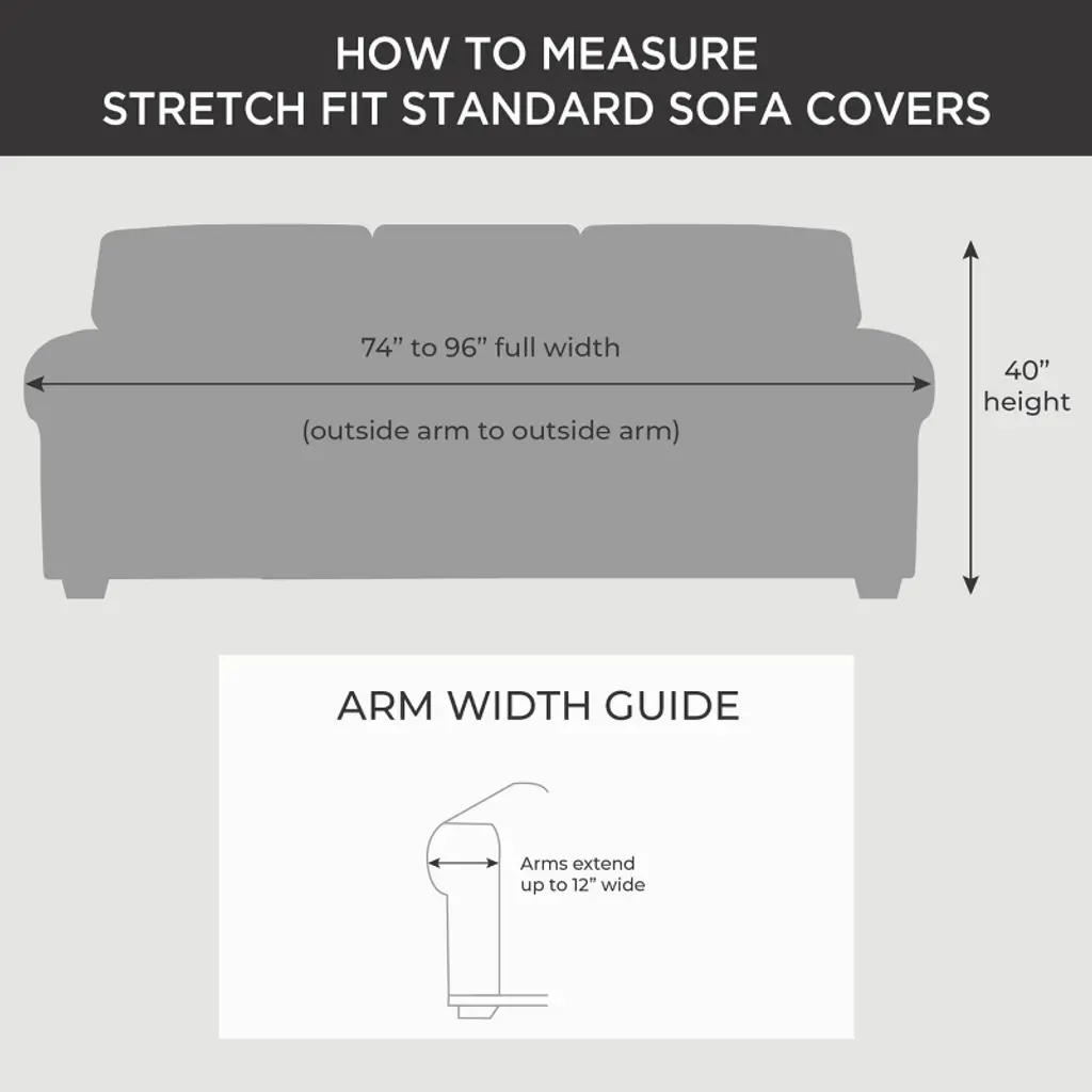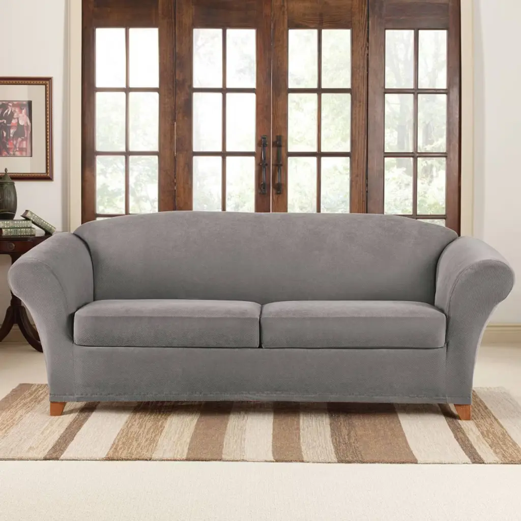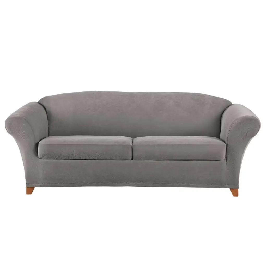 Elevate your home decor with the SureFit Stretch Pique Three Piece Sofa Slipcover, a perfect blend of style and functionality. This sofa slipcover with two separate cushion covers is designed to effortlessly transform your living room, adding a touch of style and protection to your favorite sofa. Crafted with precision to fit most sofas measuring 74" to 96" across the outside arm to arm, this sofa and cushion cover set showcases a subtle geometric design. The slightly raised waffle-knit pattern exudes a cozy, inviting feel. The soft two-way stretch fabric, made from 94% polyester and 6% spandex, ensures a snug fit. The three piece form-fit stretch design includes a slipcover with two zippered separate seat cushions, allowing for easy installation and maintenance. Elastic at the bottom perimeter holds the sofa cover securely in place, ensuring a tidy appearance. Plus, it's machine washable, making cleanup a breeze. Designed for use with furniture that has removable seat cushions, it guards against spills, stains, and everyday wear and tear, extending the lifespan of your sofa.