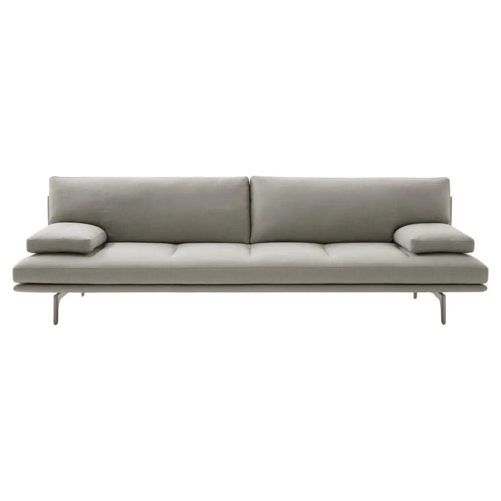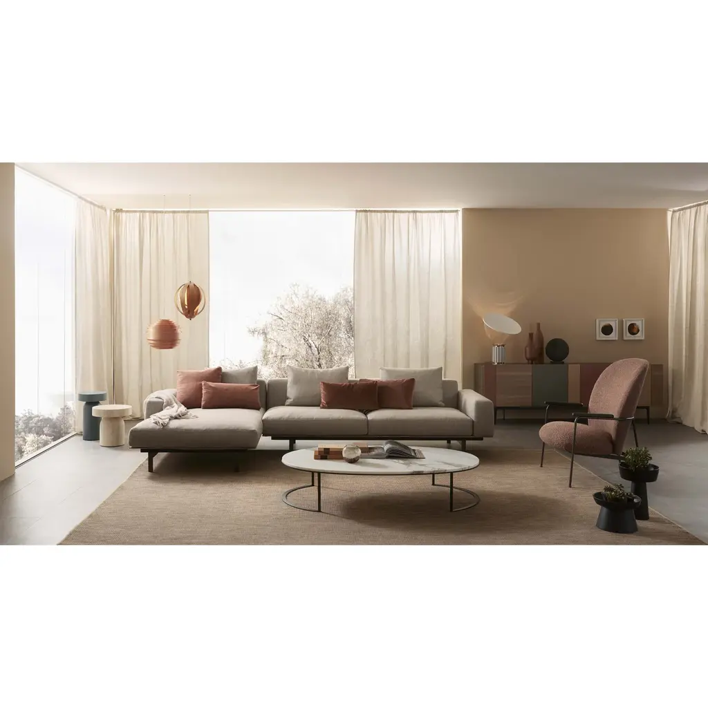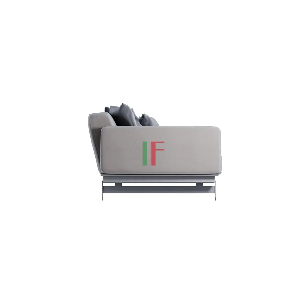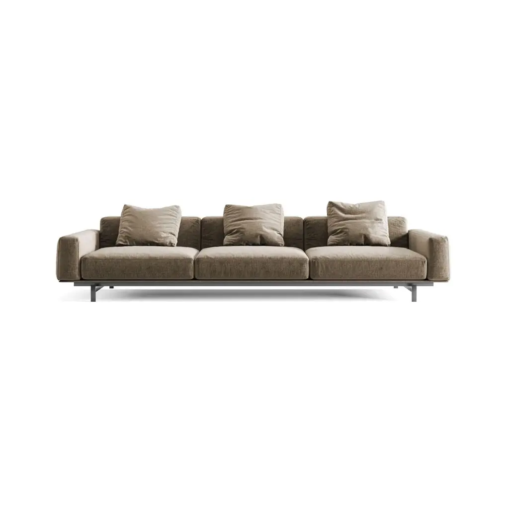 The 60s Industrial Three Seater Sofa by Lema Yard concept as a furniture system comes to life in this design by Francesco Rota, who combines modular upholstered elements with Lema's trademark containers. The collection - which reinterprets some of the creative styles typical of the industrial design of the 1960s - is the product of a desire to find common ground with the world of systems: the upholstered sections integrate with surfaces, shelves, side tables and containers which come together in different combinations to creation unique multifunctional compositions. The structure, made from fabric-covered metal, is a flat surface resting on feet secured with triangular cross-section joints. This, in turn, provides the base for the cushions and armrests, which simply rest on top of the structure without concealing it, thus celebrating the material contrast at the heart of this piece. The structure also provides support for the shelves and containers.