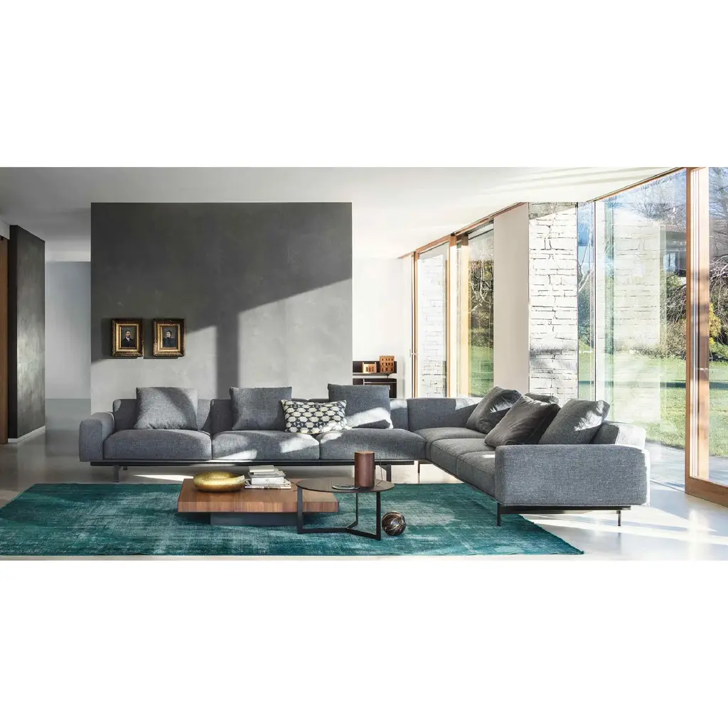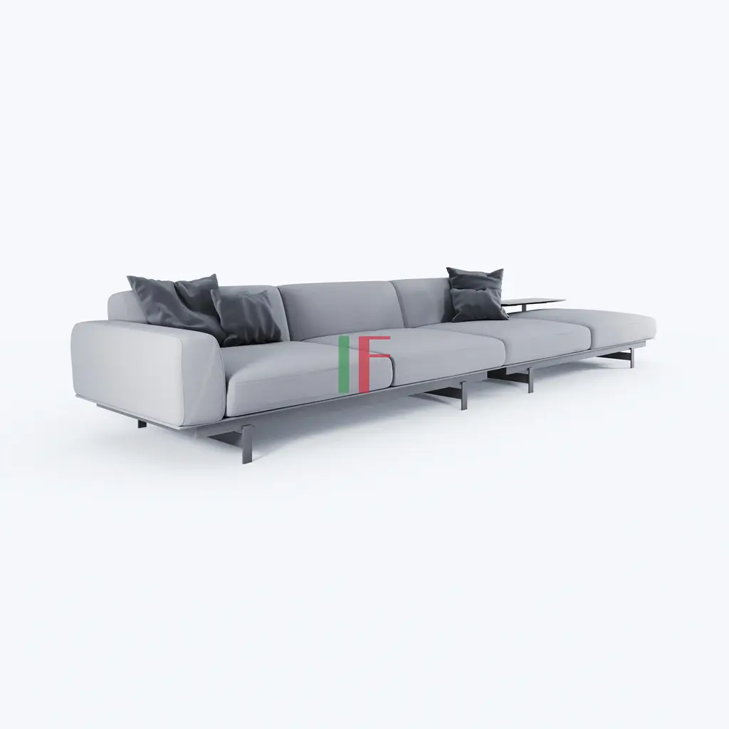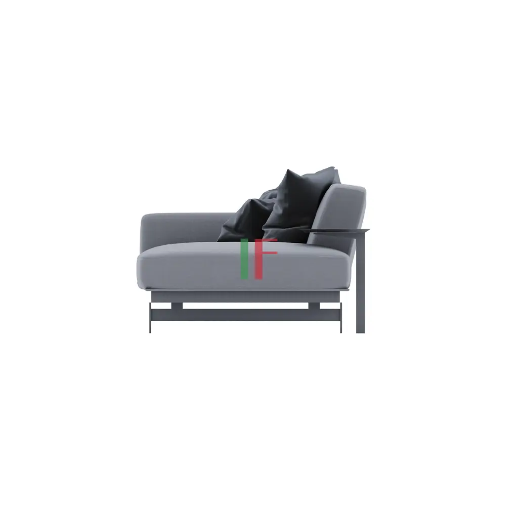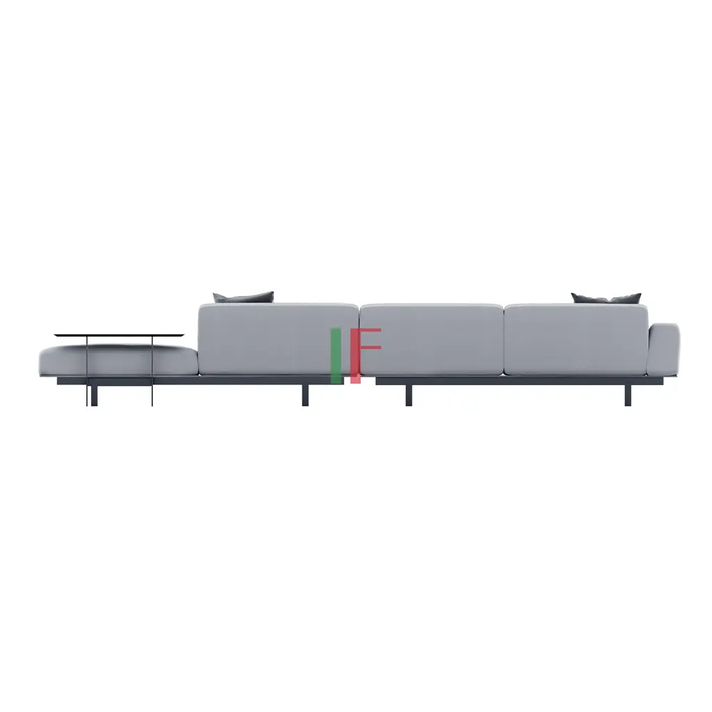 The 60s Industrial Corner Sofa by Lema Yard concept as a furniture system comes to life in this design by Francesco Rota, who combines modular upholstered elements with Lema's trademark containers. The collection - which reinterprets some of the creative styles typical of the industrial design of the 1960s - is the product of a desire to find common ground with the world of systems: the upholstered sections integrate with surfaces, shelves, side tables, and containers which come together in different combinations to creation unique multifunctional compositions. The structure, made from fabric-covered metal, is a flat surface resting on feet secured with triangular cross-section joints. This, in turn, provides the base for the cushions and armrests, which simply rest on top of the structure without concealing it, thus celebrating the material contrast at the heart of this piece. The structure also provides support for the shelves and containers.