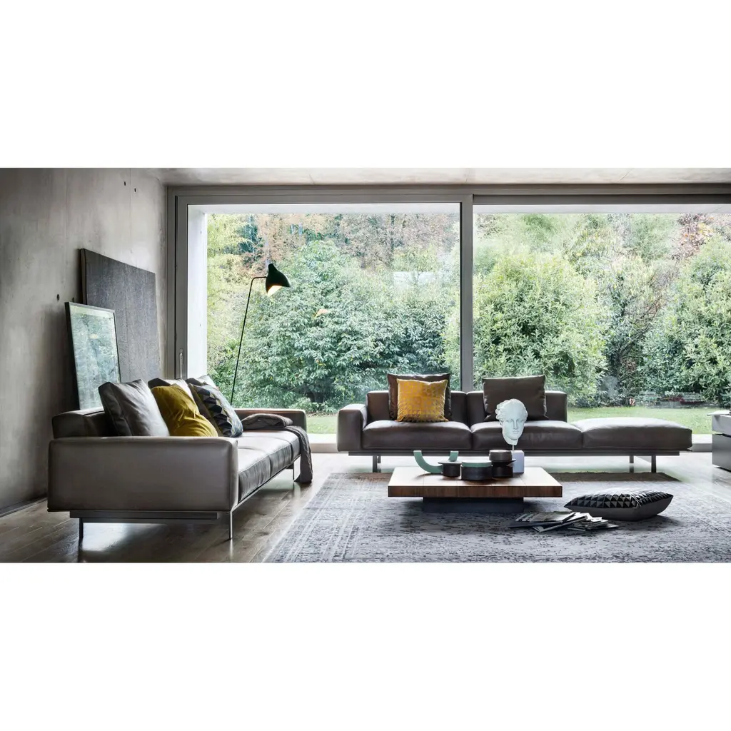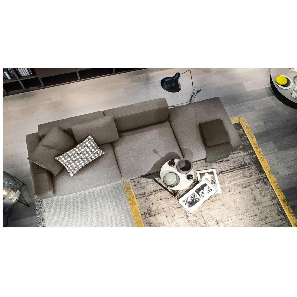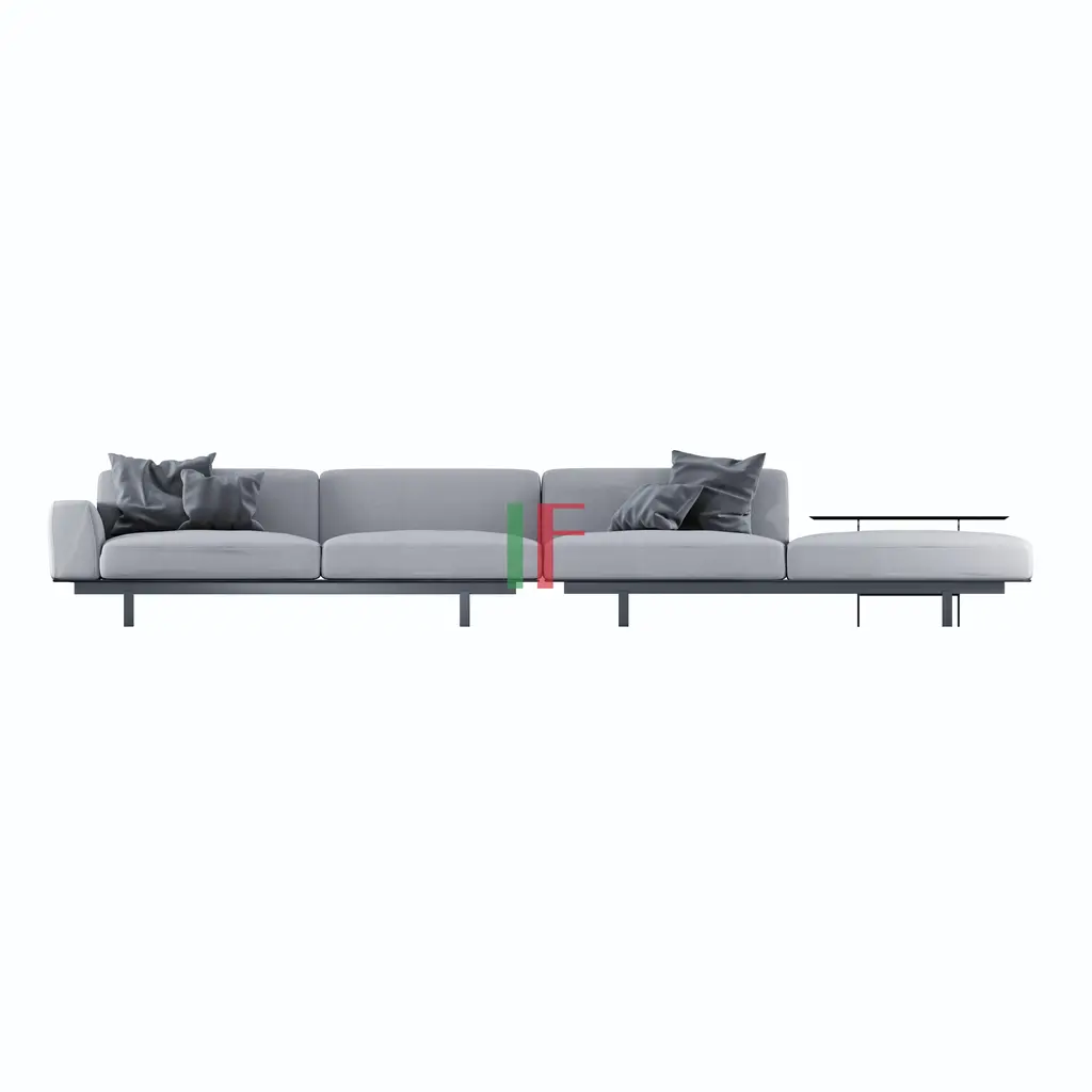 The 60s Industrial Corner Sofa by Lema Yard concept as a furniture system comes to life in this design by Francesco Rota, who combines modular upholstered elements with Lema's trademark containers. The collection - which reinterprets some of the creative styles typical of the industrial design of the 1960s - is the product of a desire to find common ground with the world of systems: the upholstered sections integrate with surfaces, shelves, side tables, and containers which come together in different combinations to creation unique multifunctional compositions. The structure, made from fabric-covered metal, is a flat surface resting on feet secured with triangular cross-section joints. This, in turn, provides the base for the cushions and armrests, which simply rest on top of the structure without concealing it, thus celebrating the material contrast at the heart of this piece. The structure also provides support for the shelves and containers.