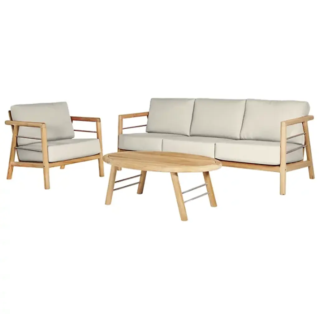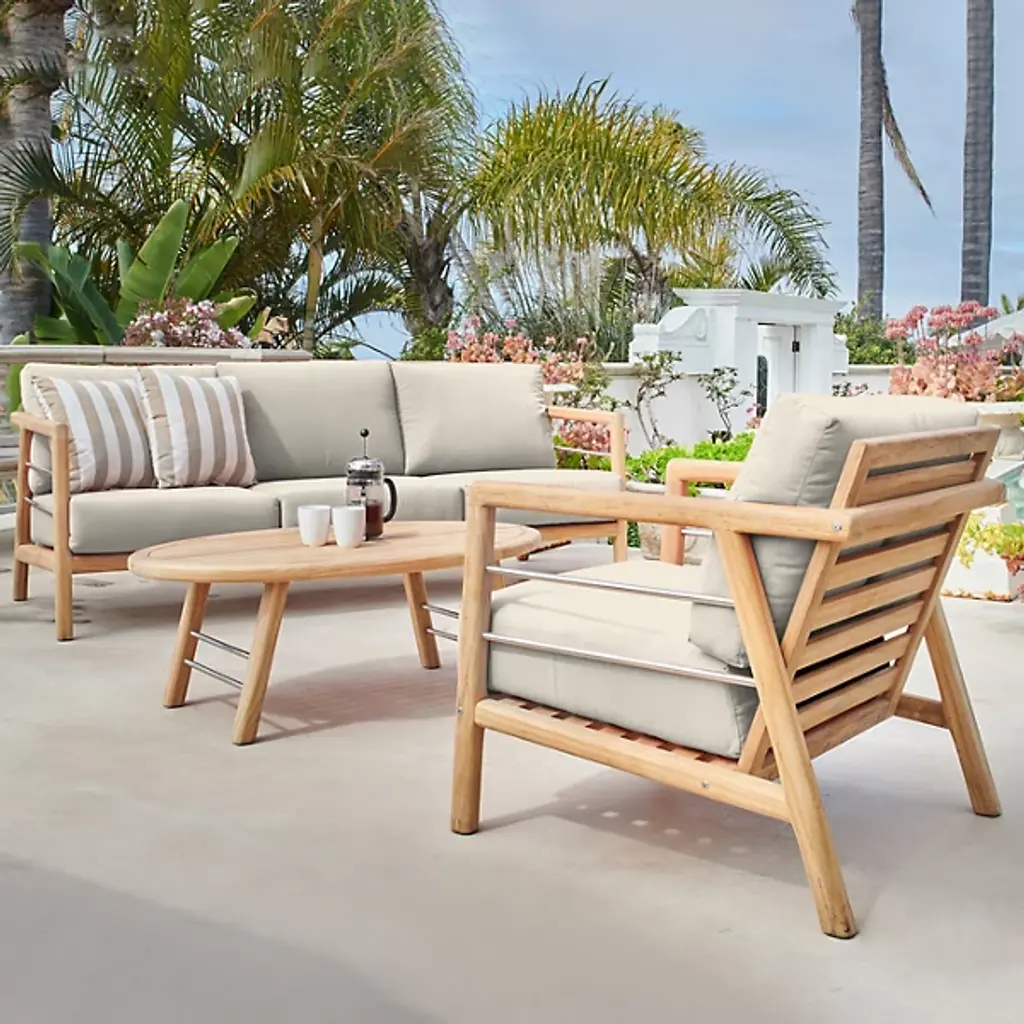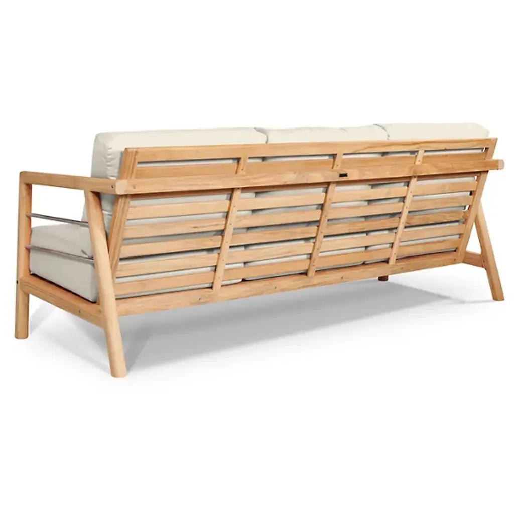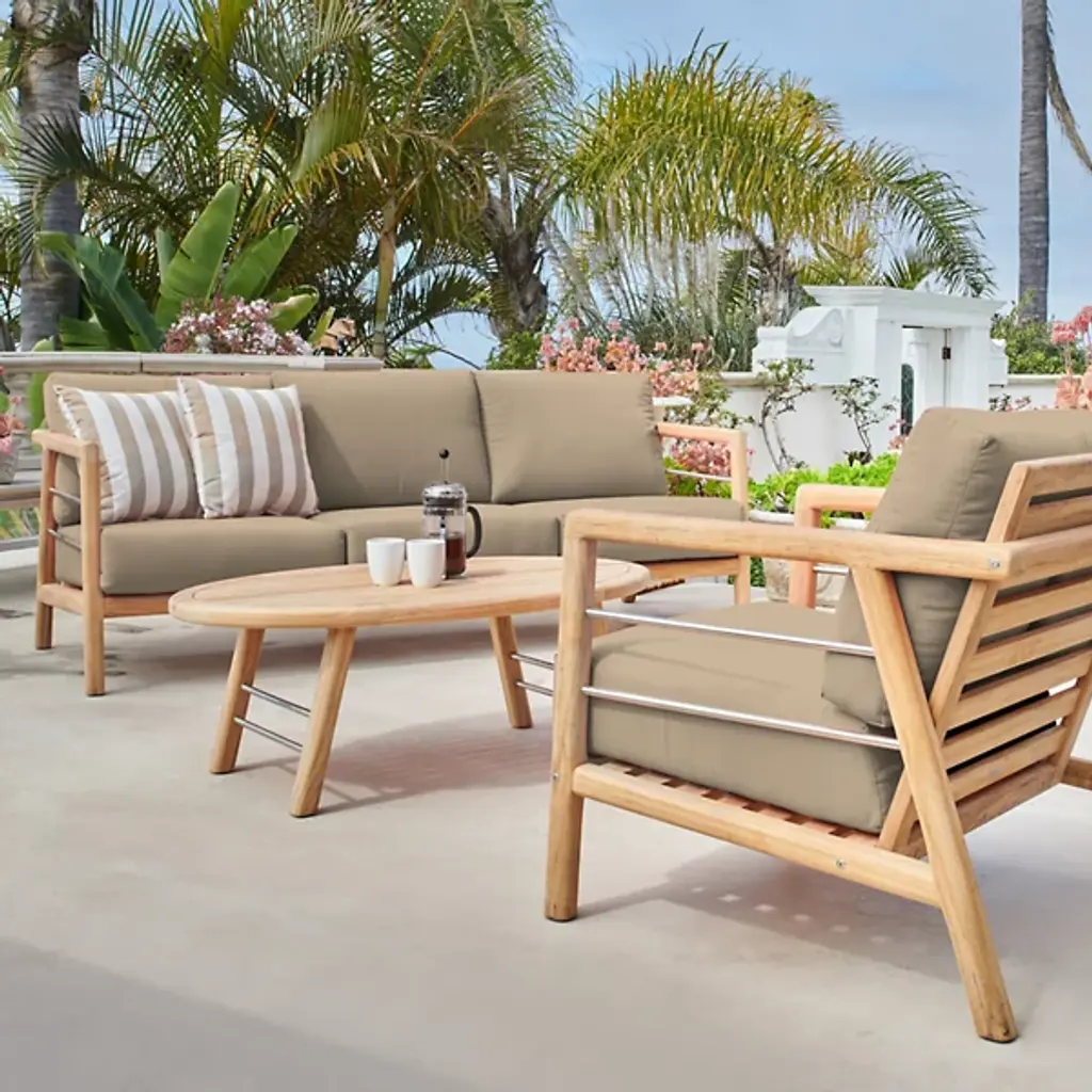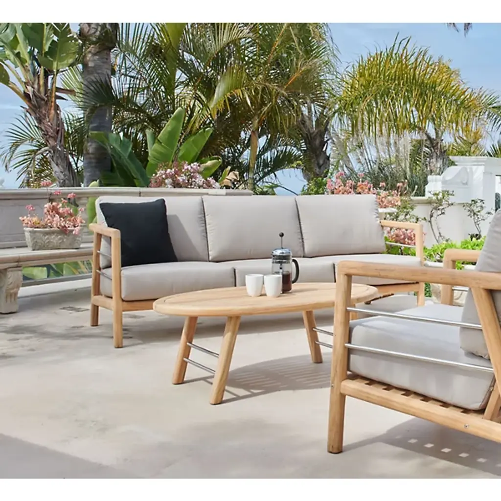 The Aalto Deep Seating Outdoor Sofa with Sunbrella from HiTeak Furniture heightens the open-air experience with lounging for 1 or a few on its robust mid-century inspired design. The sofa’s sharp silhouette and contrasting materials add a refreshing visual to the modern or contemporary space. Interspersed with steel rod accents, the teak wood framework leans one back using a slatted design. The teak’s density and natural oils make it a durable standout. A pair of elegant armrests frame the deep setup of cushions inside. The cushion’s sunbrella fabric maintains the same color and textured quality after long bright days.