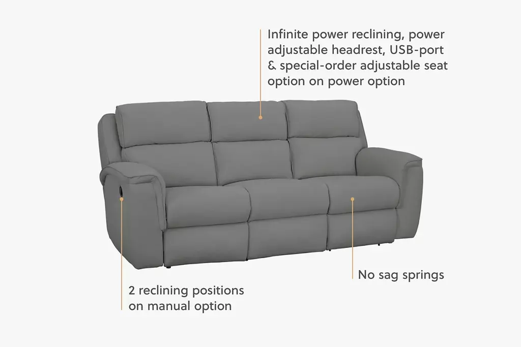 Our Aaron sofa will always have the best seats in the house. With no-sag springs and plush foam seat cushions, this piece boasts ultimate comfort. Available in either a manual or infinite power reclining option, you can start relaxing in style.