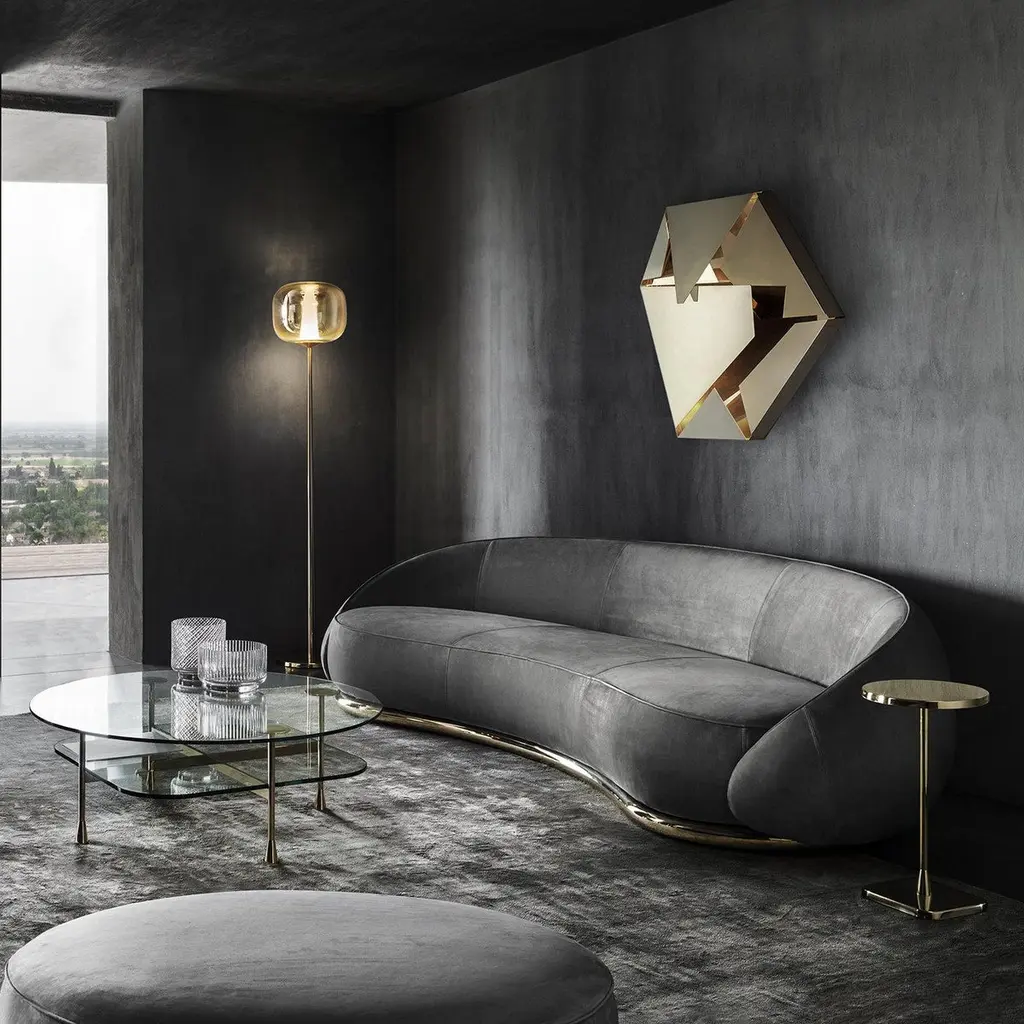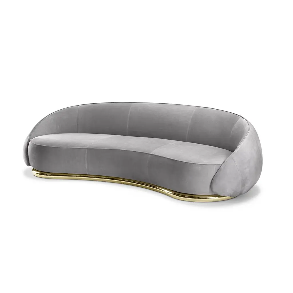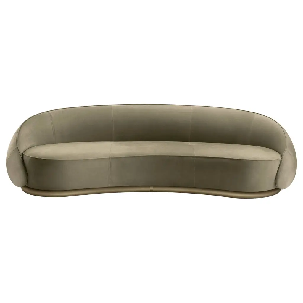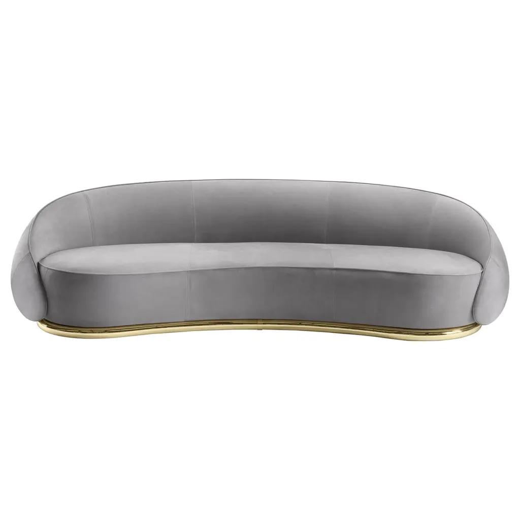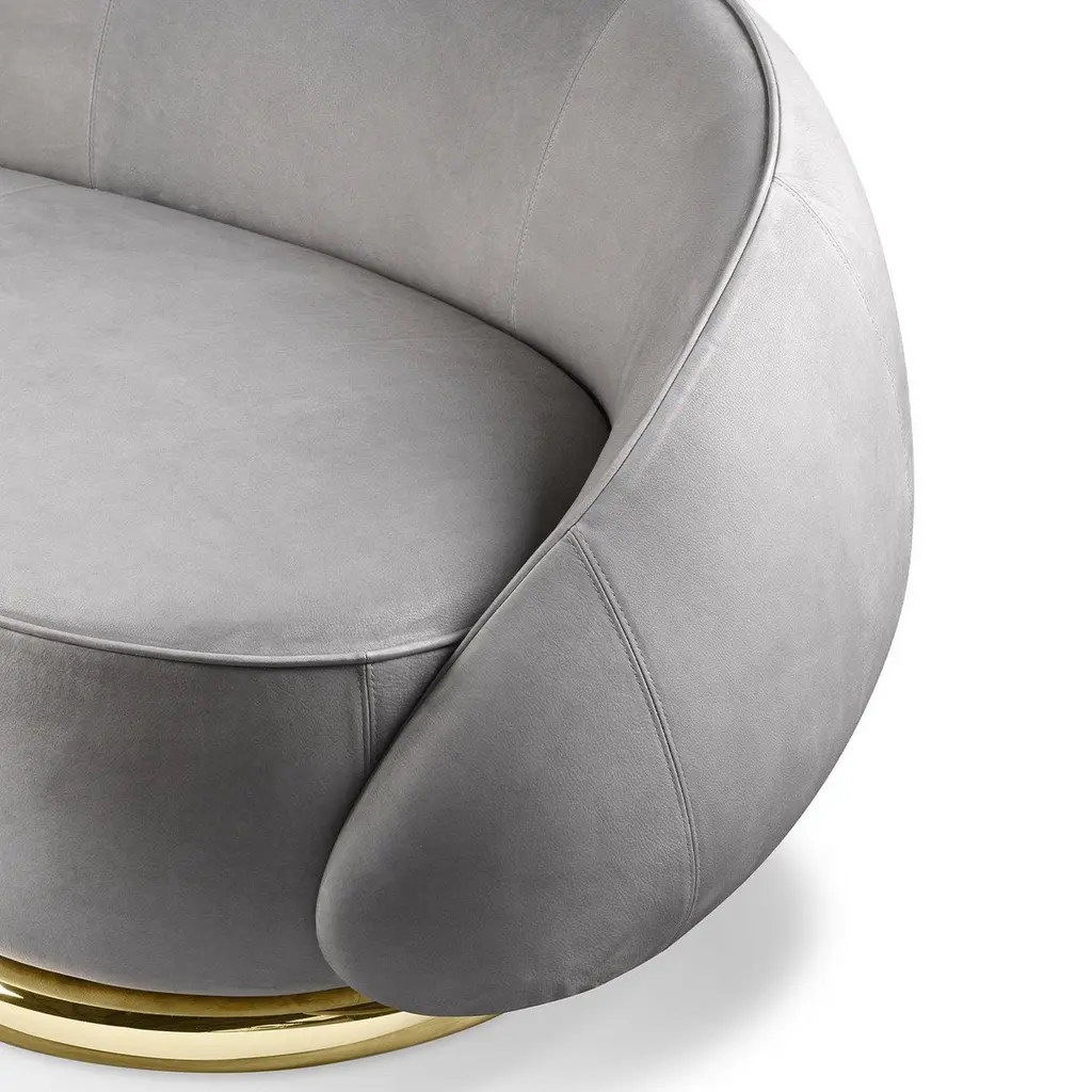 A charming and welcoming flair enhances the generous proportions of this comfortable, enveloping sofa, named after the Italian word for "hugs". Defined by curved, continuous lines, it is composed of a thick yet softly padded three-seat structure with a curved backrest, entirely upholstered with gray-colored leather. The piece rests on a sinuous base in polished gold-finished brass. Customizations are available upon request, please contact the Concierge for details.