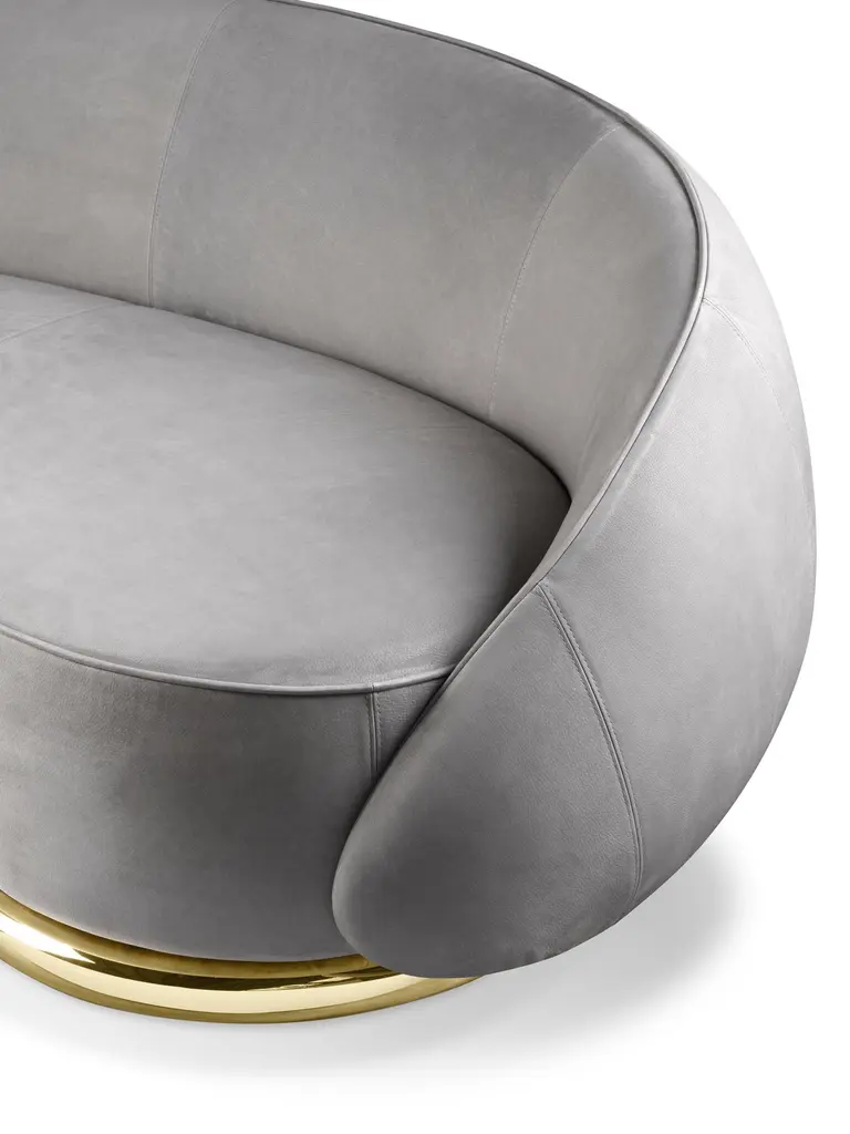 A hug conveys love and friendship, encapsulating a thousand words with elegance and simplicity while sparking the serotonin of happiness and relaxation. Abbracci (hug in Italian) is wrapped with soft nabuck leather crowned by a brass metal tube at the base, underlining its curved and welcoming shape, while the backrest design compliments this simple yet important gesture.Structure: Base structure in brass plated aluminum bended round tube. Internal structure with metal supporting frame. Cushions: Back cushions in high grammage wadding with internal rubber insert. Seat cushions in polyurethane rubber of different densities. Covers: Covers are not removable. Base: The sofa, armchair and ottoman are made of Italian aluminum, bent in-house at Ghidini1961. Polished manually, and lacquered with a transparent finish to guarantee a long lasting durability.Additional Information:Materials: Brass, leather Upholstery: 1710 - plomoLegs Finish: Polished brassDimensions: W 260 x D 120 x H 70 cmAvailable in other upholstery options: Fabric, nappa leather, natural leather, velvetAvailable in other finish option: Brown burnished brass, polished brass, satin brass, light burnished brass, dark burnished brass
