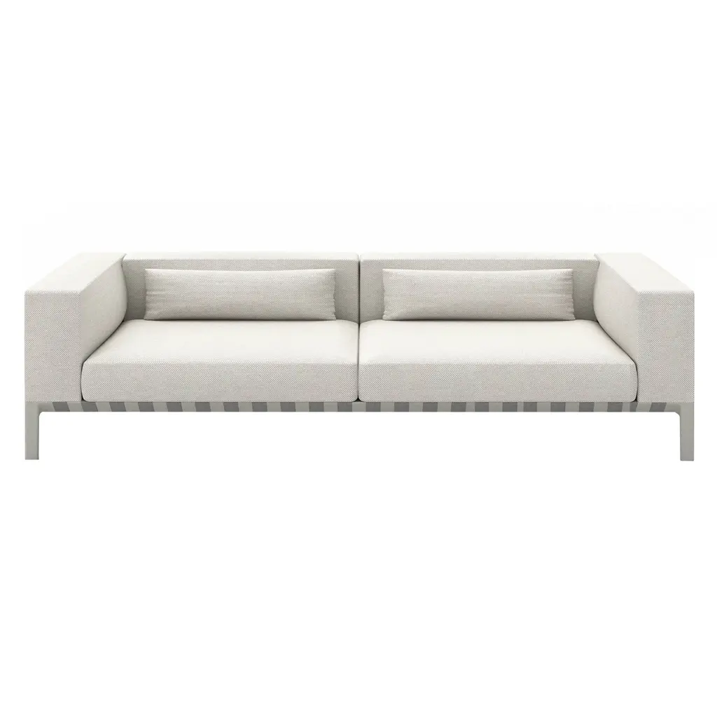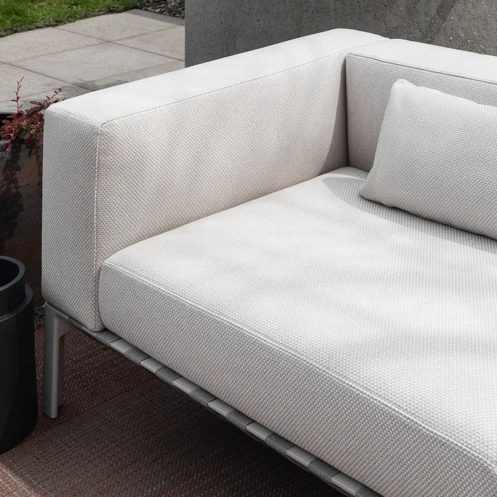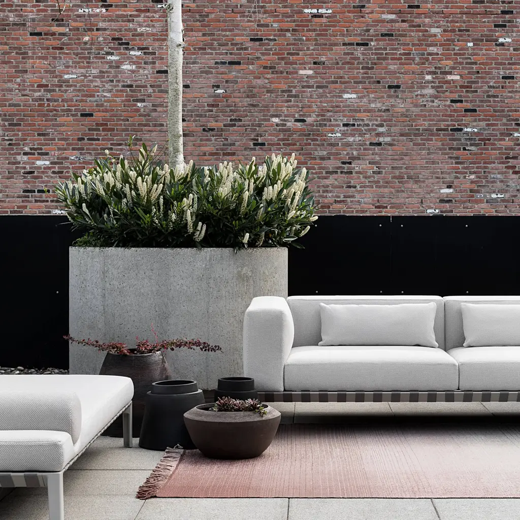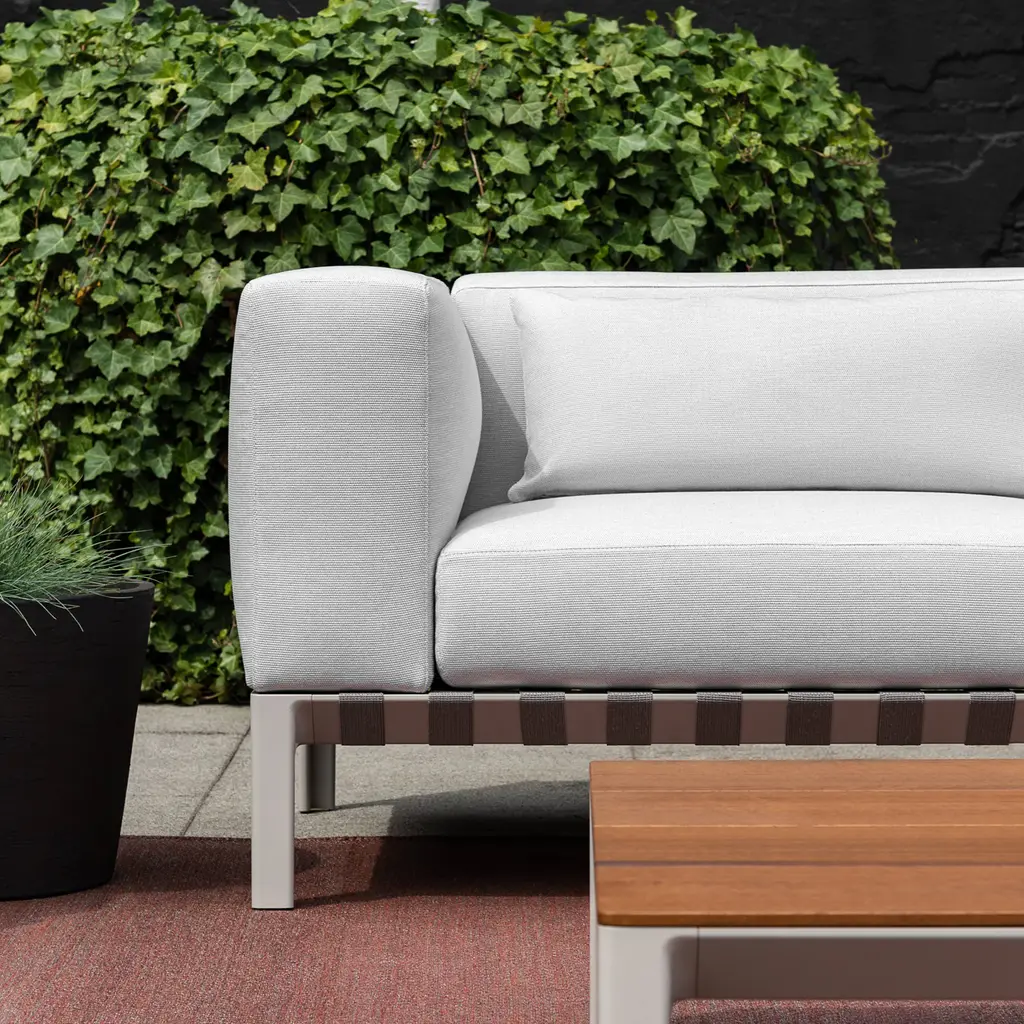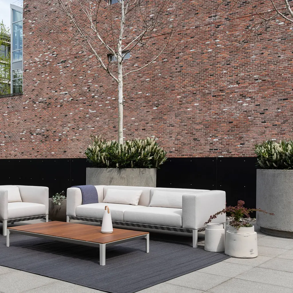 A handsomely squared-off sofa with arms is but one of the standout seating choices in the Outdoor Able collection that rivals furnishings made for interiors. Designer and Bensen founder Niels Bendsten melds generous upholstered contours with made-in-Italy finesse for his exceeding comfortable statement pieces. For geometric punctuation, he adds tone-on-tone woven banding to the slim-lined but ultra-sturdy frame in cast aluminum. Vancouver-based Bensen's upholstered array encourages custom groupings with companion armchair and varied modular seating options.