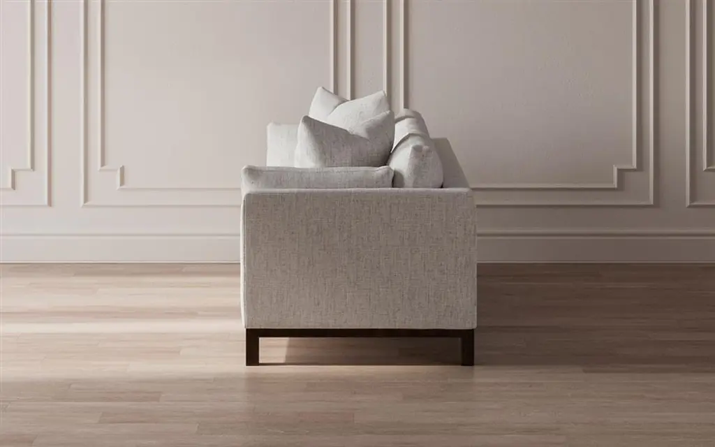 With simple lines and subtle European sophistication, the 90” Adelle sofa is effortlessly chic and inviting. Its transitional silhouette is grounded by a beautiful wood rail. Plush, comfortable seating is soft yet supportive, with a foam core surrounded by a blend of fiber, down, and feather fill. The bench seat is anchored by two sets of pillows and gently angled arms for easy lounging. Choose from a variety of upholstery options, including linen, velvet, and performance fabrics.