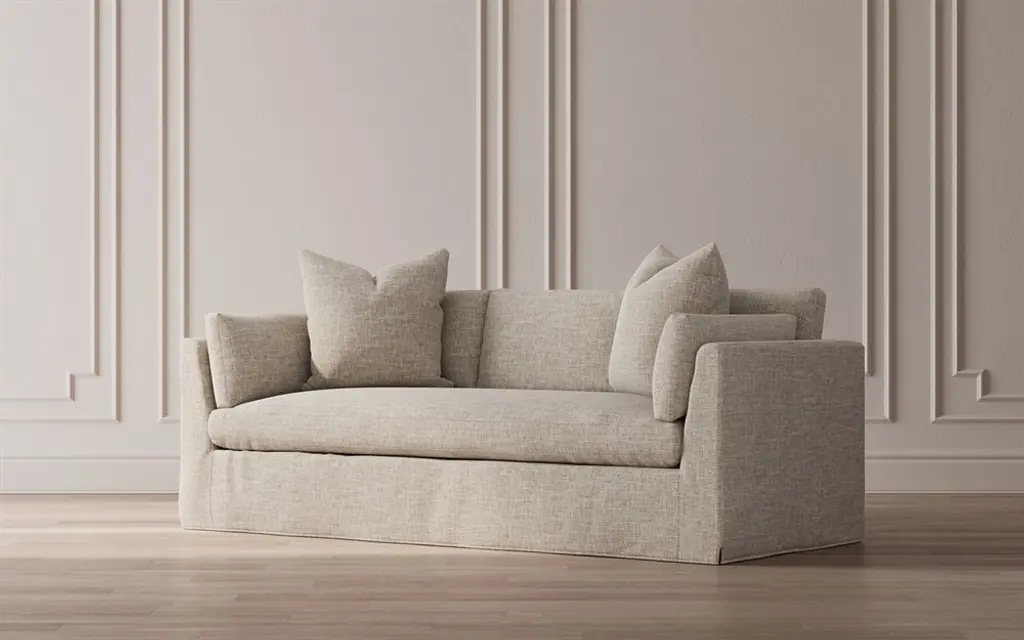 The 90” Adelle slipcovered sofa is effortlessly relaxed, with simple lines and airy, elegant draping. Plush, comfortable seating is soft yet supportive, with a foam core surrounded by a blend of fiber, down, and feather fill. Its graceful bench seat is anchored by two sets of pillows and gently angled arms for easy lounging. Choose from washable slipcover fabrics in a variety of serene hues.
