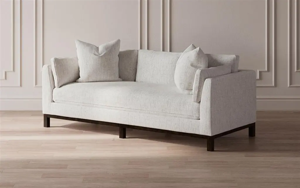 With simple lines and subtle European sophistication, the 90” Adelle sofa is effortlessly chic and inviting. Its transitional silhouette is grounded by a beautiful wood rail. Plush, comfortable seating is soft yet supportive, with a foam core surrounded by a blend of fiber, down, and feather fill. The bench seat is anchored by two sets of pillows and gently angled arms for easy lounging. Choose from a variety of upholstery options, including linen, velvet, and performance fabrics.