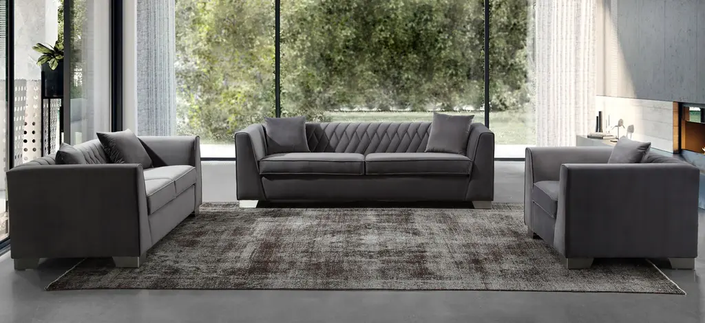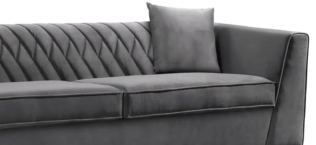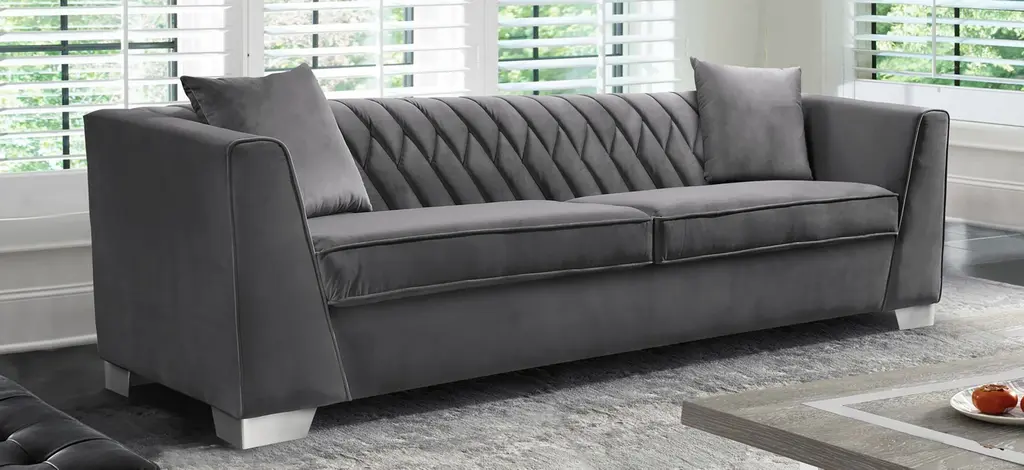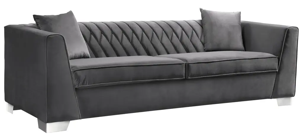 The Agnes sofa is an ideal piece to have in any modern living room. This exquisite sofa combines the durability of a metal and birch wood frame with the comfort and sophistication of elegant velvet upholstery. Plush and inviting, the Agnes couch features a unique channel patterned back and two velvet throw pillows for enhanced support. The Agnes's brushed stainless steel legs perfectly accent the rich upholstery and elegant design of the sofa. This sofa creates a unique living room aesthetic. Upholstered in elegant velvet.The Agnes sofa is an ideal piece to have in any modern living room. This exquisite sofa combines the durability of a metal and birch wood frame with the comfort and sophistication of elegant velvet upholstery. Plush and inviting, the Agnes couch features a unique channel patterned back and two velvet throw pillows for enhanced support. The Agnes's brushed stainless steel legs perfectly accent the rich upholstery and elegant design of the sofa. This sofa creates a unique living room aesthetic. Upholstered in elegant velvet.