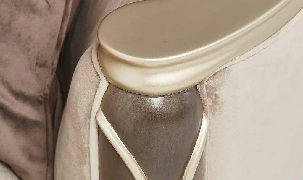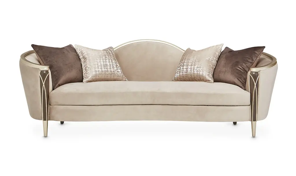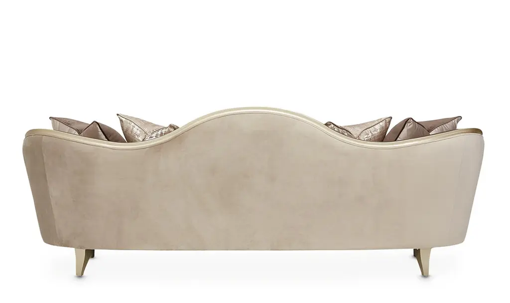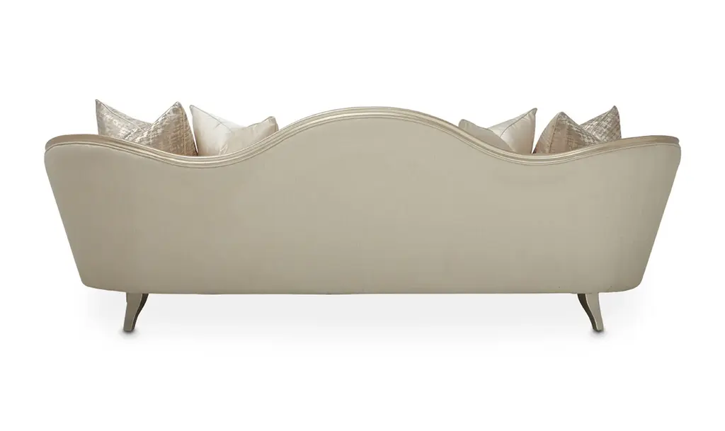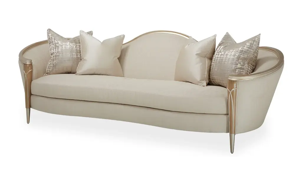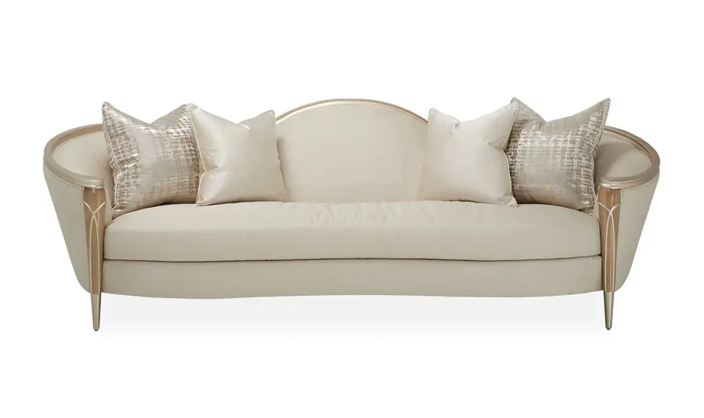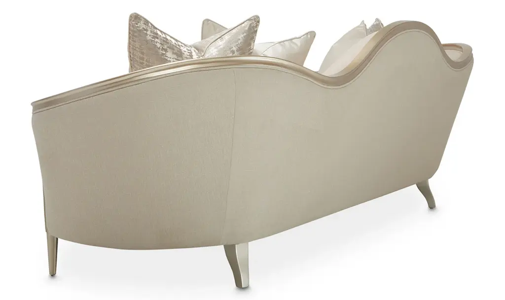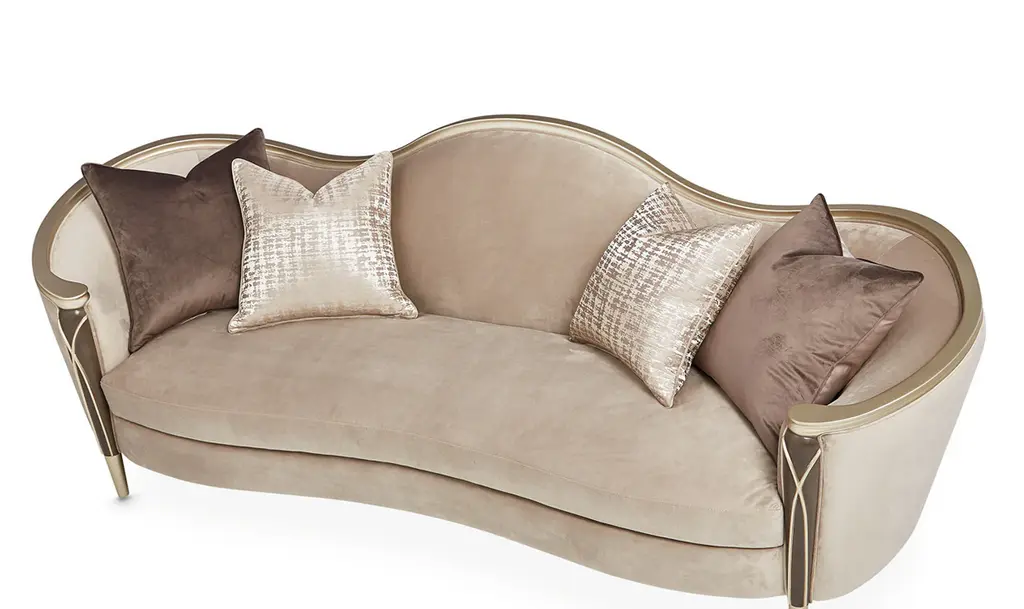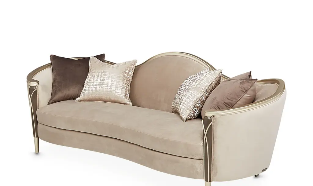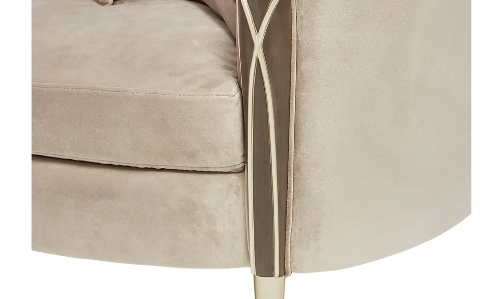 Introducing the Villa Cherie Sofa and Matching Chair – a timeless blend of traditional elegance and modern sophistication for your living space. Crafted with meticulous attention to detail, this collection redefines luxury with its graceful curves, rich hazelnut tones, and swirl mahogany surfaces. The Sofa, adorned with curving armrests in frosted linen, invites you to sink into comfort and style. The tapered front legs, finished in warm Caramel, feature exquisite crossed rope motifs in Chardonnay, adding a touch of rustic charm. The Chardonnay finish extends to the rail, armrests, and feet, creating a seamless and harmonious look. The Villa Cherie Sofa is not just furniture; it's an expression of everyday romance. The wave-shaped back rail adds a dynamic elegance reminiscent of Hollywood glamour, making every moment special. Whether you're hosting guests or enjoying a quiet evening, this Sofa elevates your living room with its timeless design. Experience the perfect shape for your space, where every detail is thoughtfully curated. The combination of tapered legs, Chardonnay trim, and the frosted linen upholstery instantly brightens any room, creating an inviting atmosphere for relaxation and conversation. Indulge in the sophistication of the Villa Cherie collection, where traditional style meets modern design. Elevate your home with this luxurious Sofa that seamlessly blends into any décor, promising not just comfort, but a statement of refined taste.