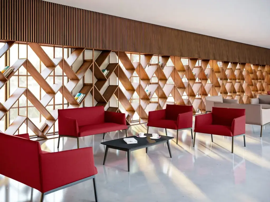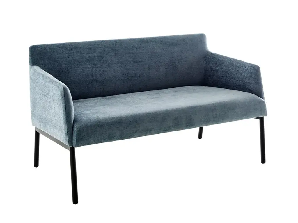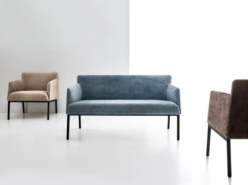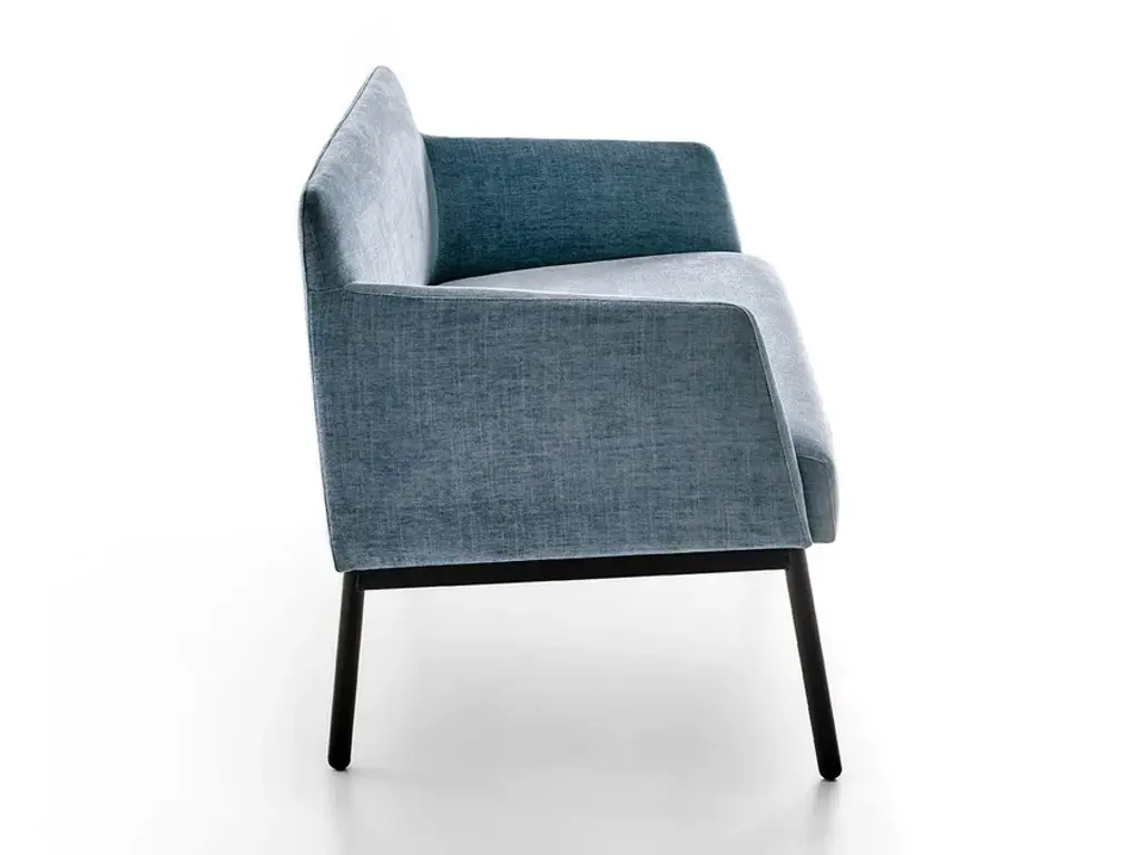 Upholstered sofa in fabric or eco-leather with plywood structure and painted metal legs from the AIR collection.Geometrically rigorous AIR gets softened in a welcoming and comfortable seating. The tailored attention to the detail enhances the design of seat and back. Lounge armchair and double-seating sofa are also available to furnish a hotel, office or wating-room.