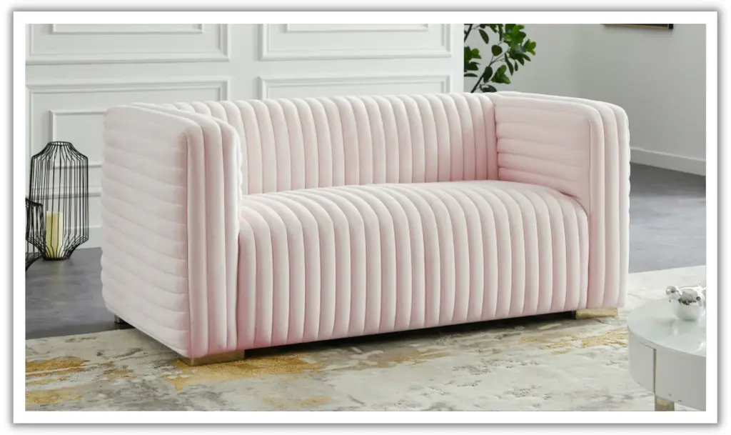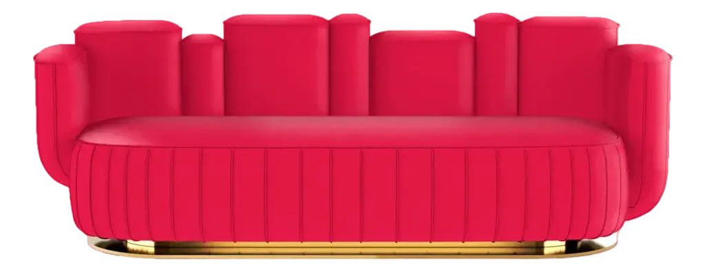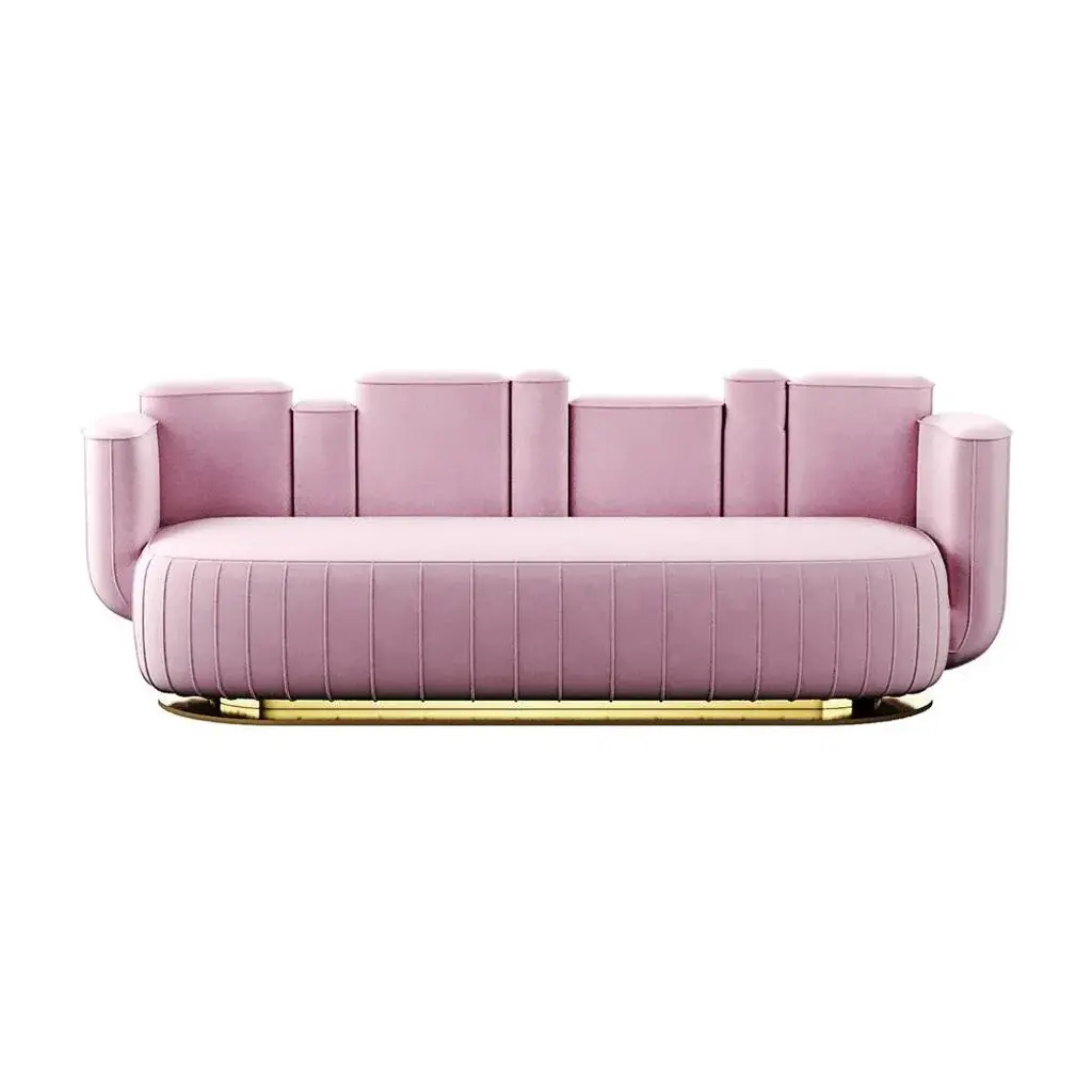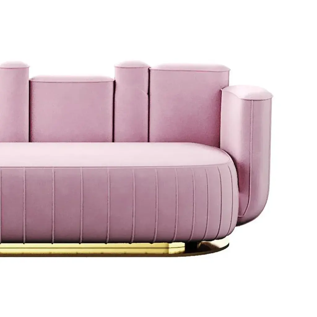Ajui Sofa Pink is a design sofa that features an artsy interpretation of a cactus in a softly rounded shape. This sofa will create a witty spot to be shared with good moments with friends. Entirely upholstered in a pink velvet fabric, please contact us for further details and customization options. MATERIALS: Upholstered in Suede; Base in Gold Polished Stainless Steel.