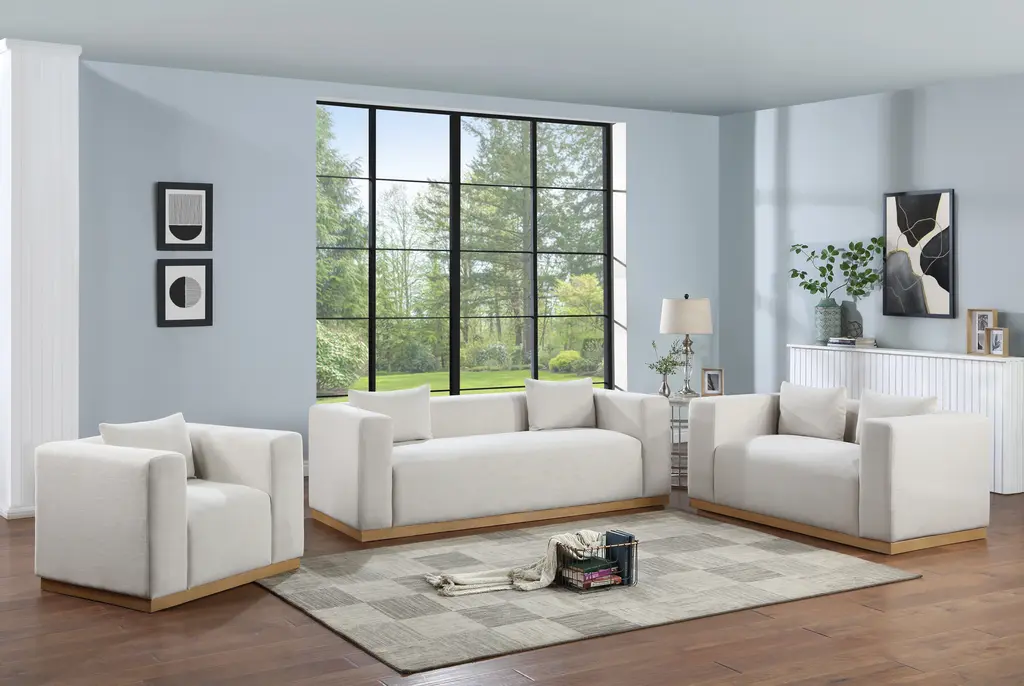 Make this Alan linen textured fabric living room sofa the center a cozy reading nook. This overstuffed chair is stunning from angles, with its contemporary design elements and chic rich cream color. Plumply stuffed with fluffy fill to create the ultimate space for snuggling up with your favorite reading material or while binging on the latest TV program. The sofa rests on a black finish solid wood base for stability and added contrast with its beige upholstery. Loveseat and sofa sold separately.