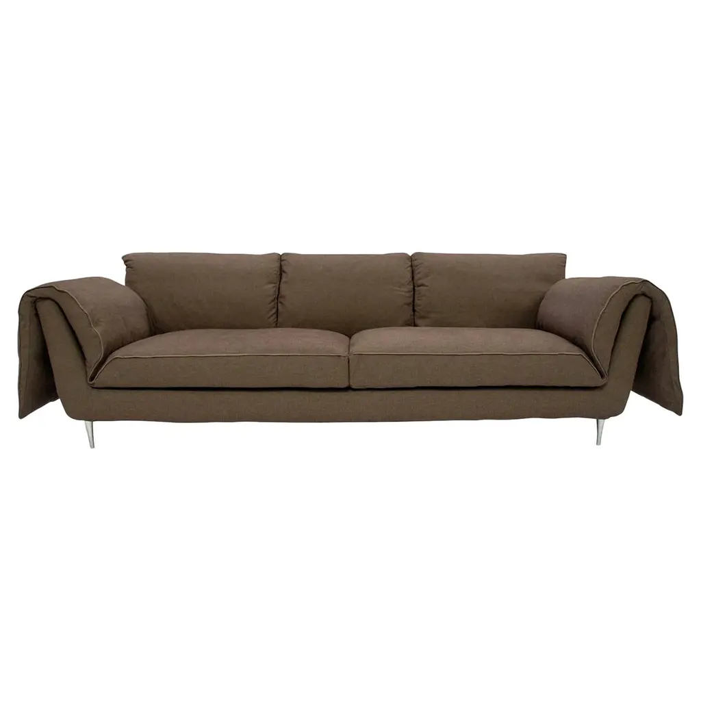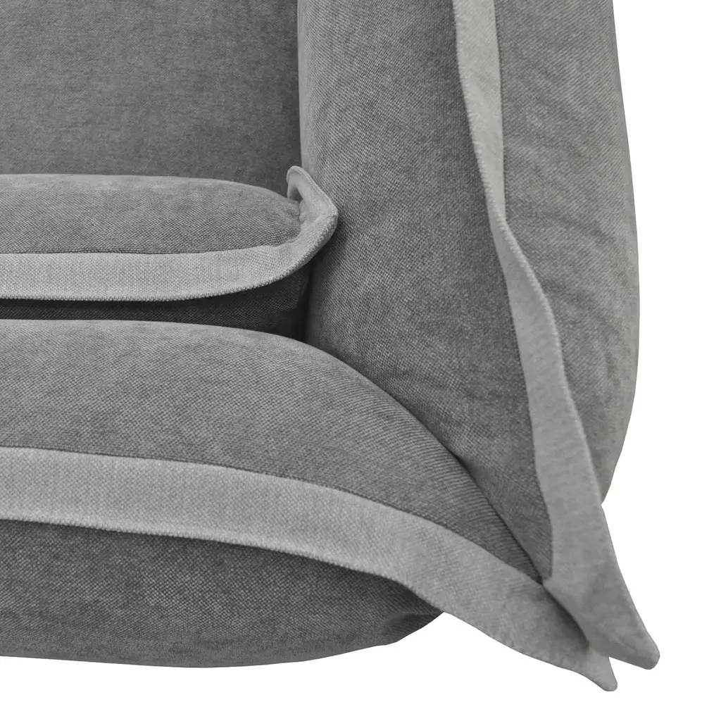 A triumph of frills running along its linear profile lends this sofa its distinctive informal charm. Multiple cushions compose its generous silhouette, which is wrapped in timelessly elegant gray-toned fabric and raised on elegant chromed steel feet for a dash of luminosity. An armchair counterpart is also available for cohesive arrangements.