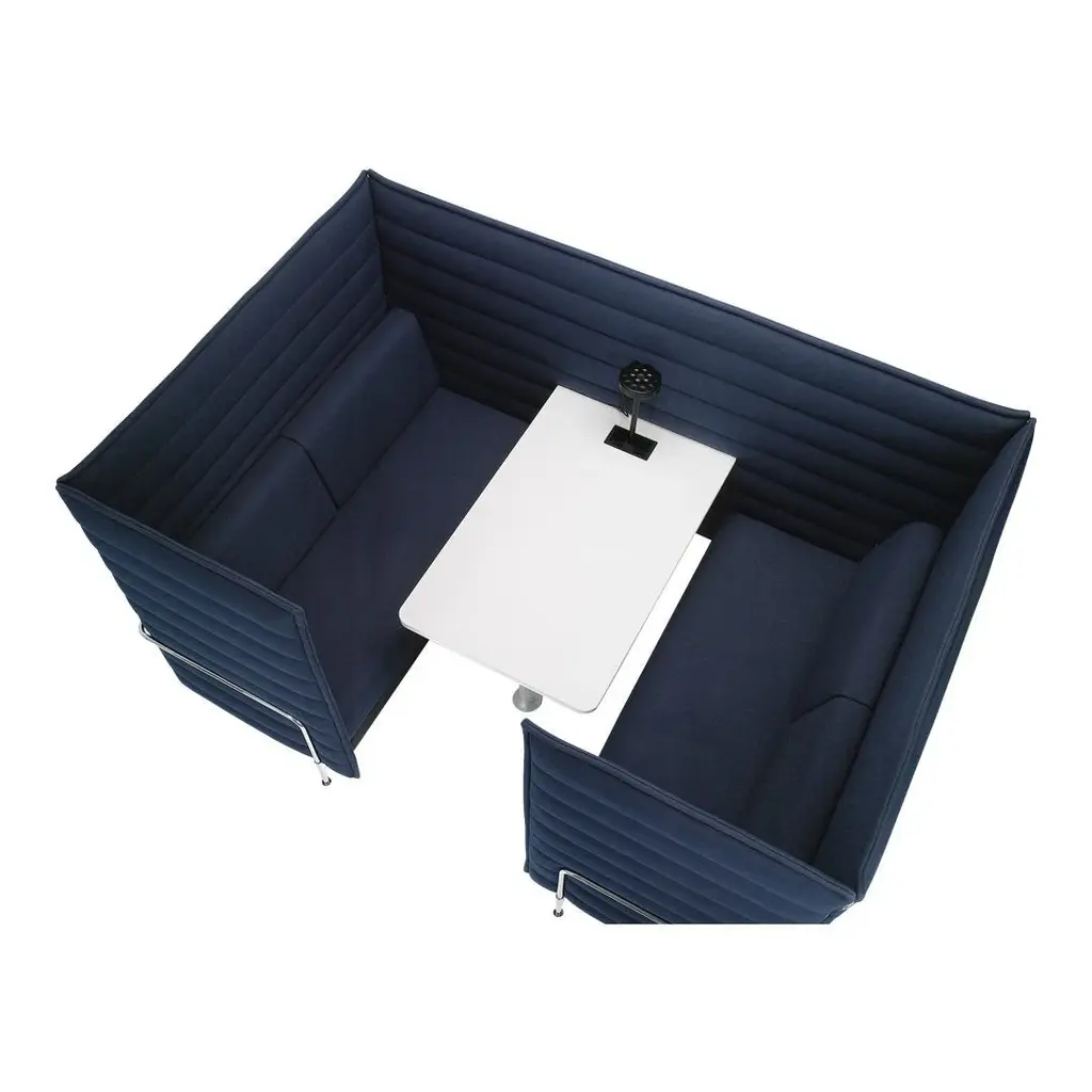 Alcove Cabin creates a secluded space, which is enclosed on all sides and accessible through a single opening. It provides visual and acoustic privacy for four to six people – especially the version with extra-high side walls. On the inside, Alcove Cabin has facing upholstered seats and can be optionally equipped with a table to serve as a full-fledged workspace.