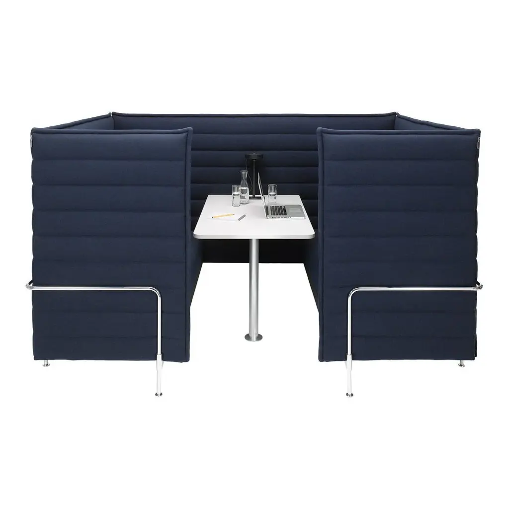 Alcove Cabin creates a secluded space, which is enclosed on all sides and accessible through a single opening. It provides visual and acoustic privacy for four to six people – especially the version with extra-high side walls. On the inside, Alcove Cabin has facing upholstered seats and can be optionally equipped with a table to serve as a full-fledged workspace.