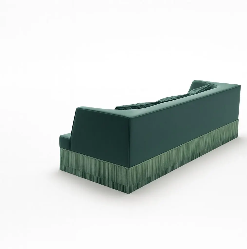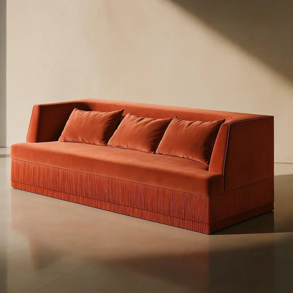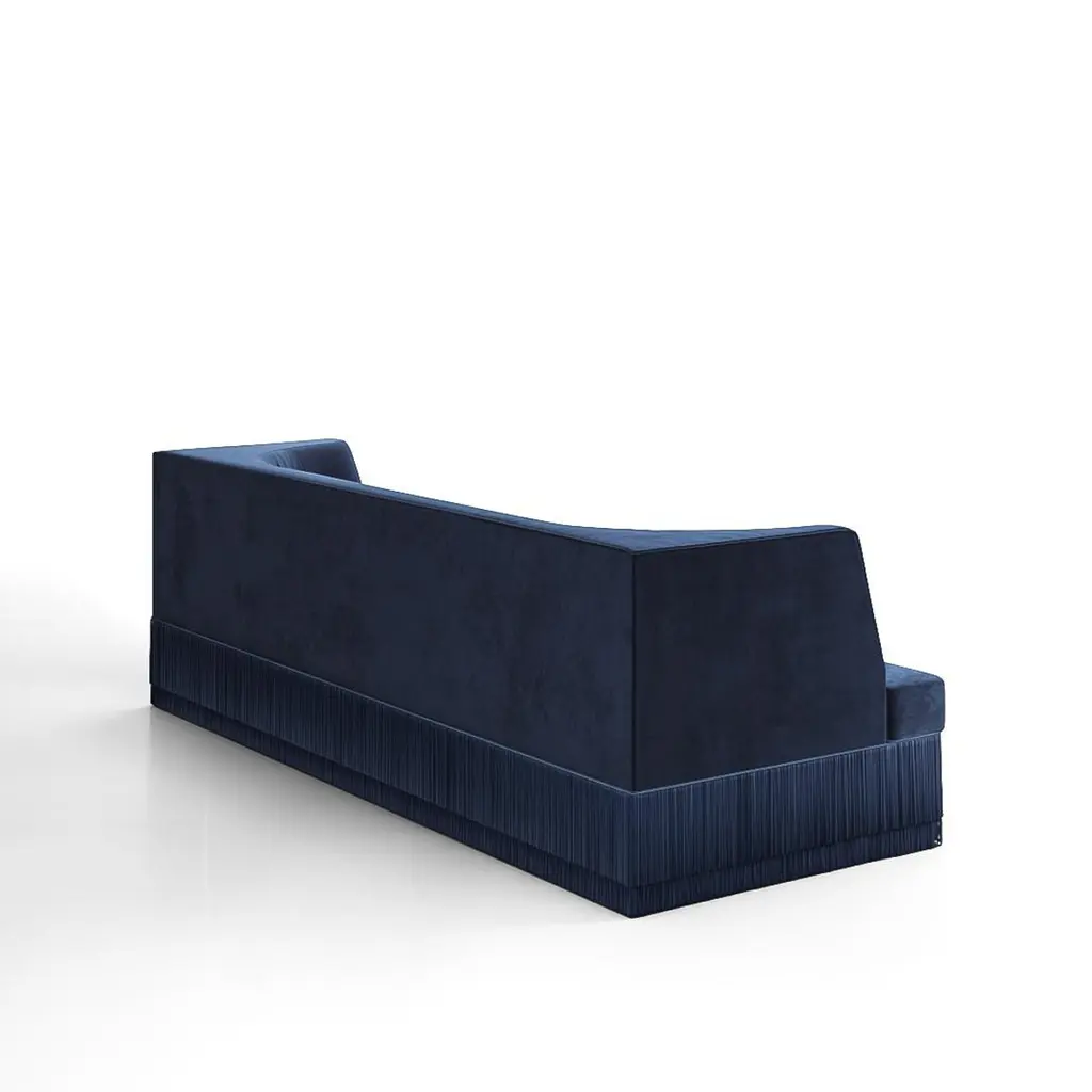A sculptural statement piece defined by its architectural silhouette and introspective form. The Alcove Sofa embraces a bold exterior — rectangular and linear — that gently reveals a soft, concave inner curve. The design evokes the feeling of a modern-day retreat, a sanctuary carved into form, where function meets quiet sophistication.Crafted with a solid hardwood frame and high-resilience foam, this sofa offers a balance of precision and comfort. The piece is upholstered in a rich velvet fabric and accented by cascading silky fringe layers along the base, creating a dialogue between stillness and flow.Fabric and Fringe Options:This sofa is available in our attached velvet collection. For fringe options, please contact us directly and we will send you available choices from our current stock. Custom fringe colors are also available upon request, with a lead time of 24 weeks.Beyond fabric and fringe, custom sizes available to accommodate specific project requirements. We do our best to expedite production and to ship and deliver product within the listed lead time, however current lead times might be longer due to global shipping backlog and delays. These delays are out of our control and cannot be a reason to cancel an order.