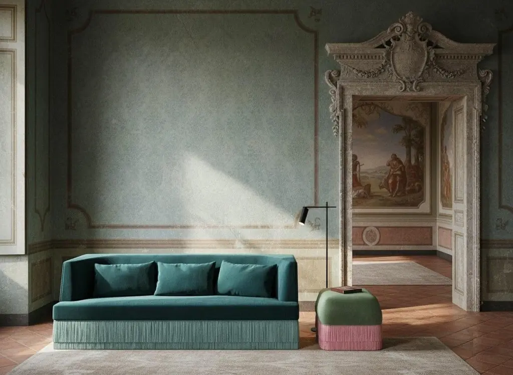 Alcove Linear Sofa In Alpaca Velvet With Fringe Skirt, Sidani Design