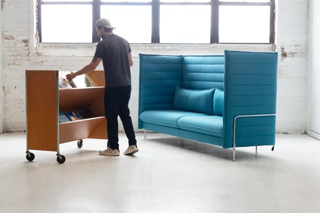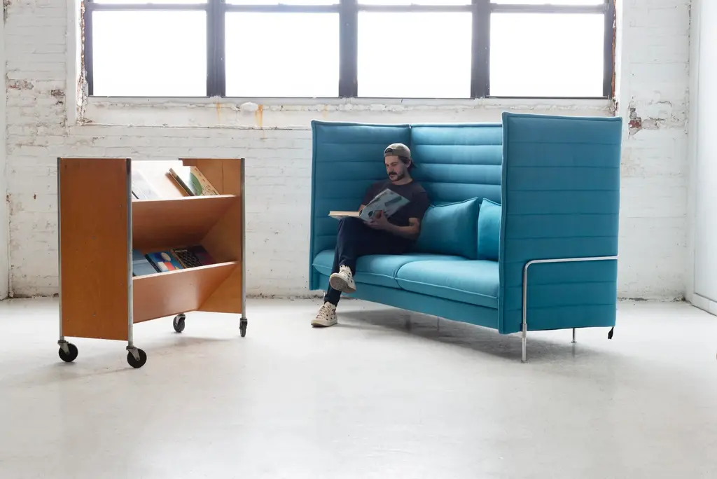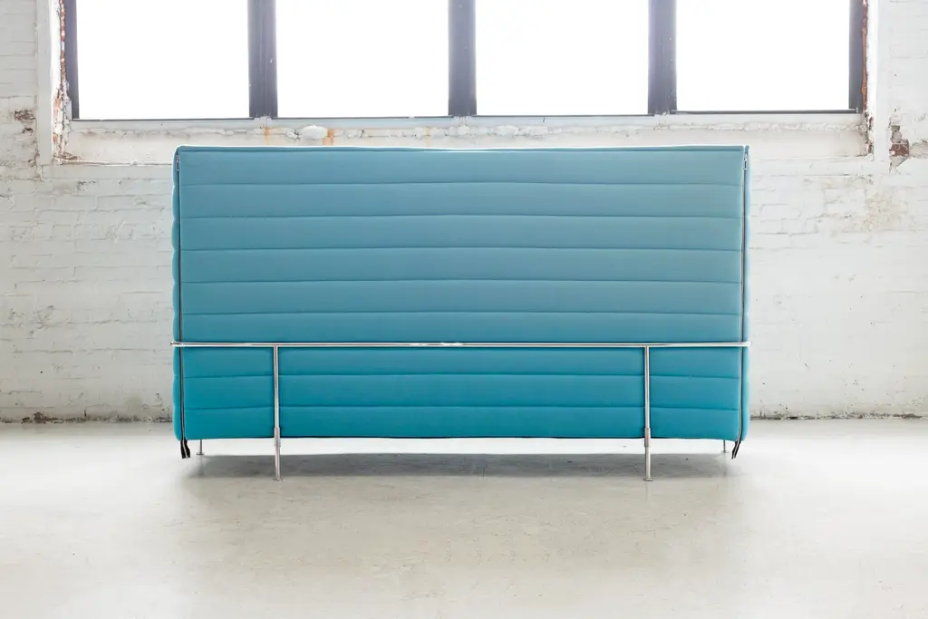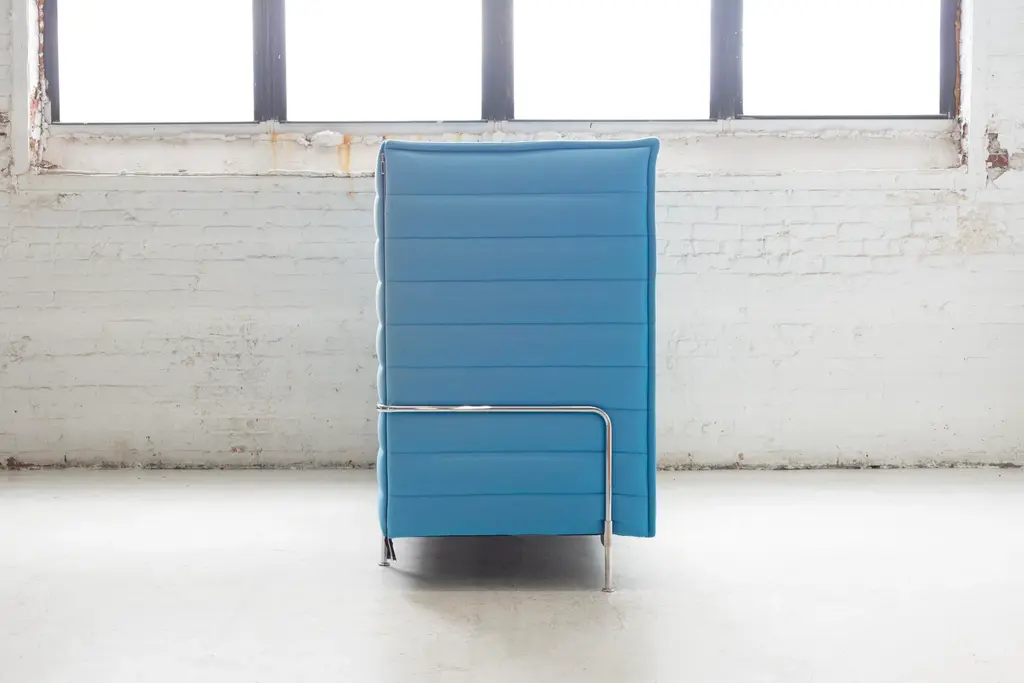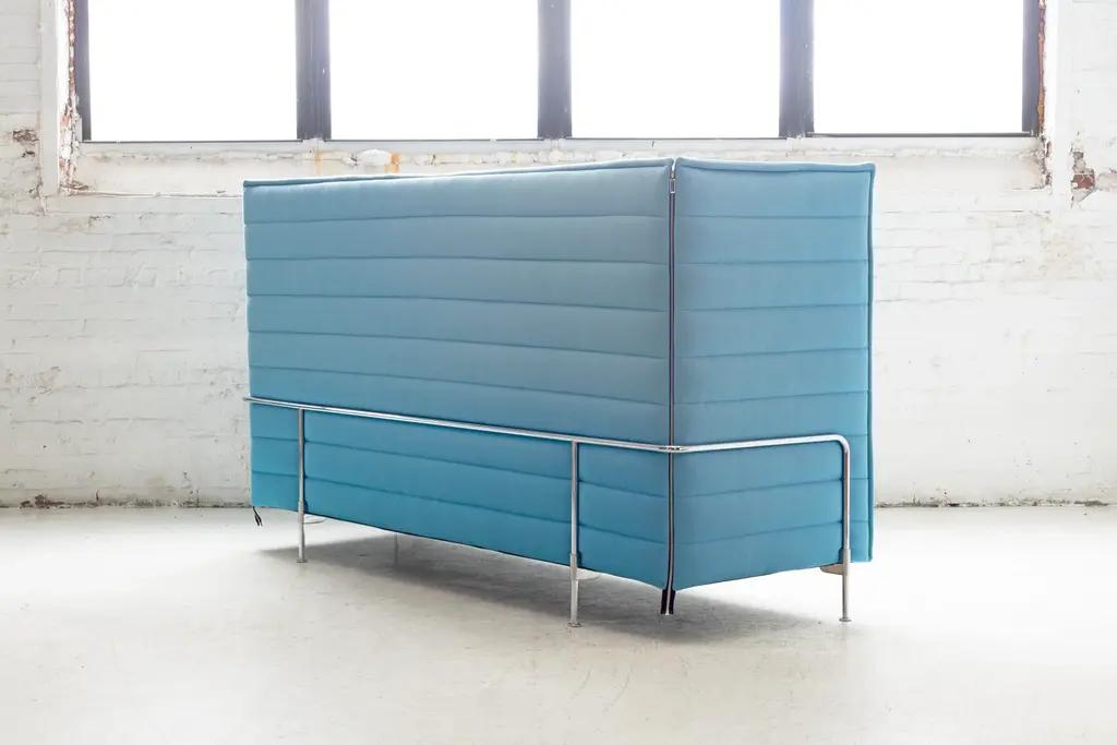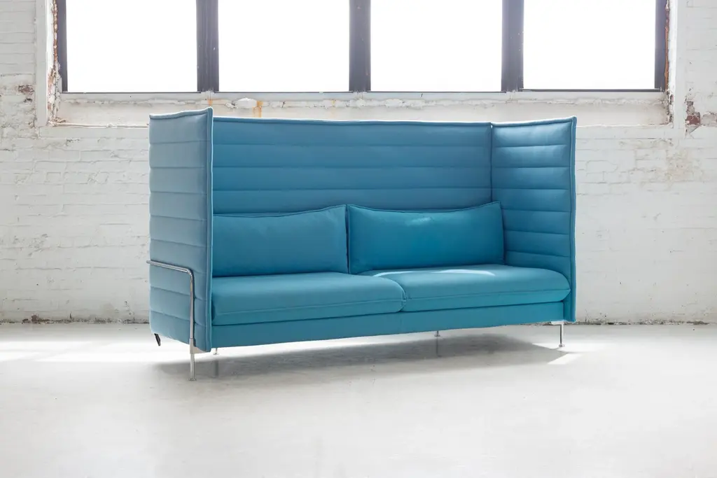 Alcove Sofa by Ronan & Erwan Bouroullec for Vitra A striking example of contemporary design, this Alcove sofa comes in a serene sky-blue upholstery that instantly brightens any space. Designed by Ronan & Erwan Bouroullec, the Alcove line is celebrated for its high side and back panels, creating a cozy, room-within-a-room feel perfect for both private retreat and social settings. This piece is lightly used, with some subtle sun fading to the fabric that lends a softened, lived-in character without compromising its clean lines or comfort. Built with Vitra’s signature craftsmanship, the sofa offers both style and durability, making it a refined addition to any modern interior.
