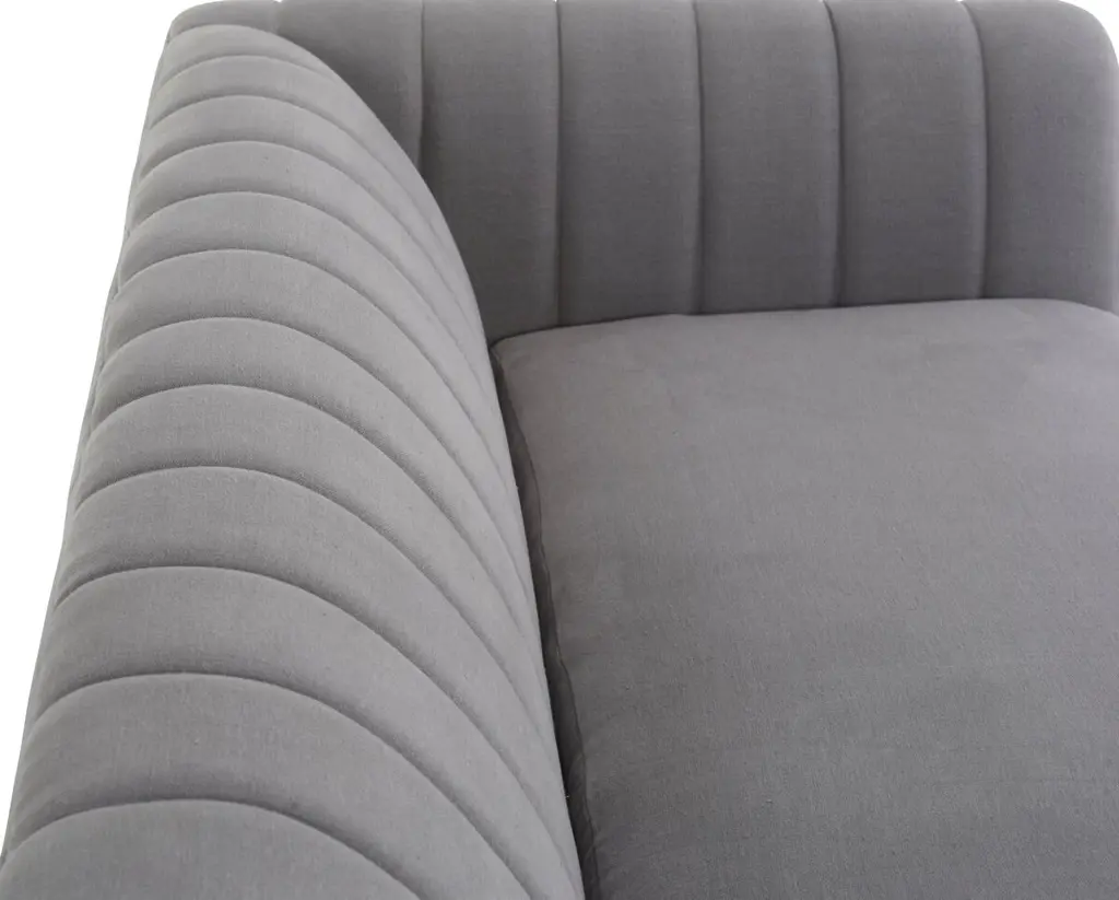 Designed by us and available only at One Kings Lane: Constructed with a tuxedo silhouette and tight back with quilted channeling, this sofa lends a modern mood to any space. Its black linen upholstery is filled with foam and bolstered to a sturdy alder frame for long-lasting comfort and support. Made in the USA.