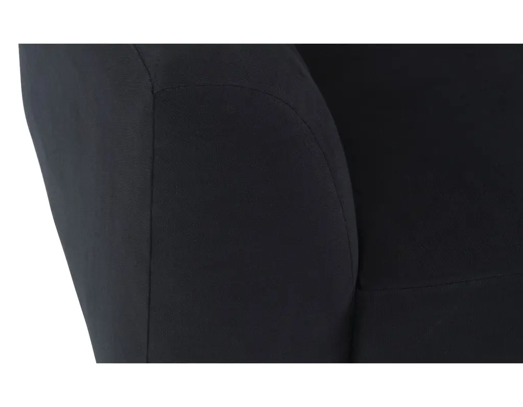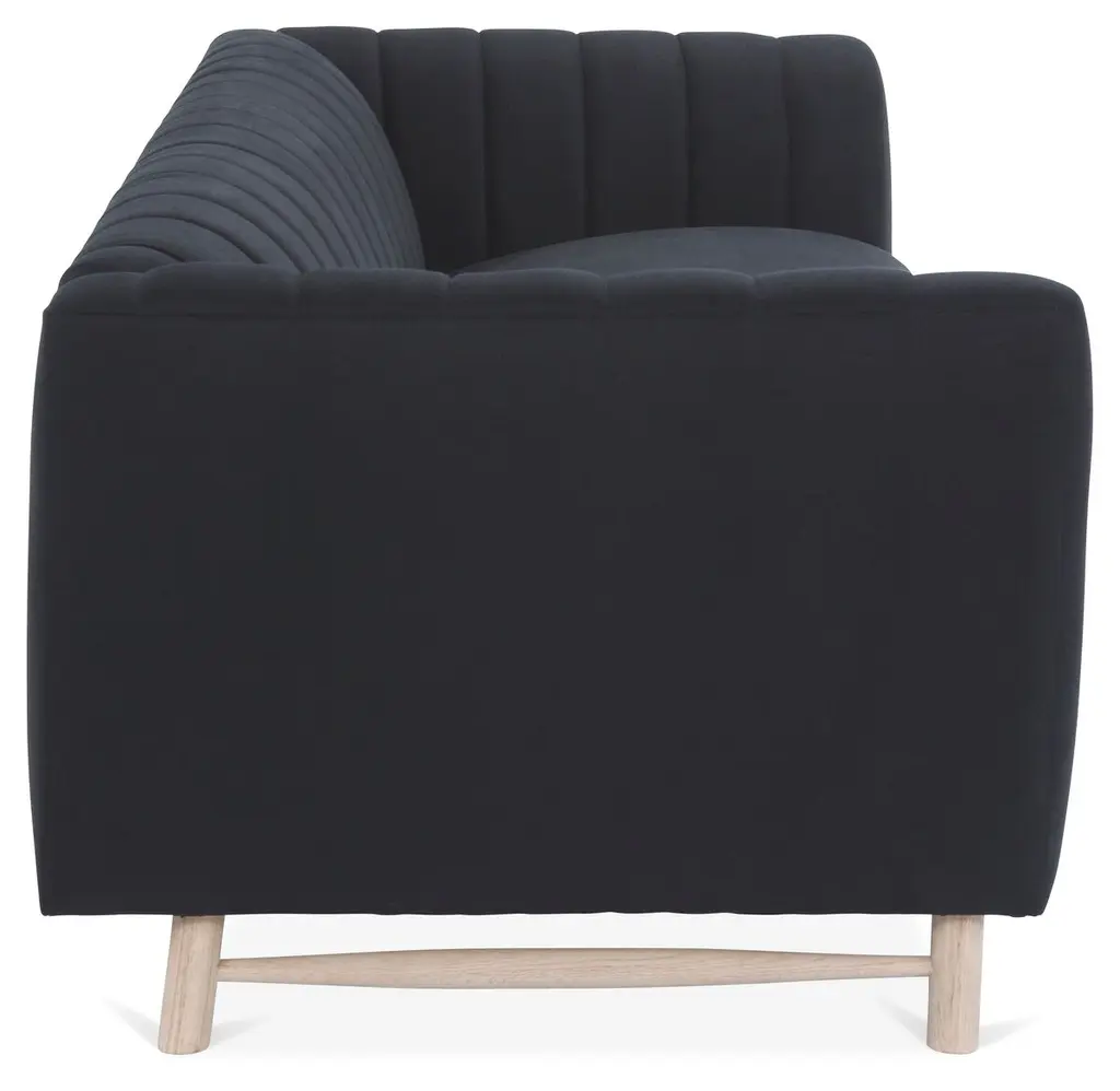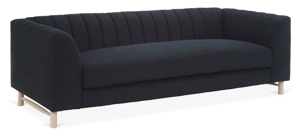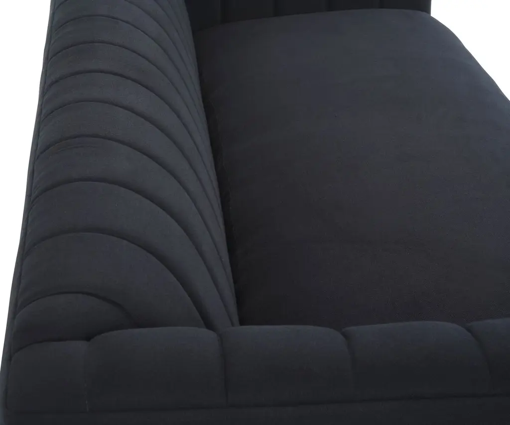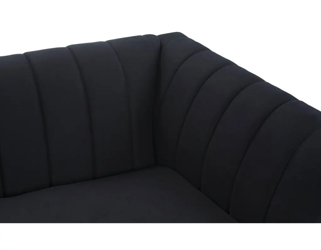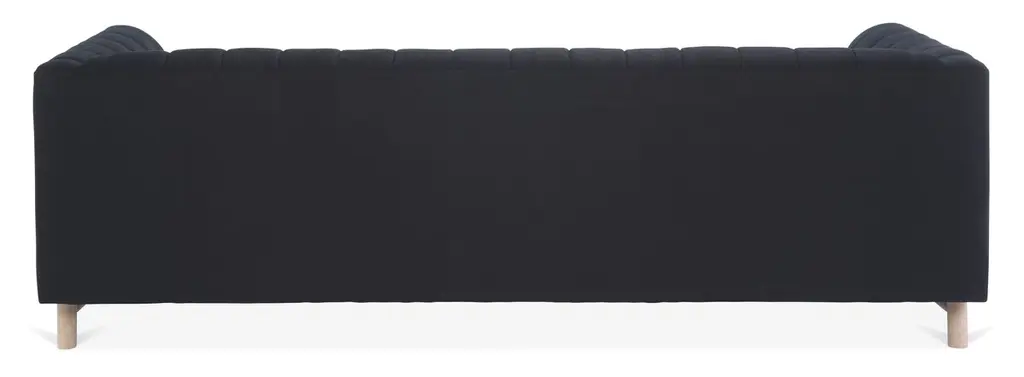 Designed by us and available only at One Kings Lane: Constructed with a tuxedo silhouette and tight back with quilted channeling, this sofa lends a modern mood to any space. Its black linen upholstery is filled with foam and bolstered to a sturdy alder frame for long-lasting comfort and support. Made in the USA.