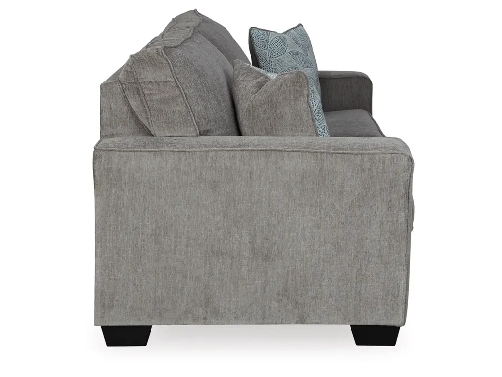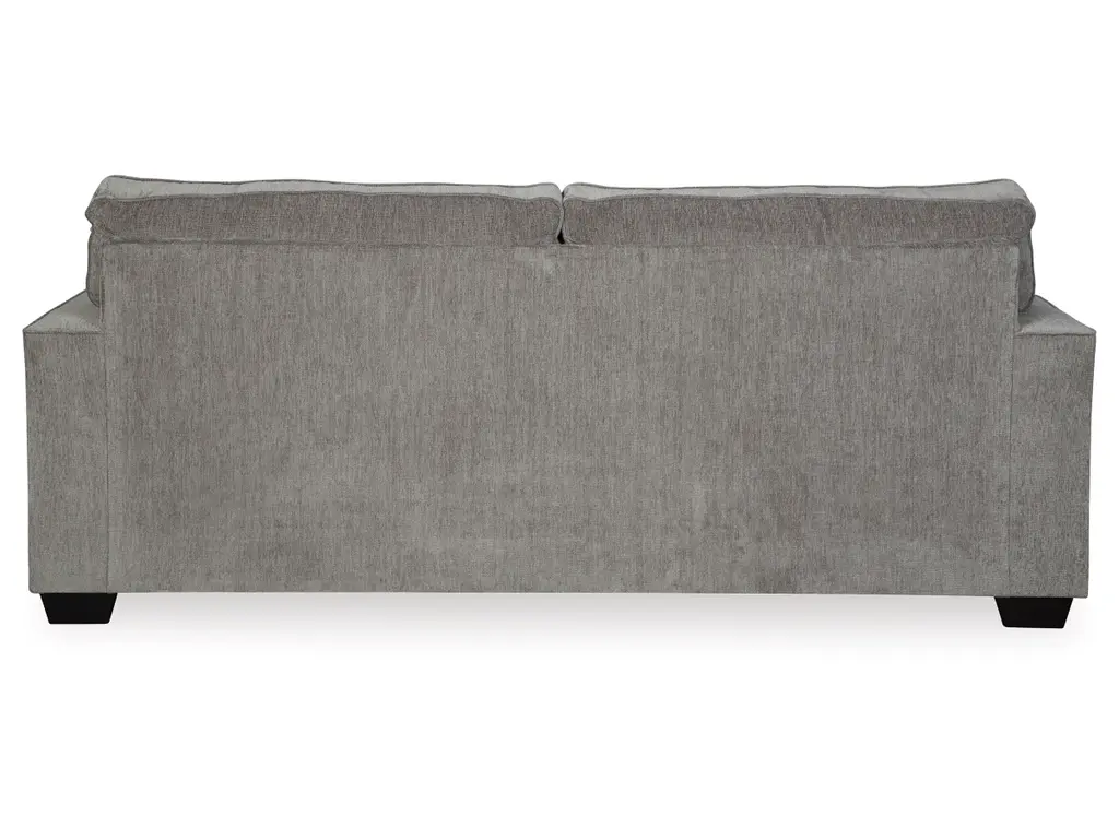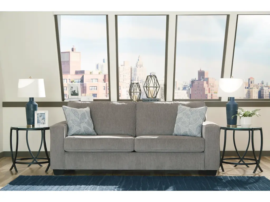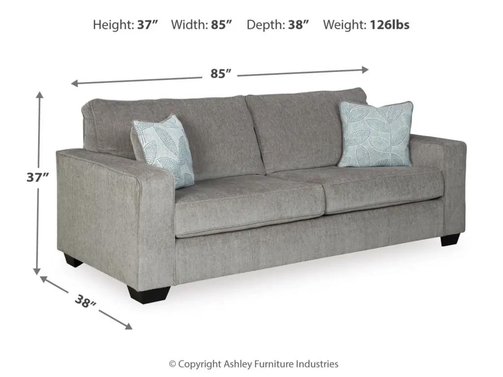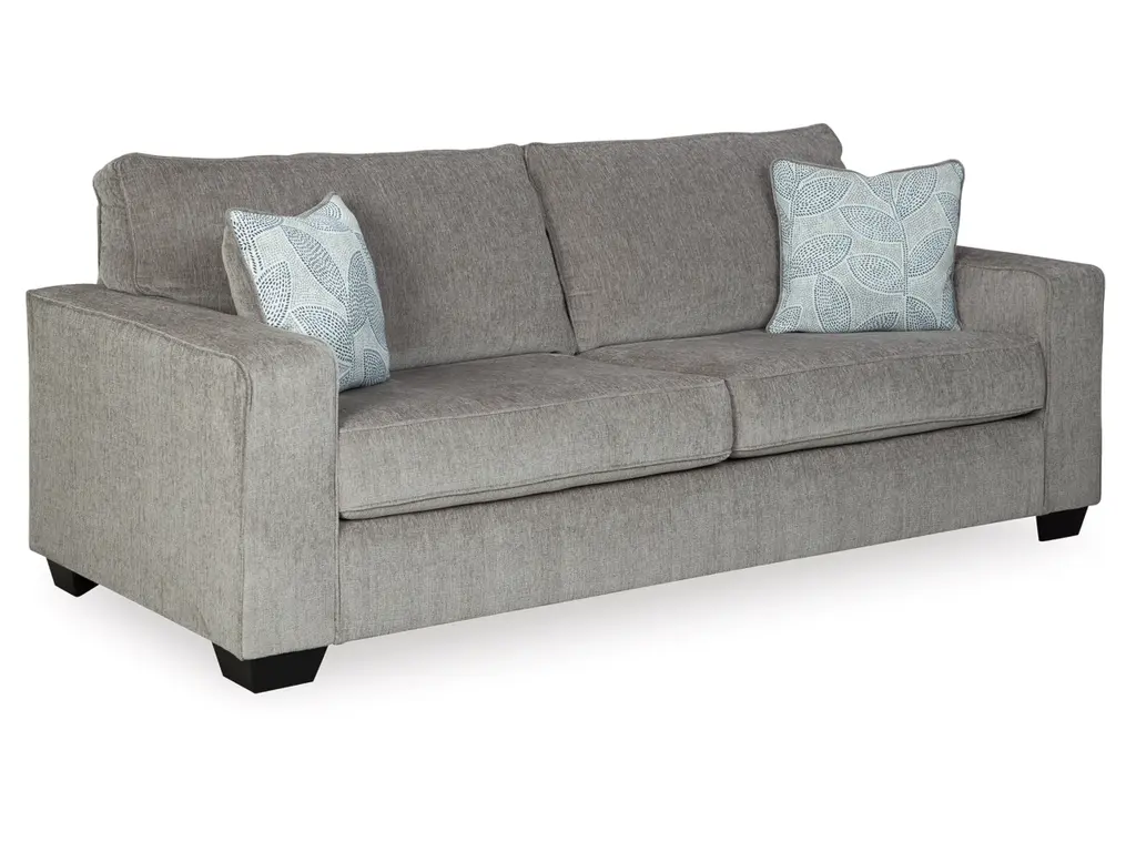 If style is the question, then the Altari sofa is the answer. Sporting clean lines and sleek track arms, the decidedly contemporary profile is enhanced with plump cushioning and a chenille-feel upholstery that's so pleasing to the touch. Sure to play well with so many color schemes, this sofa in richly neutral alloy includes a pair of understated floral pattern pillows for fashionably fresh appeal.