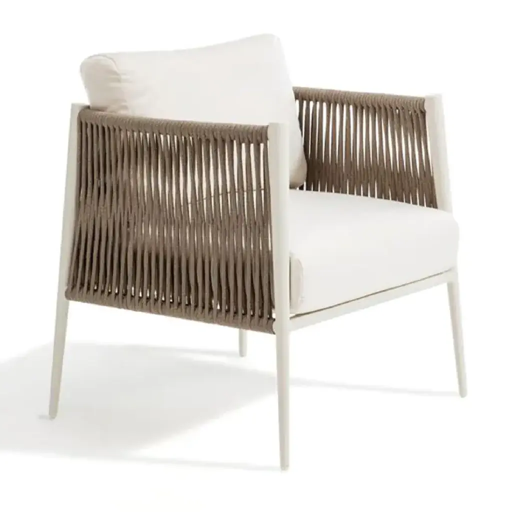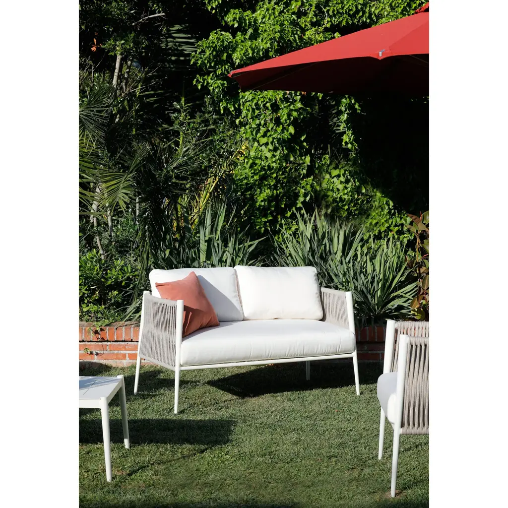 Indulge in the luxurious Luce collection, featuring an exquisite blend of aluminum and rope in the back and armrests. Elevate your outdoor space with the perfect combination of style and durability. Create a comfortable and elegant garden or terrace with the highly sought-after aluminum garden sofa by Unopiu Luce.