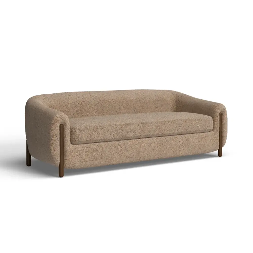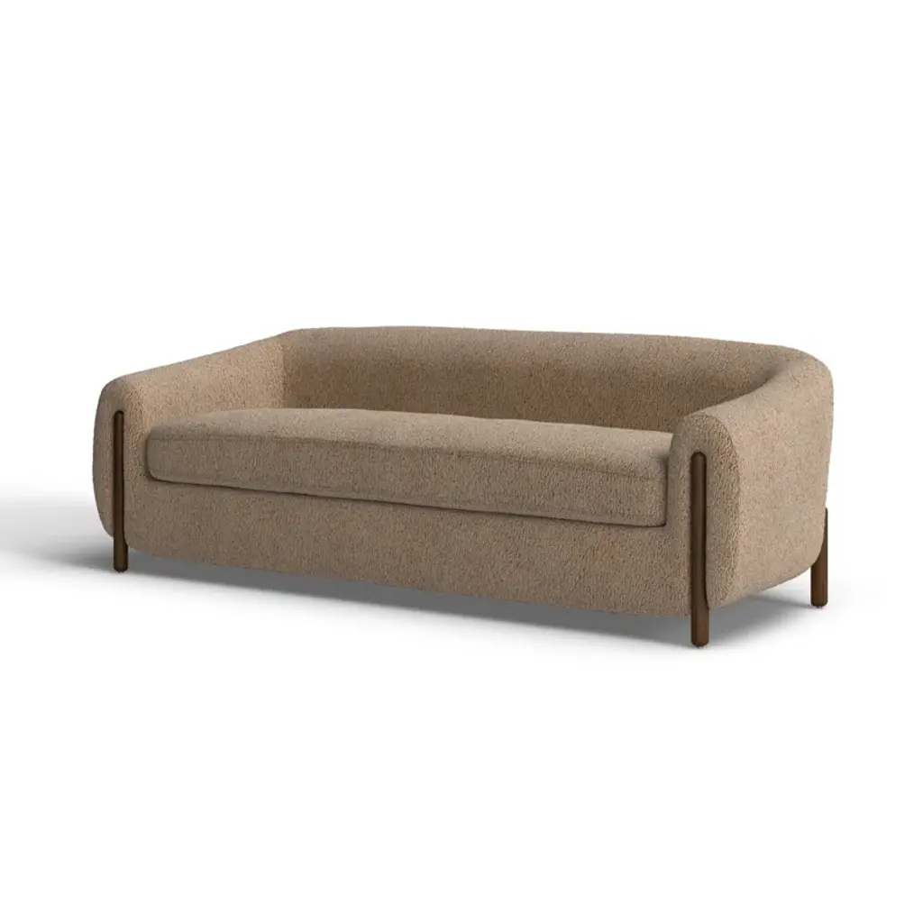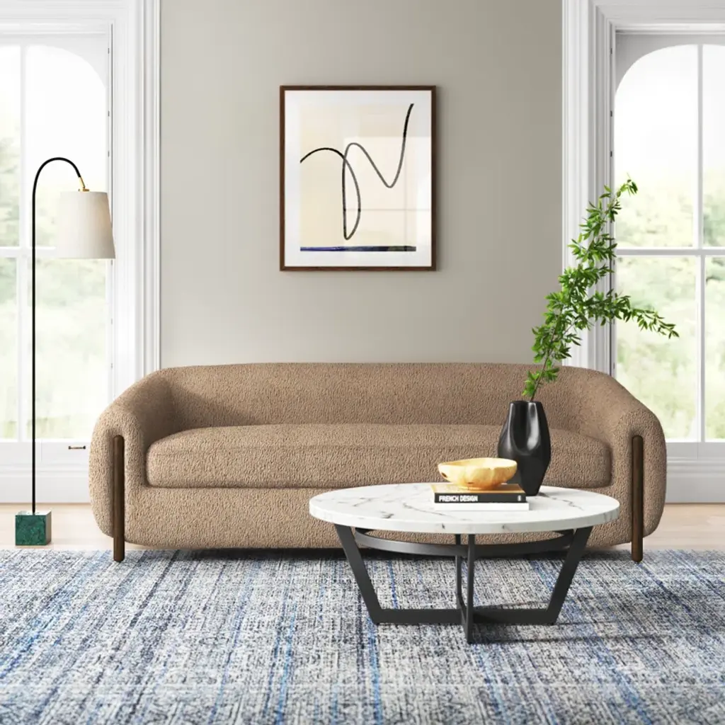 This curved sofa brings modern warmth to any room with its soft silhouette and cozy textured upholstery. Designed with a solid wood frame and plush filling, it offers both lasting support and cloud-like comfort. Round arms and dowel legs keep the look clean and contemporary, while the included accent pillow completes the relaxed, refined vibe. A removable seat cushion makes everyday upkeep simple.