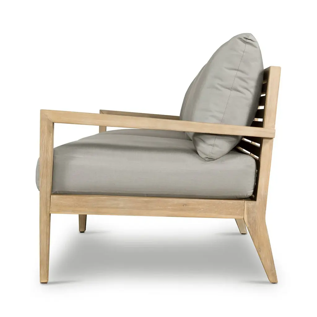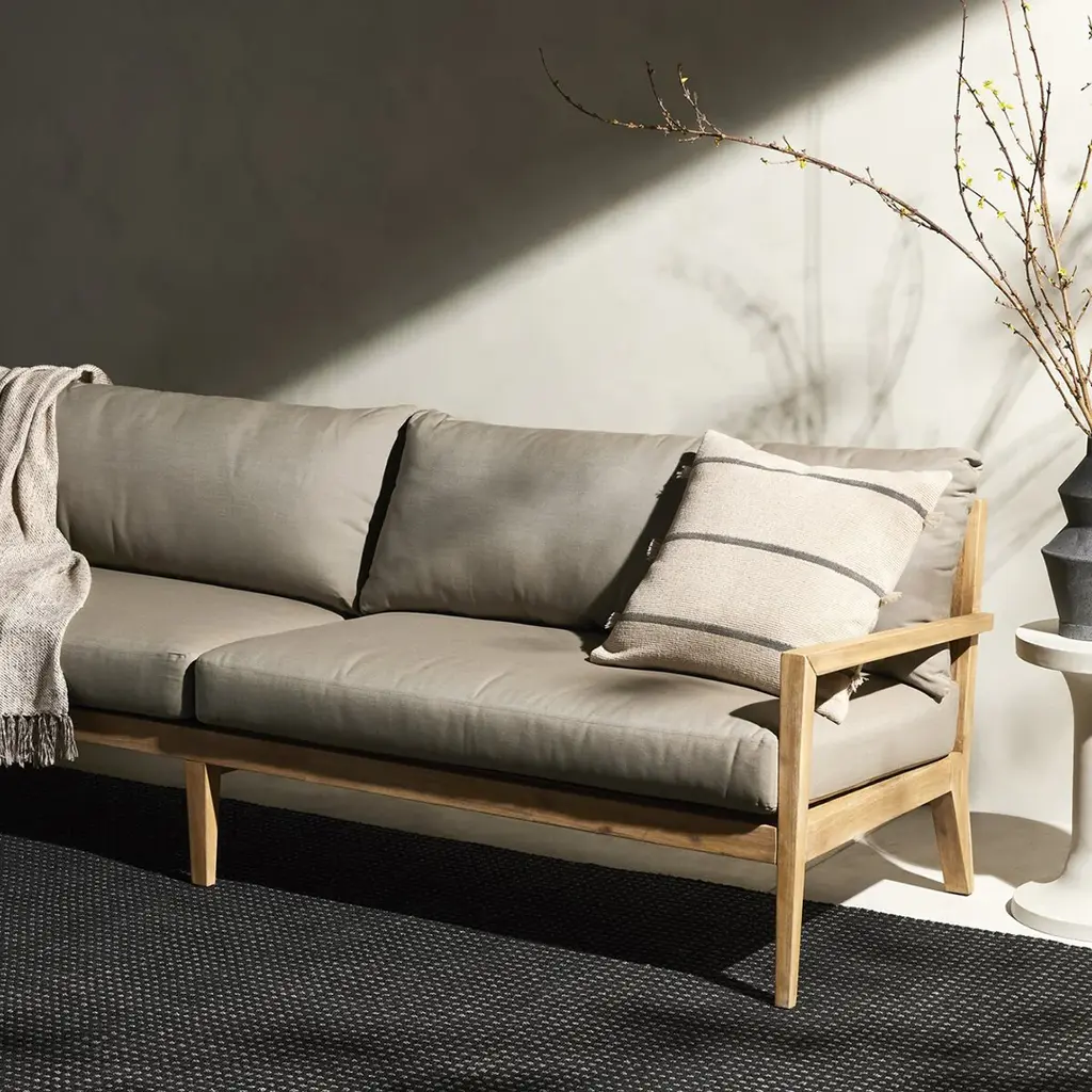 Simple yet sleek in muted natural tones, this outdoor sofa channels a transitional design crafted from solid FSC-certified acacia. Horizontal slats frame the back. Accented by a box seat cushion with velcro attachments, finished with a knife-edge back cushion. Cover or store indoors during inclement weather and when not in use. Ships In 10-14 Business Days All-weather cushion Slatted back Natural acacia frame This image is for illustrative purposes only. The colors shown are accurate within the constraints of lighting, photography, and the color accuracy of your screen.