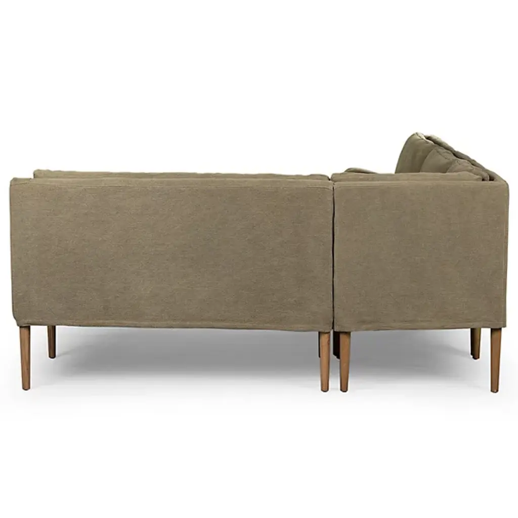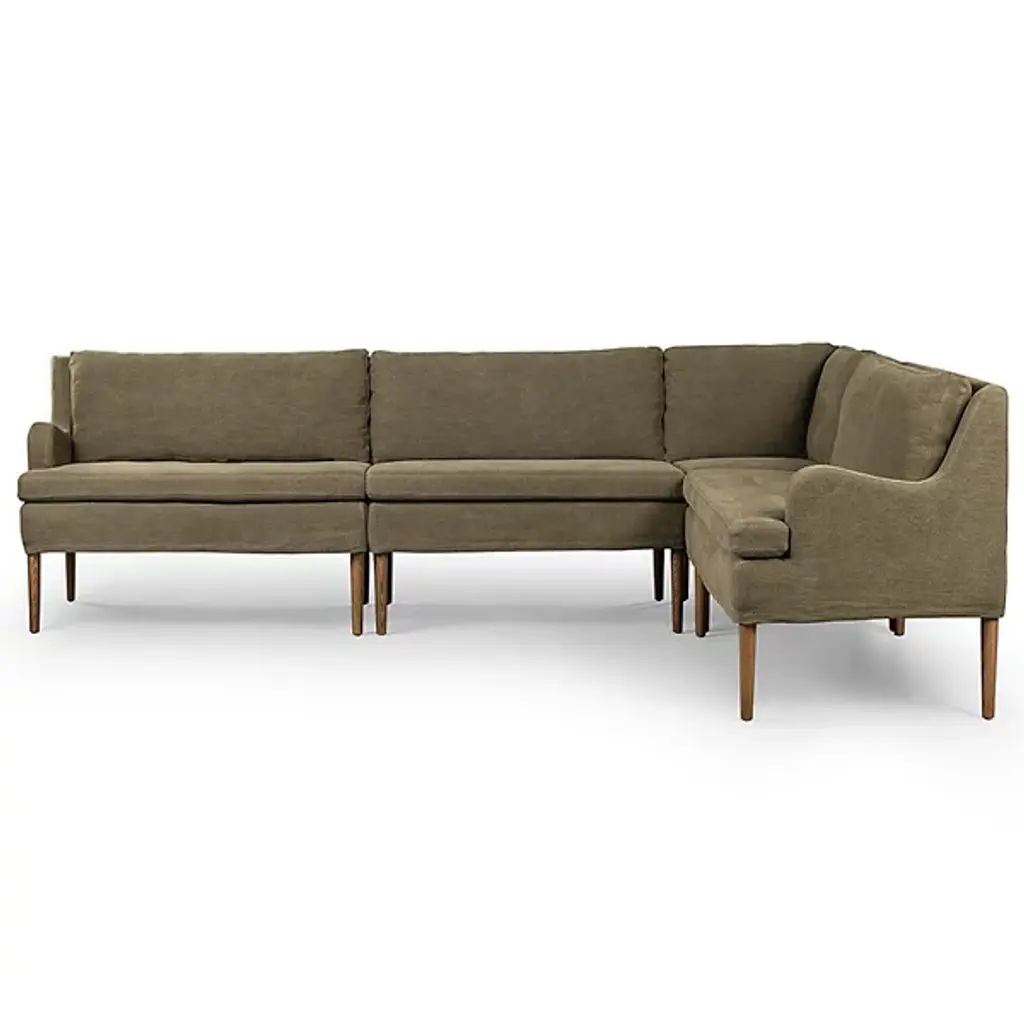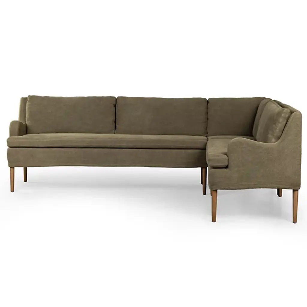 The Amber Lewis x Four Hands Aurelia Dining Banquette Sofa turns corner spaces into inviting dining nooks through thoughtful angles and proportions. The L-configuration maximizes seating while maintaining an open feeling that encourages relaxed gatherings. Playful sloping track arms define the perimeter without overwhelming the clean, fluid lines of the frame. The 100% linen upholstery offers natural breathability and tactile appeal, while the solid oak legs provide stable support. Inside, polyester fiber batting and waterfowl feather filling create cushions that are both comfortable and recoverable. This banquette bridges formal dining and casual lounging for spaces that accommodate both everyday meals and special occasions.