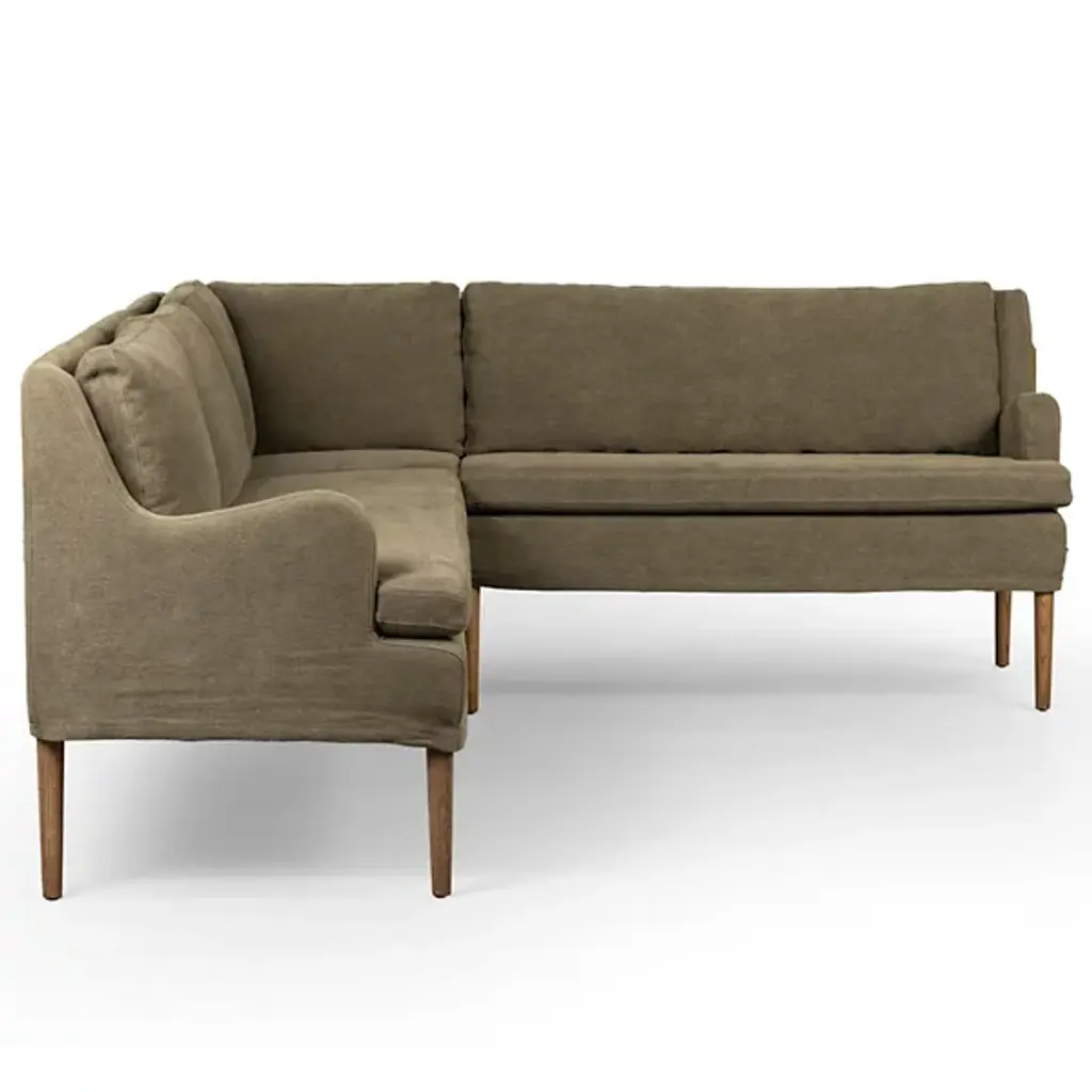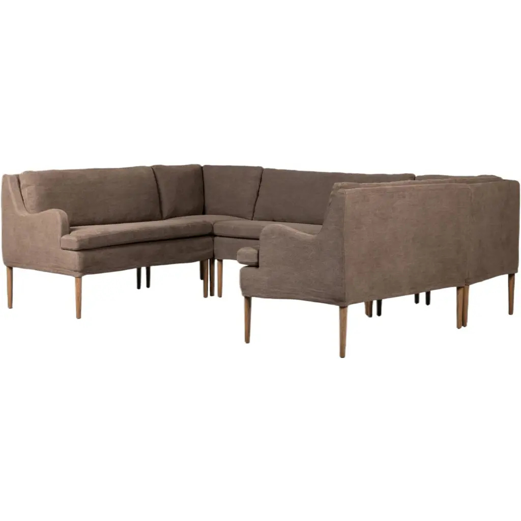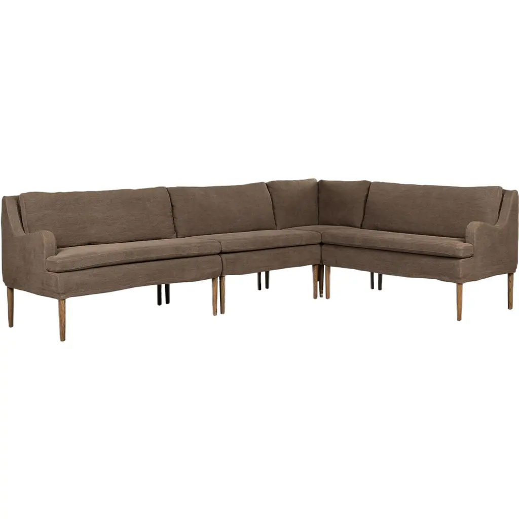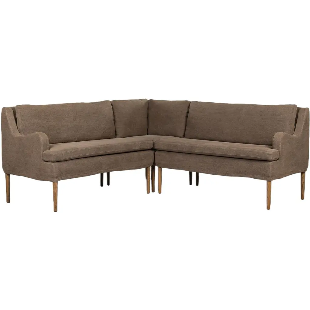 The Amber Lewis x Four Hands Aurelia Dining Banquette Sofa turns corner spaces into inviting dining nooks through thoughtful angles and proportions. The L-configuration maximizes seating while maintaining an open feeling that encourages relaxed gatherings. Playful sloping track arms define the perimeter without overwhelming the clean, fluid lines of the frame. The 100% linen upholstery offers natural breathability and tactile appeal, while the solid oak legs provide stable support. Inside, polyester fiber batting and waterfowl feather filling create cushions that are both comfortable and recoverable. This banquette bridges formal dining and casual lounging for spaces that accommodate both everyday meals and special occasions.