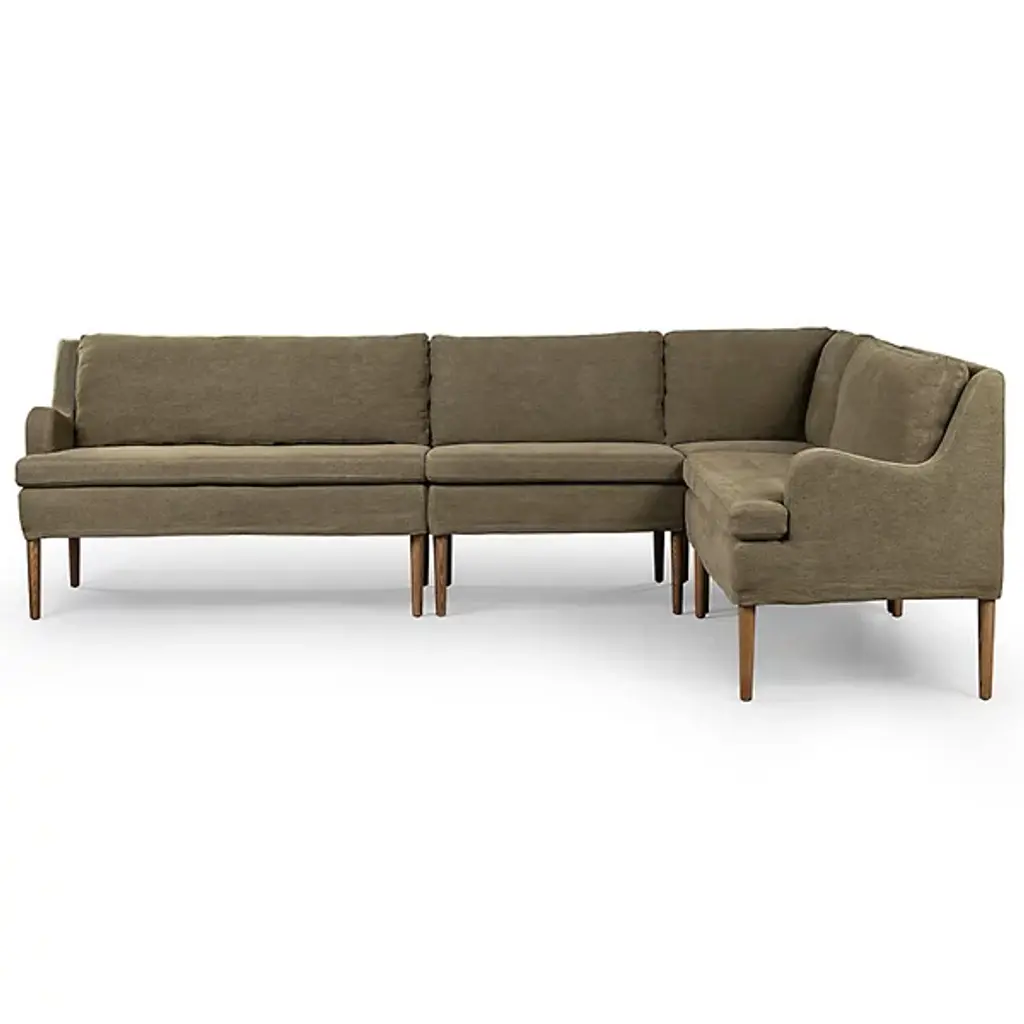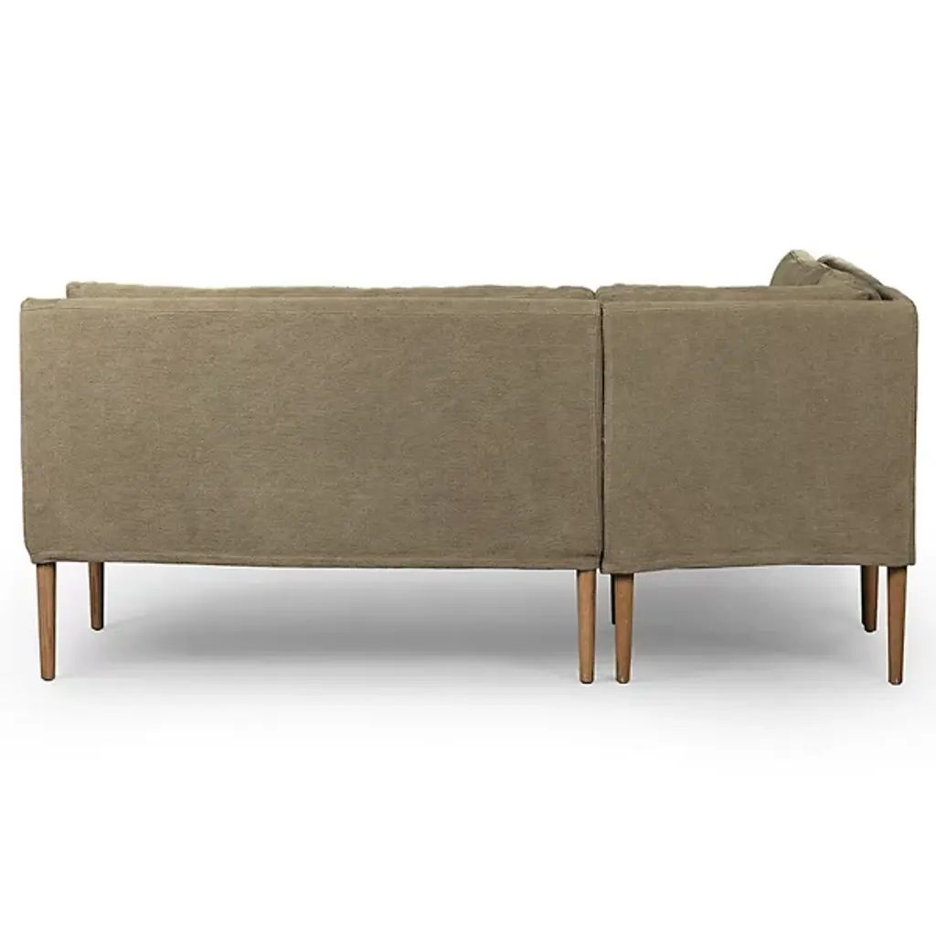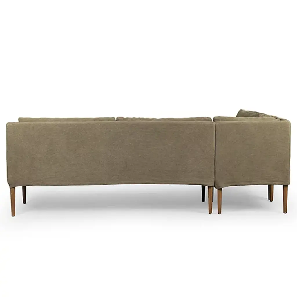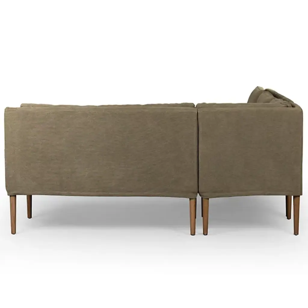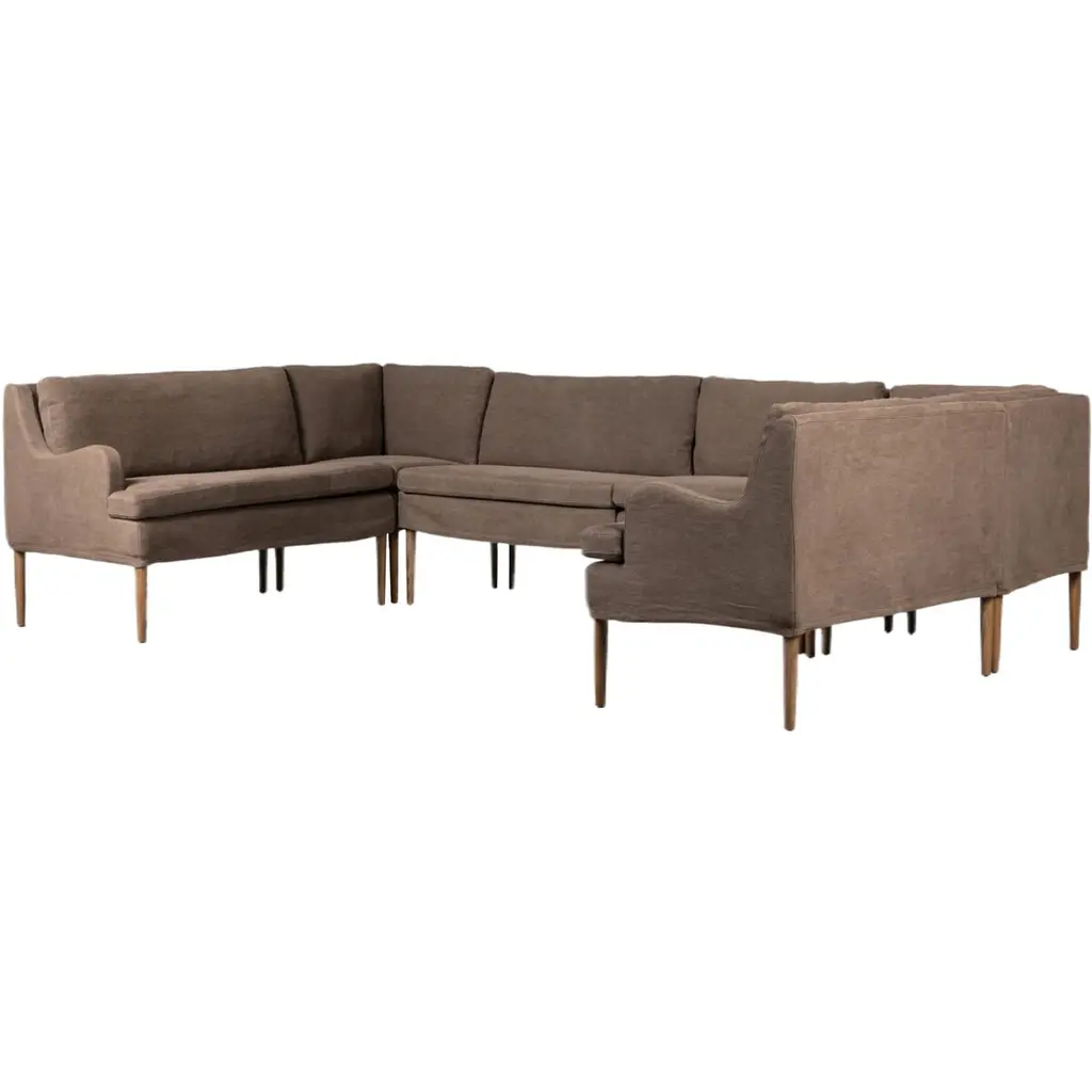 The Amber Lewis x Four Hands Aurelia Dining Banquette Sofa turns corner spaces into inviting dining nooks through thoughtful angles and proportions. The L-configuration maximizes seating while maintaining an open feeling that encourages relaxed gatherings. Playful sloping track arms define the perimeter without overwhelming the clean, fluid lines of the frame. The 100% linen upholstery offers natural breathability and tactile appeal, while the solid oak legs provide stable support. Inside, polyester fiber batting and waterfowl feather filling create cushions that are both comfortable and recoverable. This banquette bridges formal dining and casual lounging for spaces that accommodate both everyday meals and special occasions.
