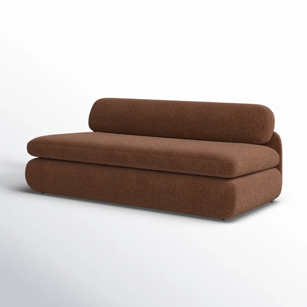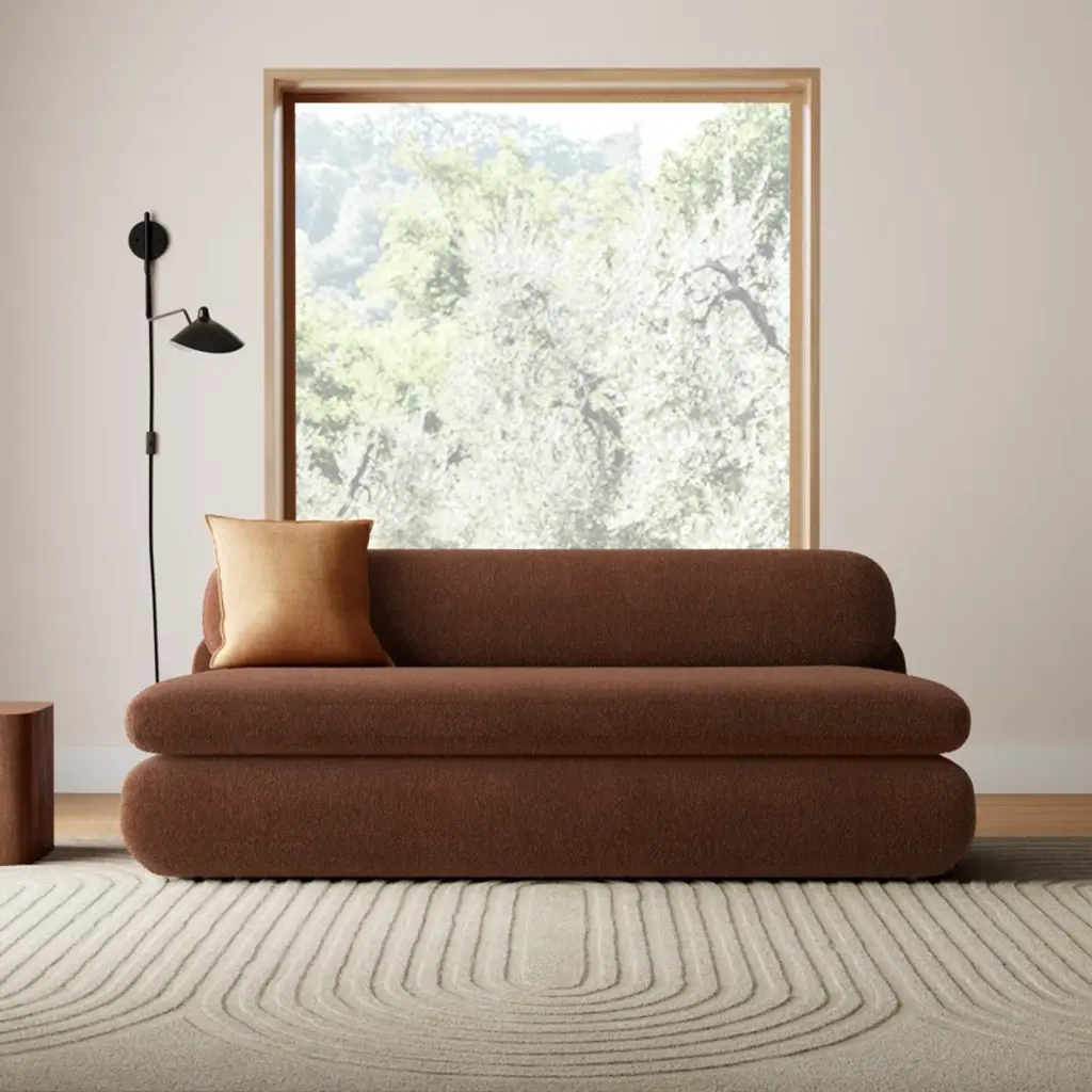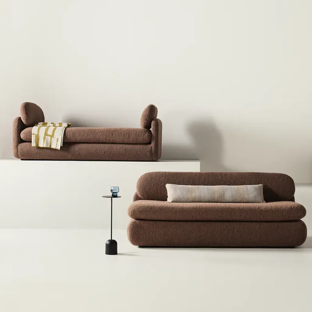 Inspired by the captivating styles of the ‘70s, this sofa brings a piece of the past into the present. Clad in textured boucle fabric, it merges visual allure + tactility. A curved form, combined with a rounded and elongated cushion, introduces a touch of softness to any space, while the plump seat cushion promises modern comfort.