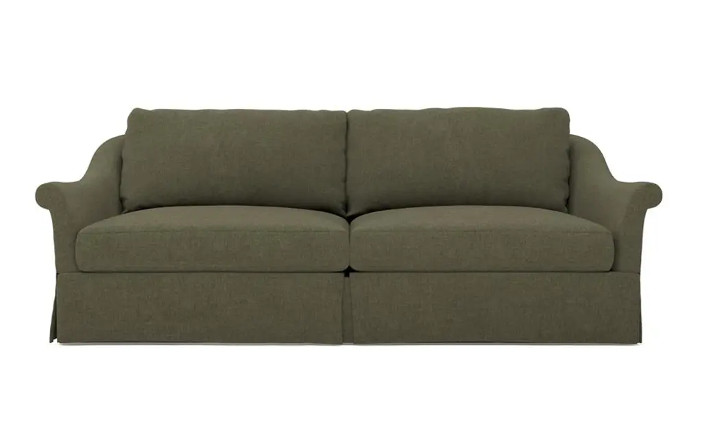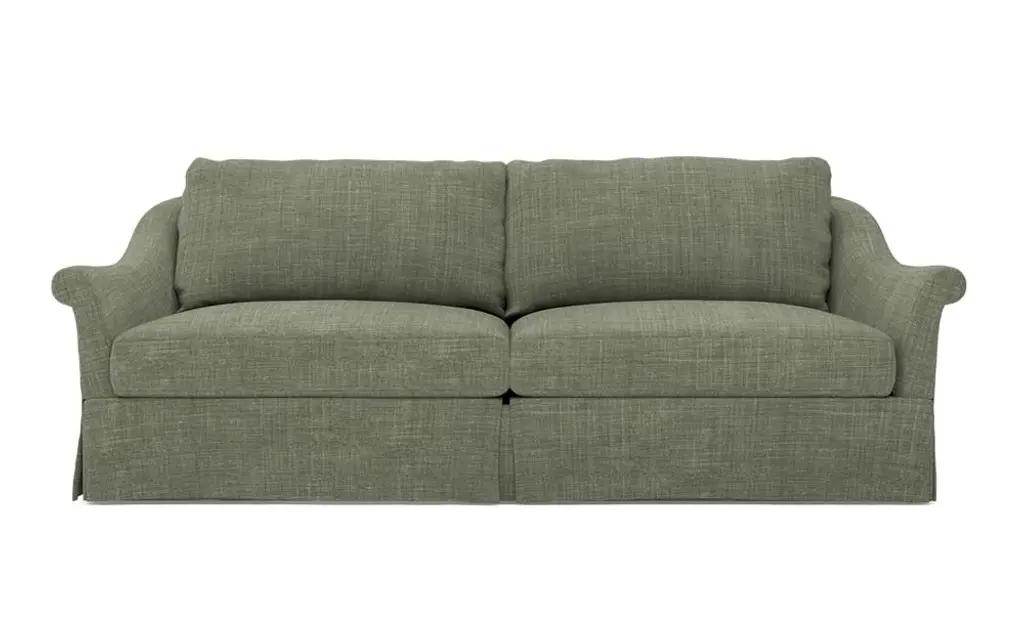 A Kathy Kuo Home exclusive, our 92” Amelie sofa has an elegant, timeless French design. The seat cushions offer EXTRAORDINARY COMFORT, with a foam core surrounded by a blend of feathers and duck down. With flared roll arms, a skirted base, and a gently curved, subtly tapered back, the chic silhouette embodies classic sophistication and is beautiful from every angle. Choose from a variety of upholstery options, including linen and performance fabrics.