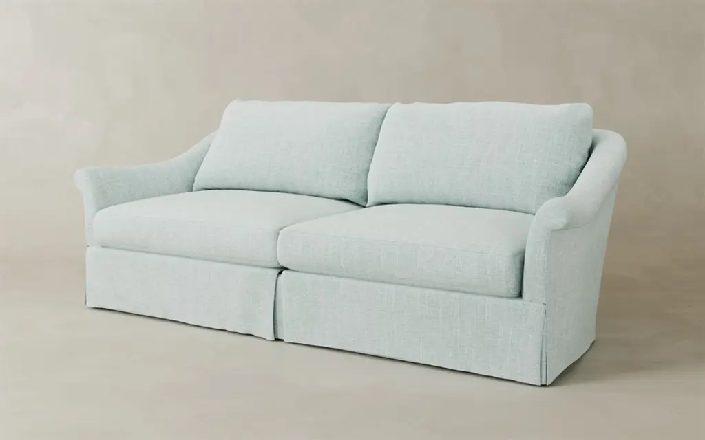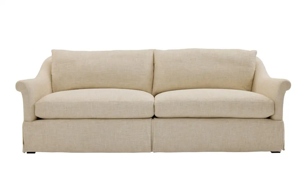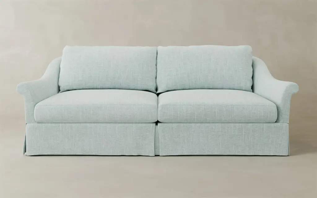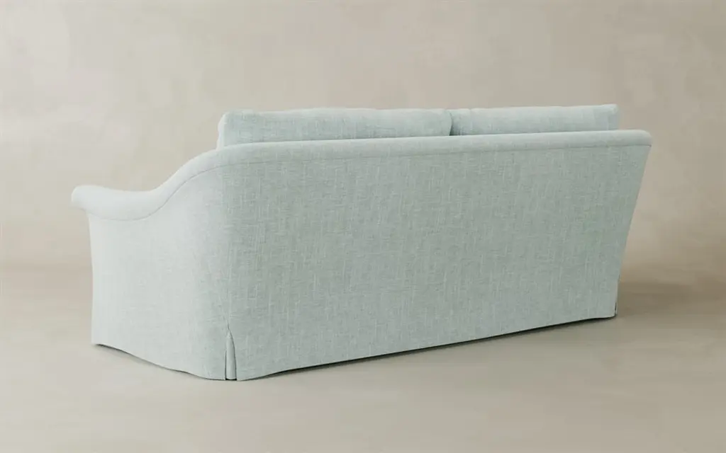 A Kathy Kuo Home exclusive, our 92” Amelie sofa has an elegant, timeless French design. The seat cushions offer EXTRAORDINARY COMFORT, with a foam core surrounded by a blend of feathers and duck down. With flared roll arms, a skirted base, and a gently curved, subtly tapered back, the chic silhouette embodies classic sophistication and is beautiful from every angle. Choose from a variety of upholstery options, including linen and performance fabrics.