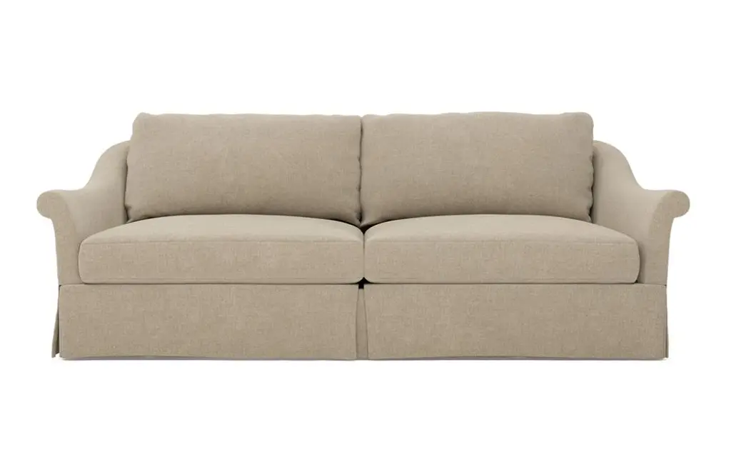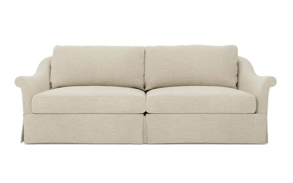 A Kathy Kuo Home exclusive, our 92” Amelie sofa has an elegant, timeless French design. The seat cushions offer EXTRAORDINARY COMFORT, with a foam core surrounded by a blend of feathers and duck down. With flared roll arms, a skirted base, and a gently curved, subtly tapered back, the chic silhouette embodies classic sophistication and is beautiful from every angle. Choose from a variety of upholstery options, including linen and performance fabrics.