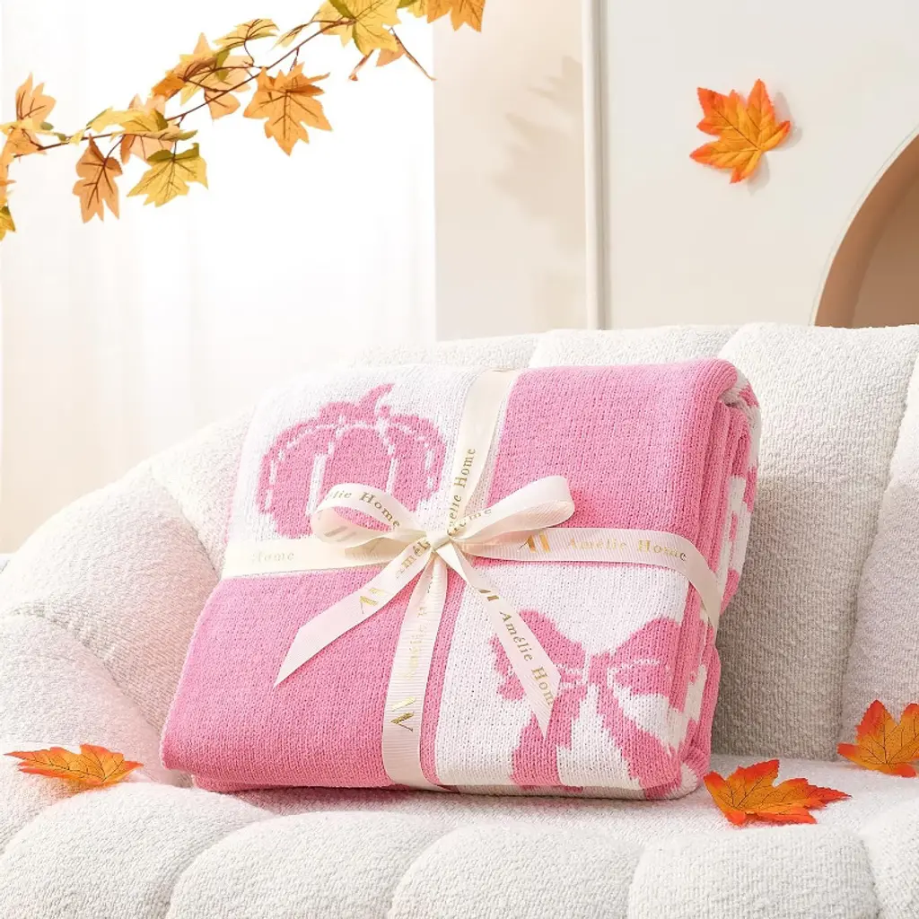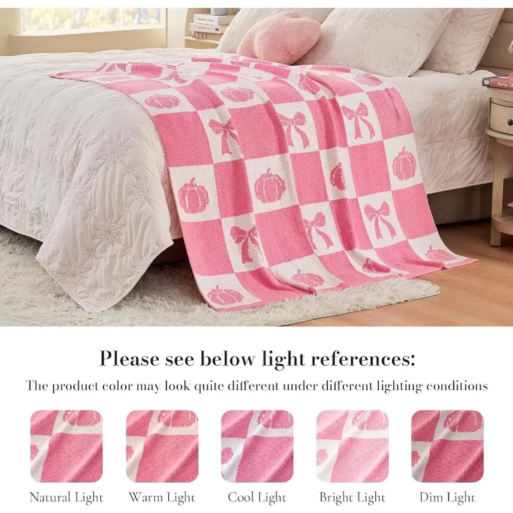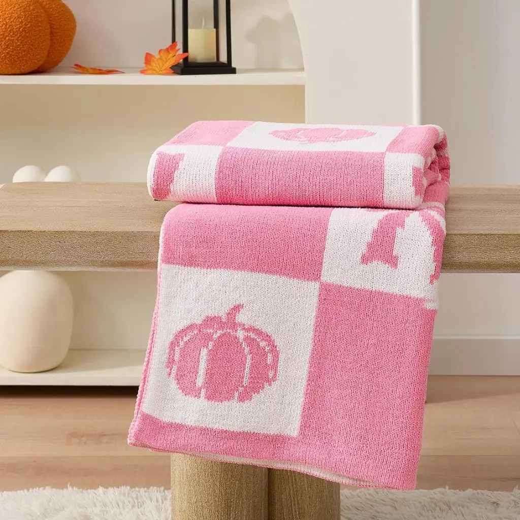 Amelie Home Chenille Knit Throw Blanket, Ultra-soft Cozy Fall Throw, Pink Pumpkin Plaid, Stylish Autumn Decor For Couch Bed