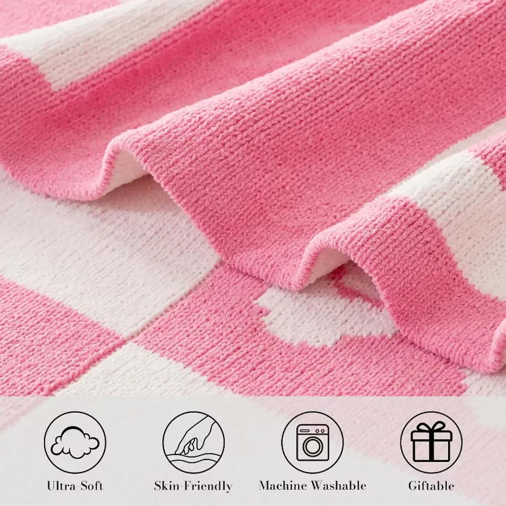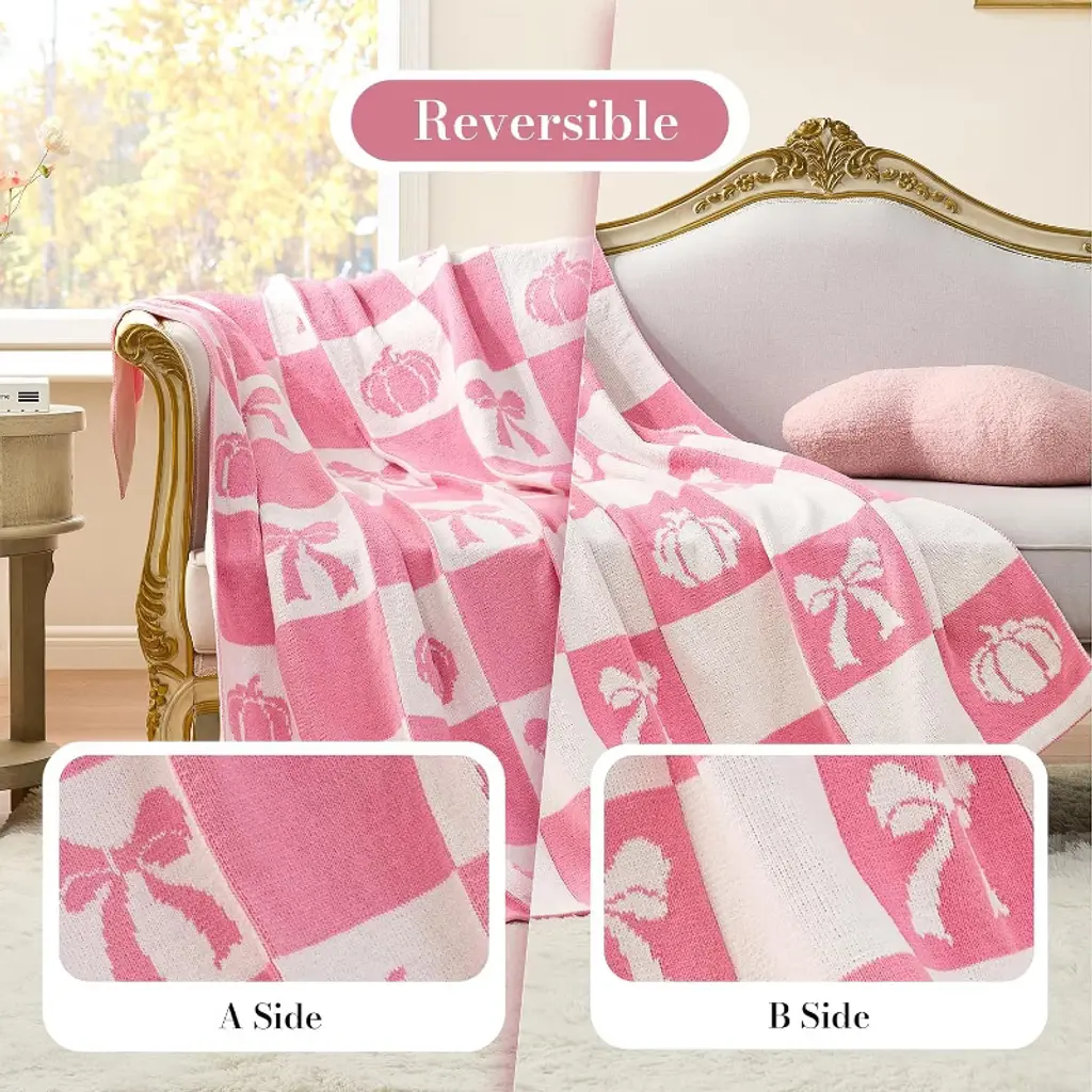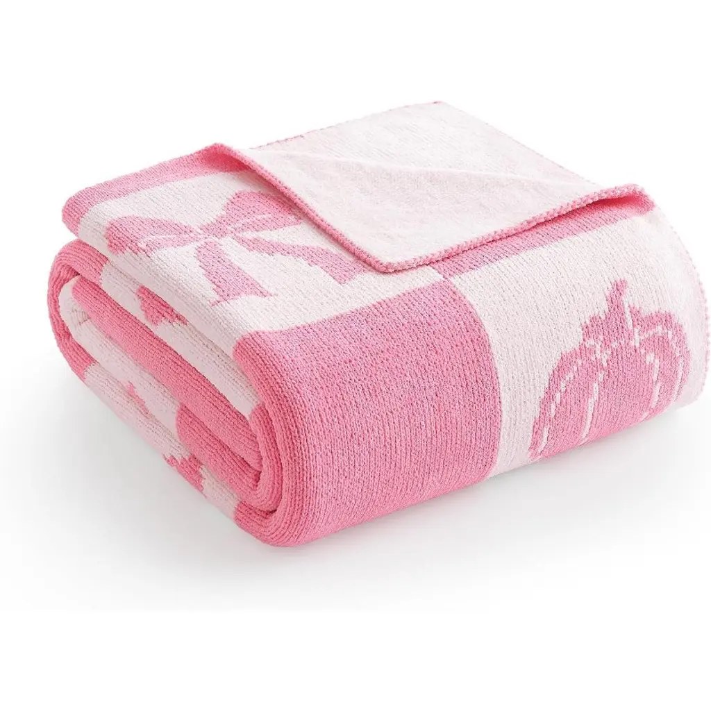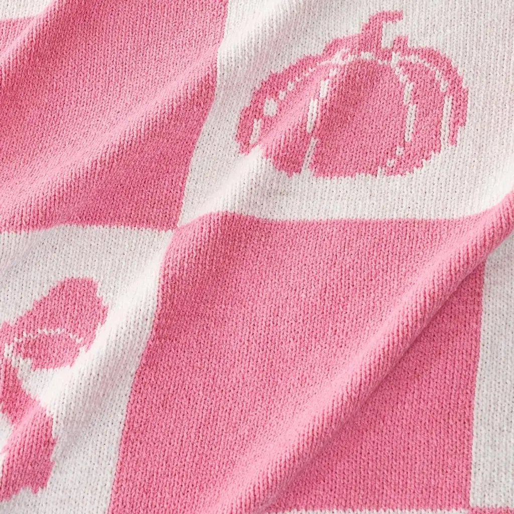 Amelie Home Chenille Knit Throw Blanket, Ultra-soft Cozy Fall Throw, Pink Pumpkin Plaid, Stylish Autumn Decor For Couch Bed