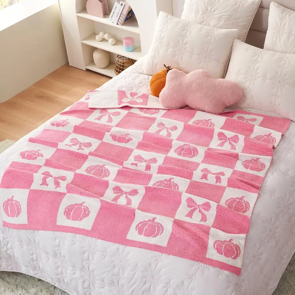 An ultra-soft, OEKO-TEX certified throw designed for both comfort and style. Featuring a playful blend of pumpkins, bows, and checkerboard patterns, this modern design puts a chic spin on traditional autumn themes. The plush chenille fabric offers cozy warmth for cool evenings and is gentle enough for babies and pets. Whether you're curling up indoors or adding charm to an outdoor gathering, this lightweight yet durable blanket is the perfect seasonal accessory. It makes a thoughtful gift for holidays or housewarmings, and its breathable texture ensures year-round versatility. Plus, it’s machine washable for easy, low-maintenance care. Add a unique, stylish touch to your space with a fall throw that combines elegance, functionality, and festive flair.