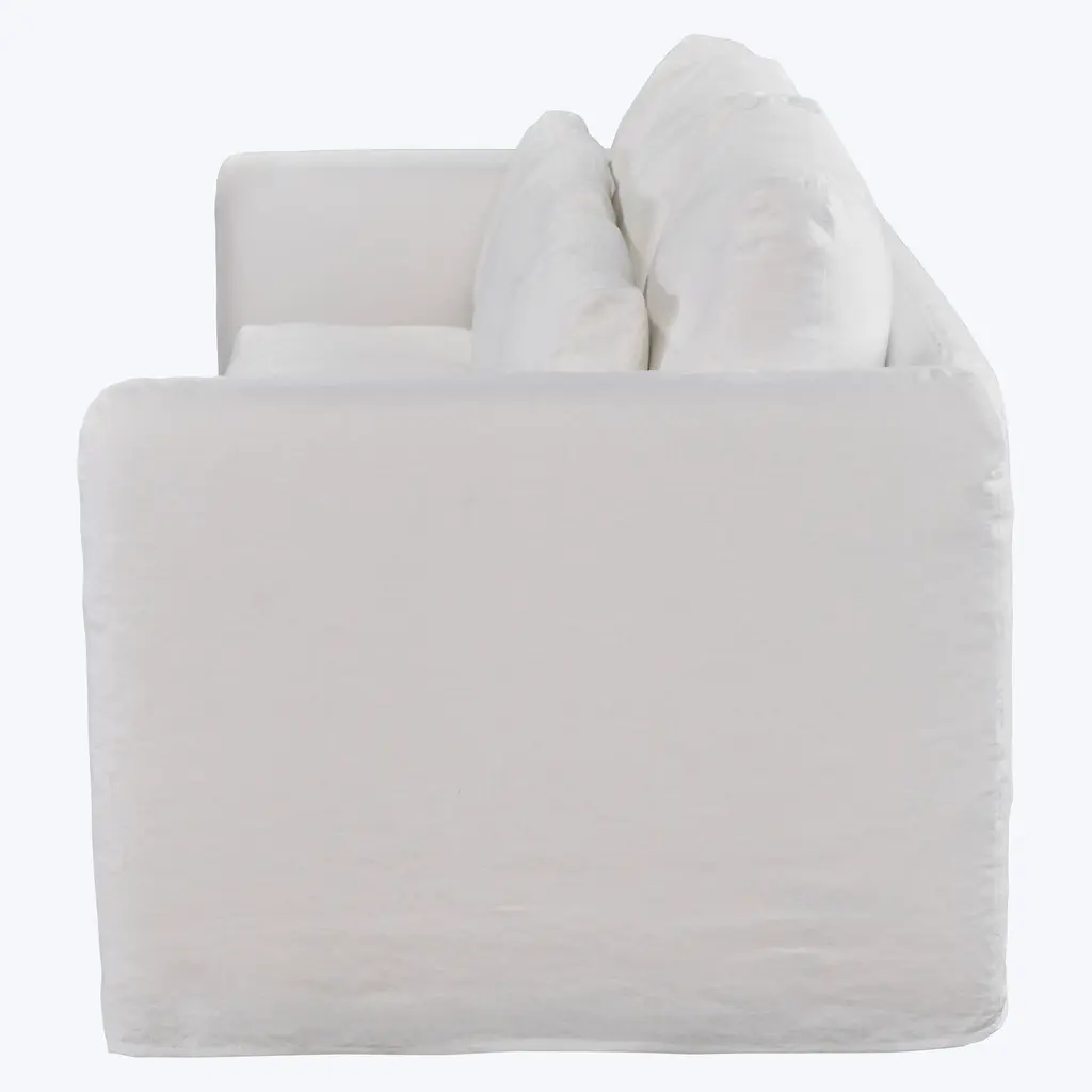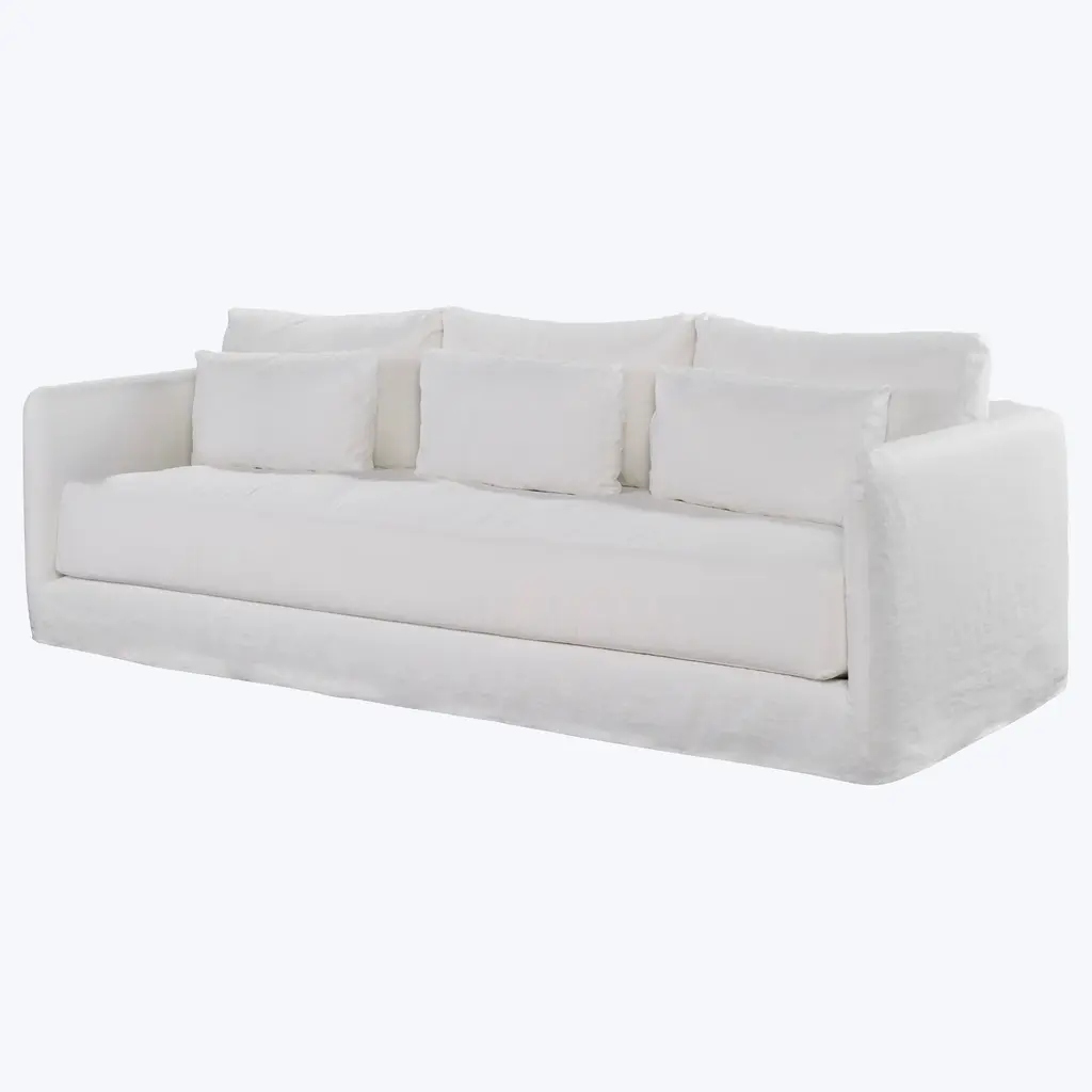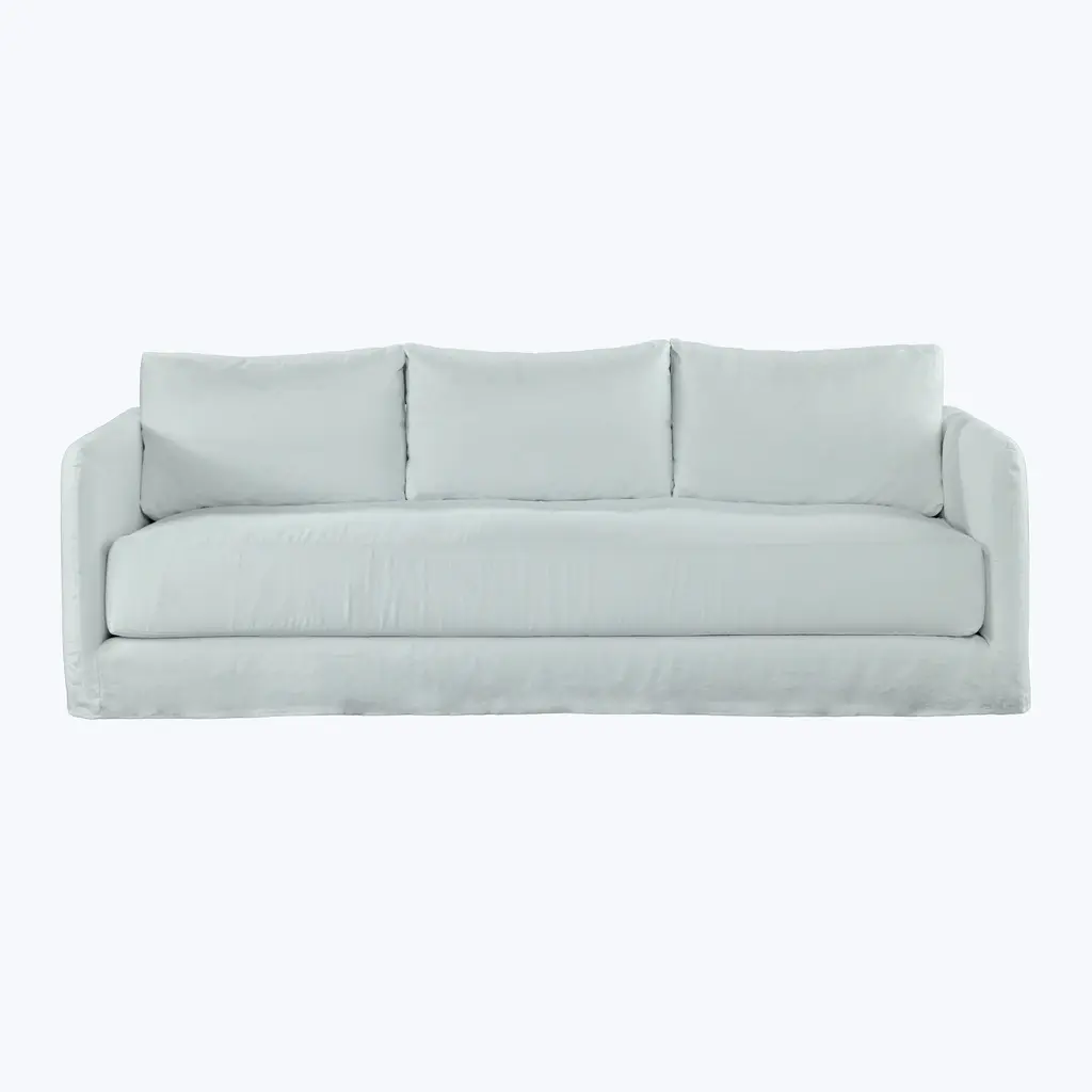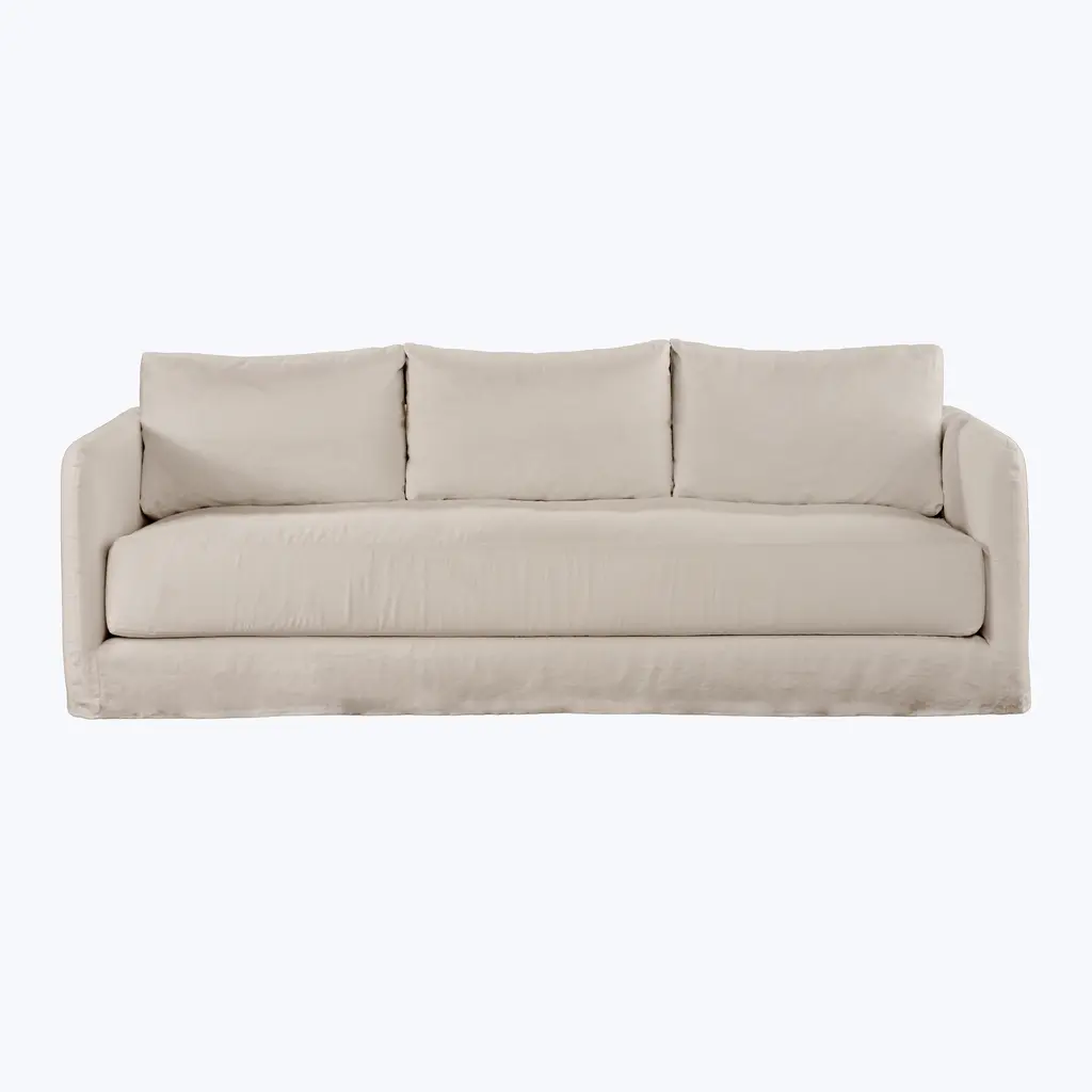 The Anderson Sofa by Cisco Home invites you to slow down, sink in, and stay awhile. Slipped in Luna White, a 100% cotton fabric that feels as fresh as it looks. Clean, understated lines strike the perfect balance between tailored elegance and everyday ease. Handcrafted in the USA, every detail speaks to comfort and craft: a supportive webbed seat topped with one long bench cushion, three generous loose back cushions, and three boxed accent pillows that create a lounge-worthy nest. The seat’s soft-fill construction wraps a resilient foam core in layers of air-spun polyester, offering that just-right give without the need for constant fluffing, comfort you can count on, season after season. A long, straight slip skirt adds a graceful flow, while warm caramel-finished maple peg legs peek subtly from beneath, a small nod to its sturdy foundation. Whether dressed up with a cashmere throw or left beautifully bare, the Anderson is designed to be lived in. A true gathering place, equally at home in sun-filled mornings or candlelit evenings.