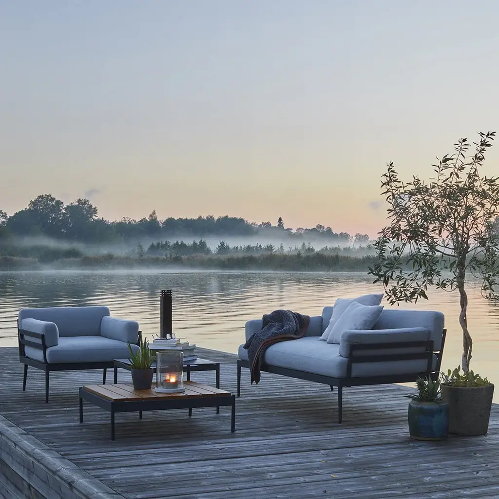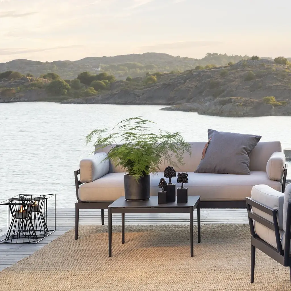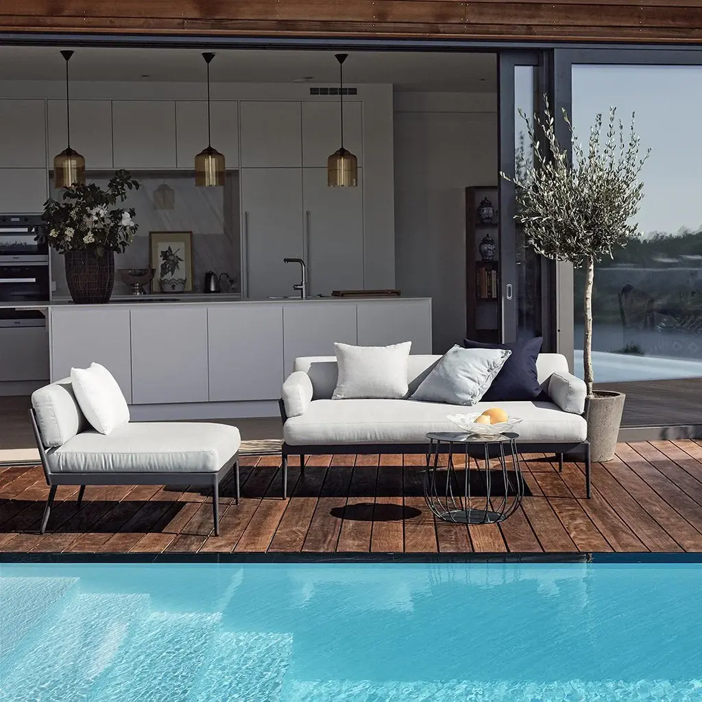 A range of modular lounge furniture, made of aluminum, with cushions in Sunbrella fabric covered outdoor high quality foam filling. Or, put another way, a range that looks good and is also maintenance-free.