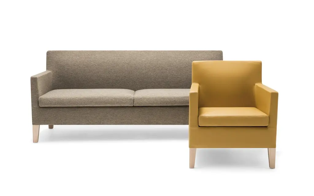 2-seater sofa with upholstered seat and backrest, and solid beech wood frame.The Anna family of seating, including Lounge, Easy Chair, Corporate and Luxe lines, share a same aesthetic language. Anna is an elegant option for lounge chairs, easy chairs and sofas made in solid beech wood and with eye catching upholstery. The design is offered in two different back heights.