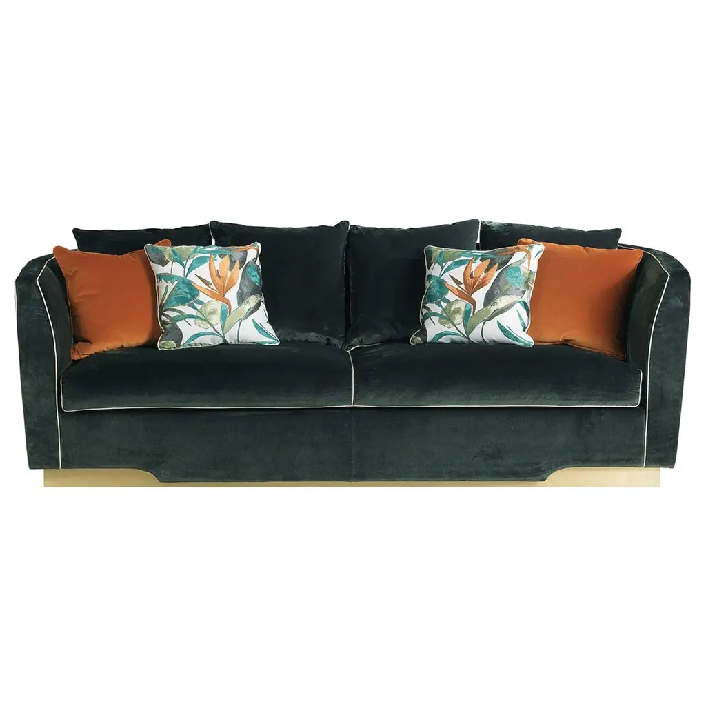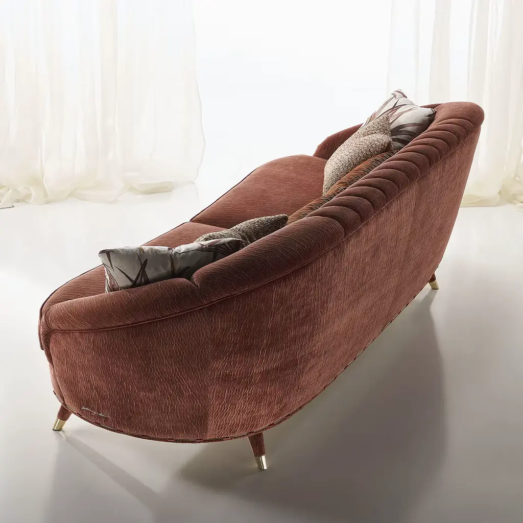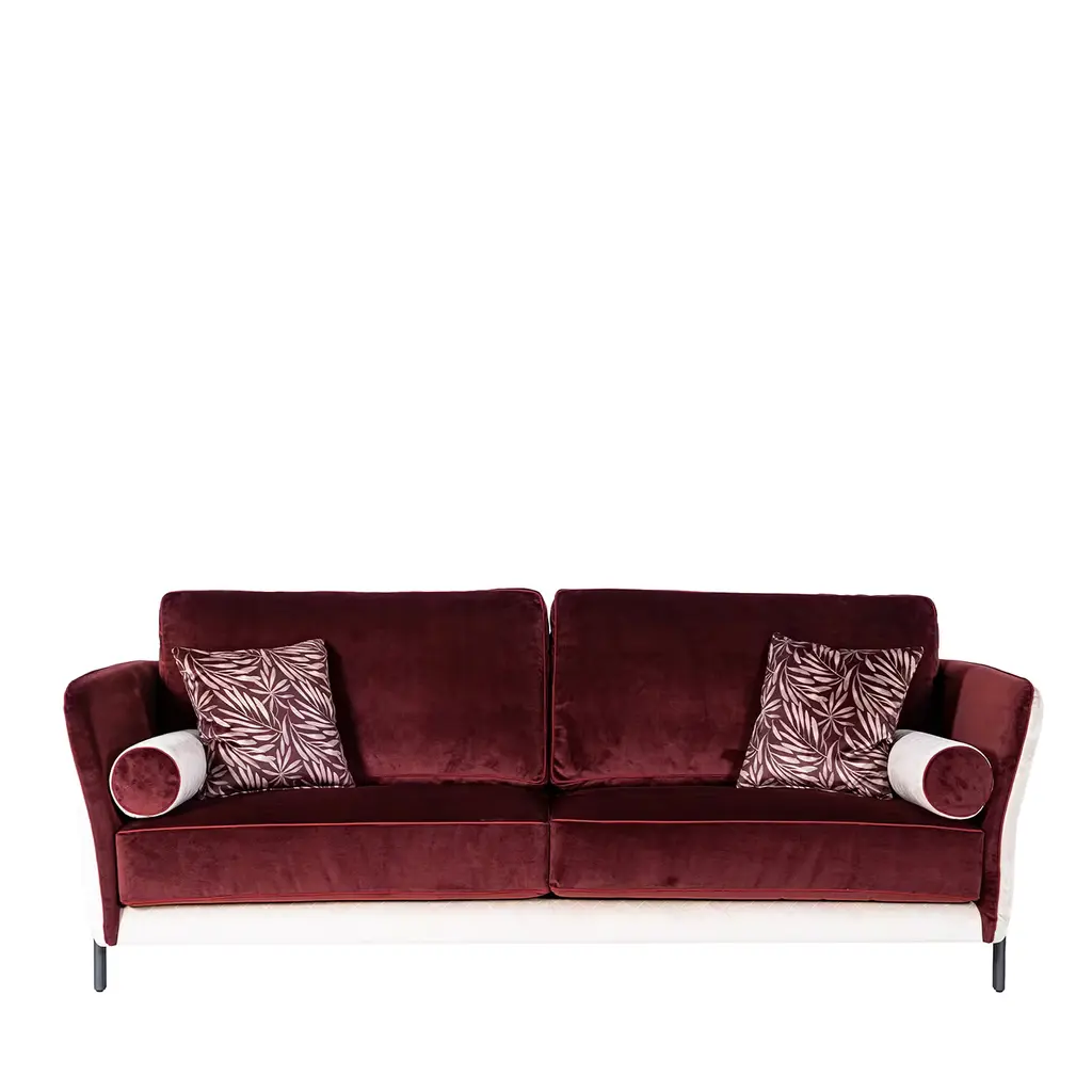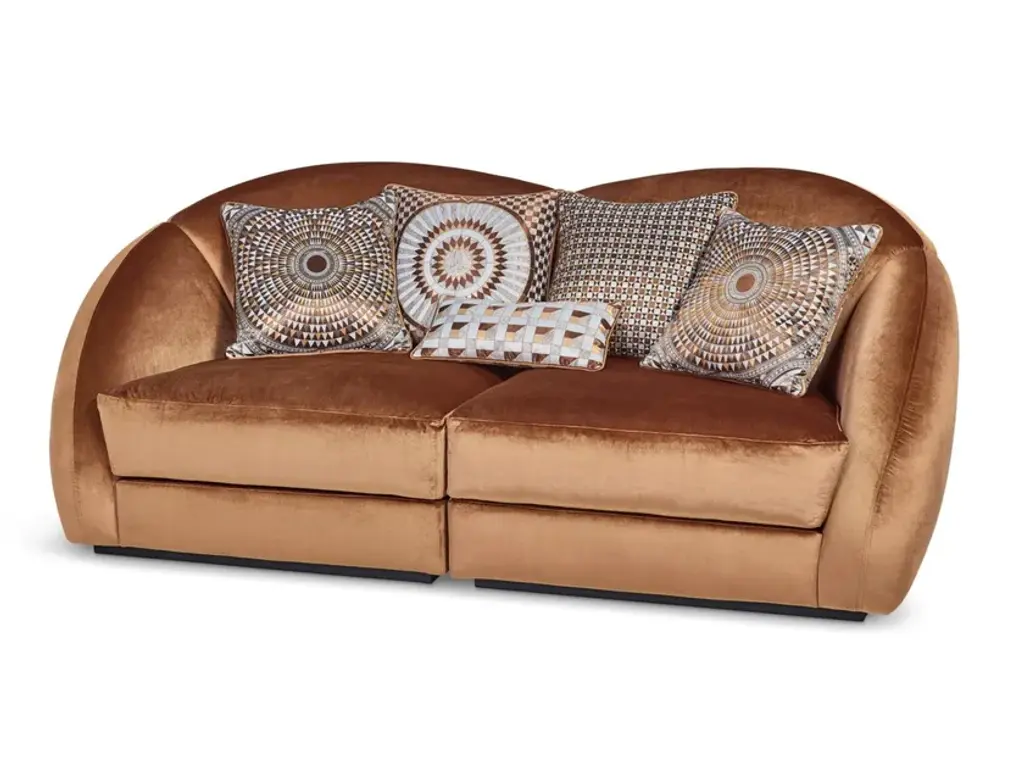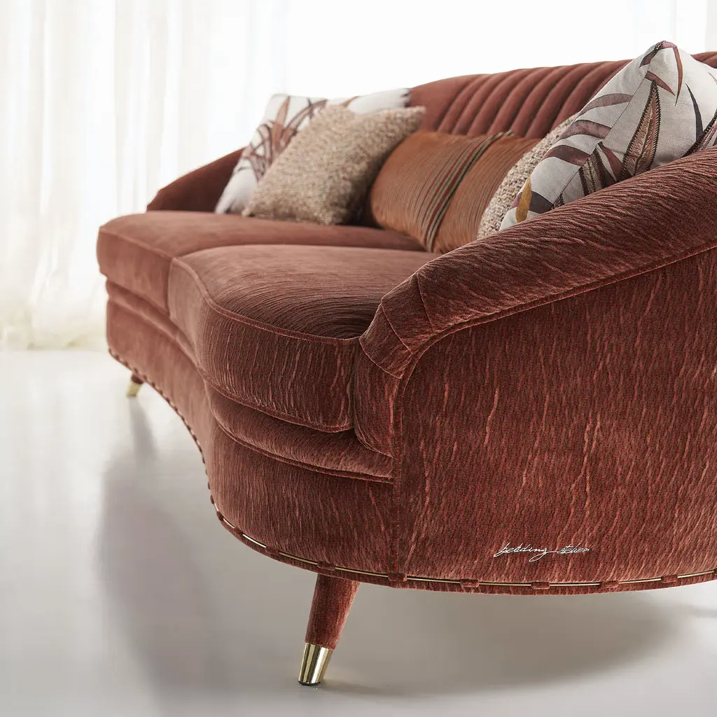 Sleek and harmonious profiles reveal this sofa's modern charm at first glance. Flaunting a warm rust-hued velvet cover that also extends to the slanted tapered feet with metal tips, the sofa ensures impeccable comfort with its generous polyurethane padding and sloped armrests. Accented with metal profiles along the base, it proves dynamic thanks to the backrest's channeled design.