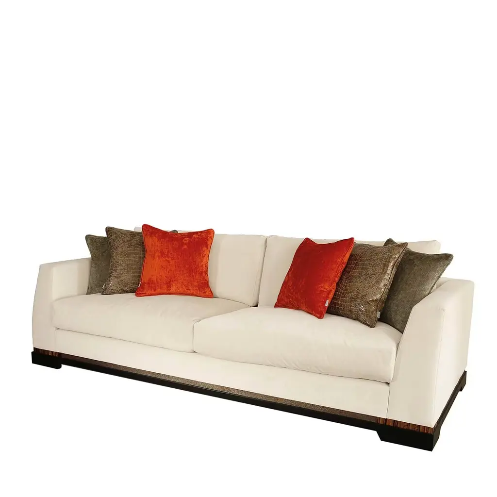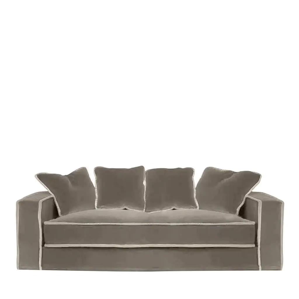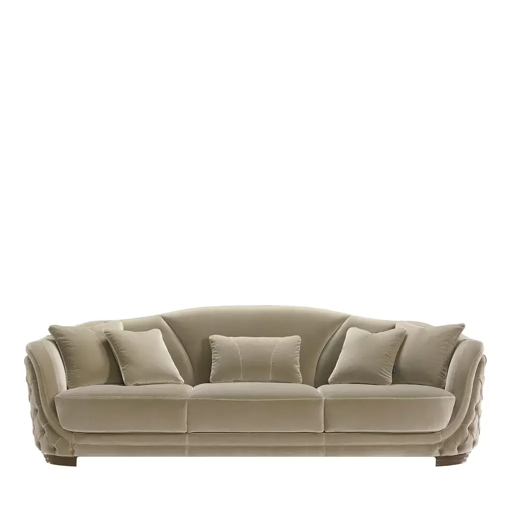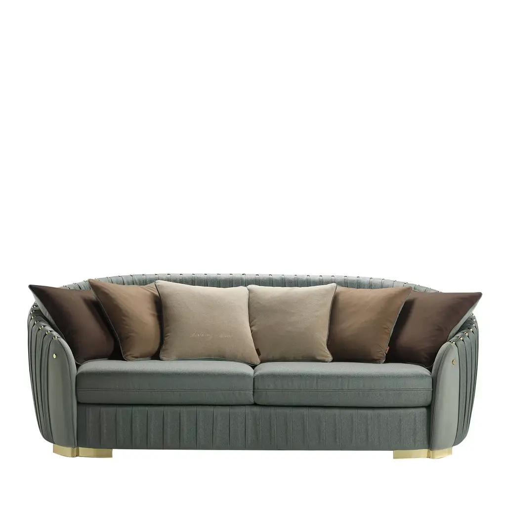 Sleek and harmonious profiles reveal this sofa's modern charm at first glance. Flaunting a warm rust-hued velvet cover that also extends to the slanted tapered feet with metal tips, the sofa ensures impeccable comfort with its generous polyurethane padding and sloped armrests. Accented with metal profiles along the base, it proves dynamic thanks to the backrest's channeled design.